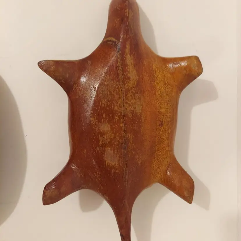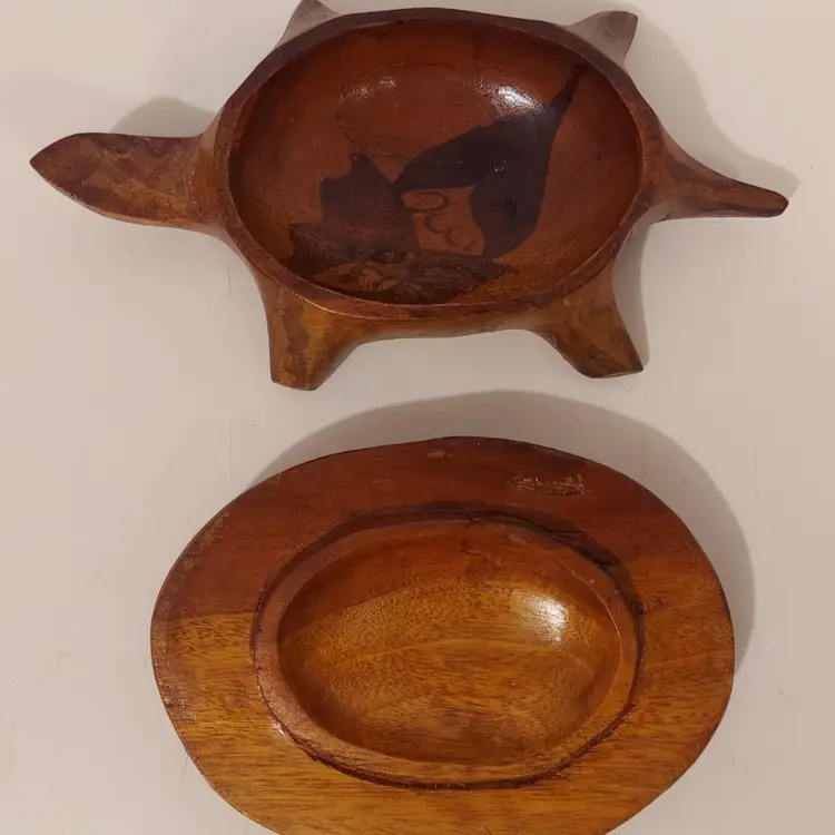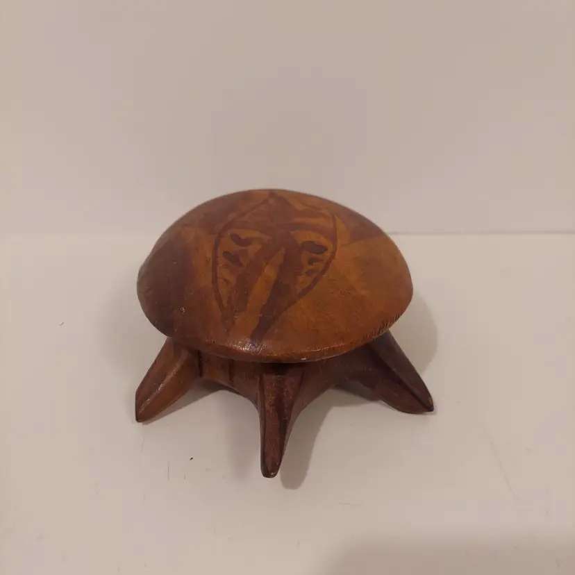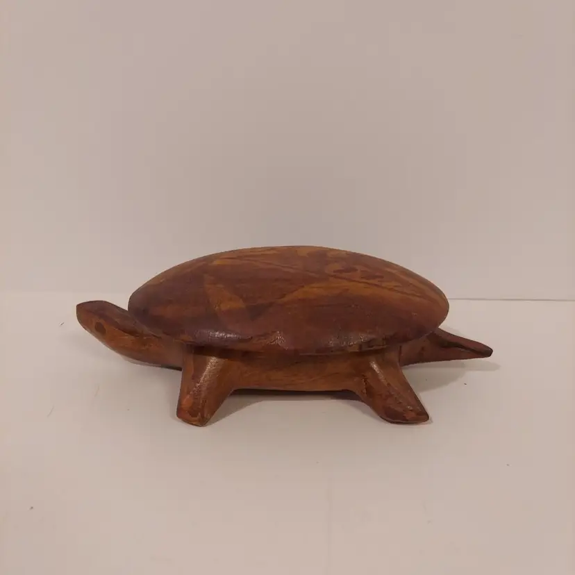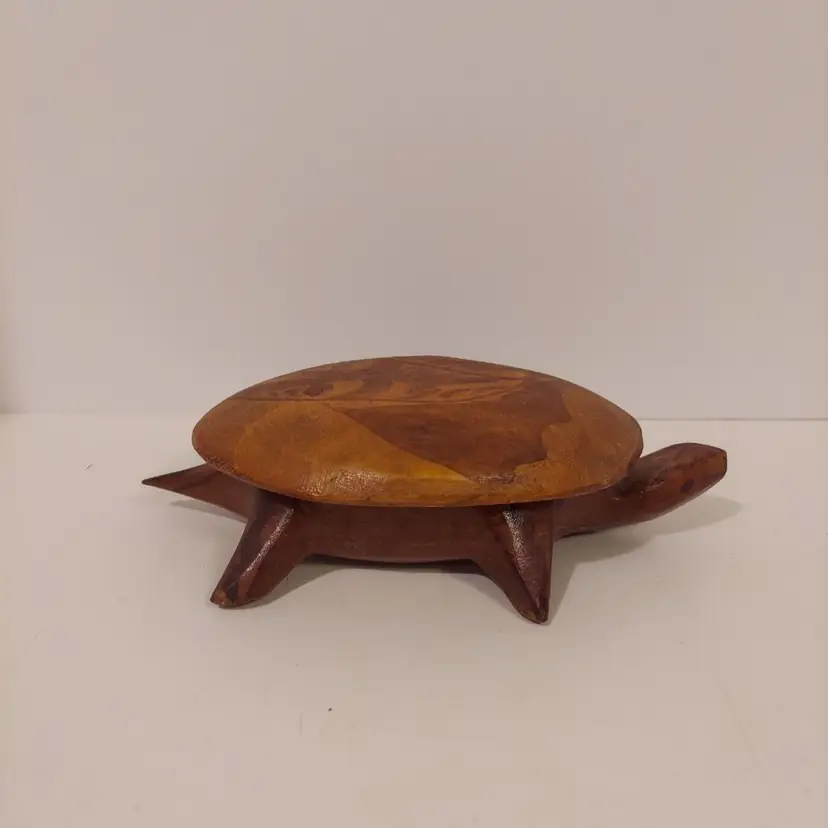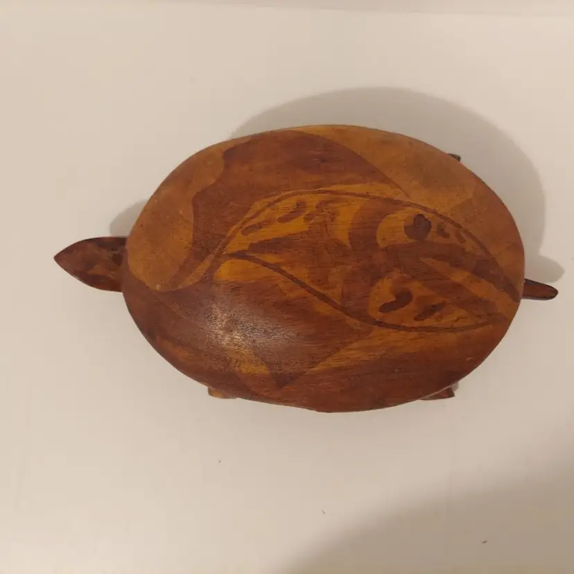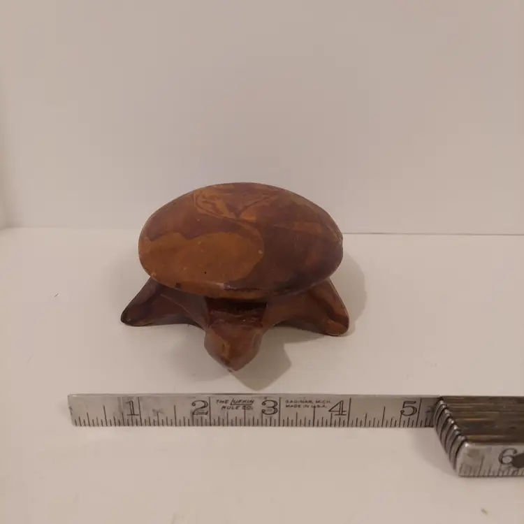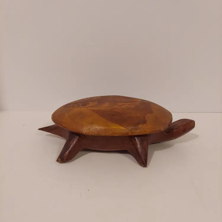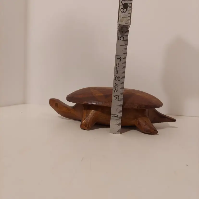 This sweet little turtle trinket box is nicely carved from wood and has hand painted stained decorations. It measures approximately 8×2.5×4 inches. There are signs of wear but no major chips or cracks, please see photos.