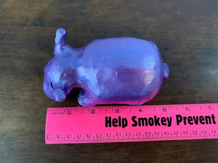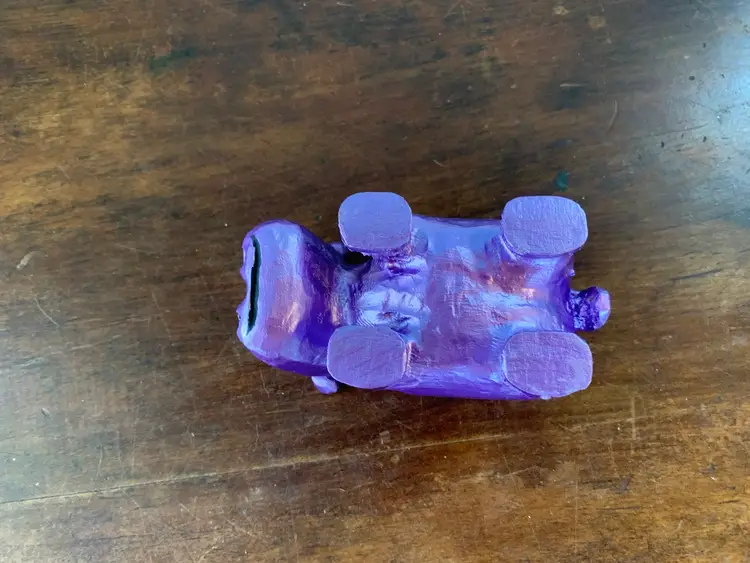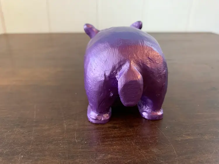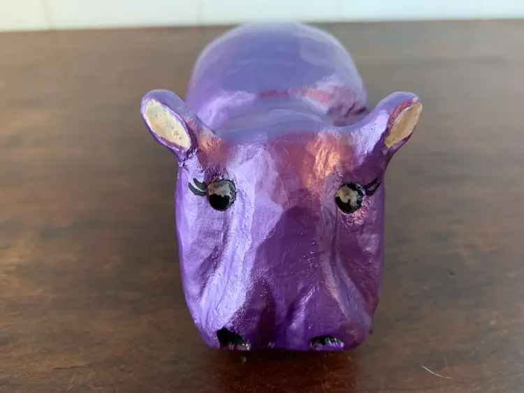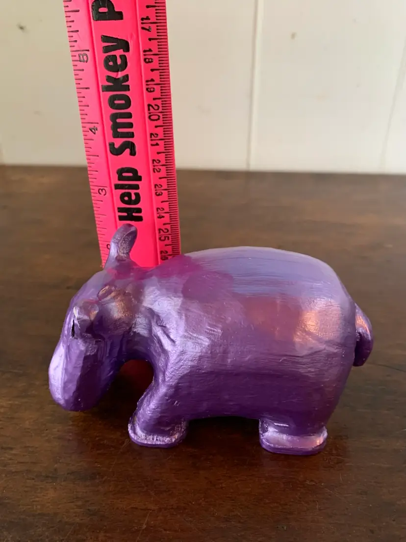 This cute little hand carved wooden hippo was originally a drab brown and crudely painted. I decided she needed a glow-up, so I painted her metallic purple and gave her some long eyelashes. Now she just needs to be the mascot of a new to her home! Yours maybe?? She’s about 5” long and almost 2 1/2” tall at the tips of her ears.