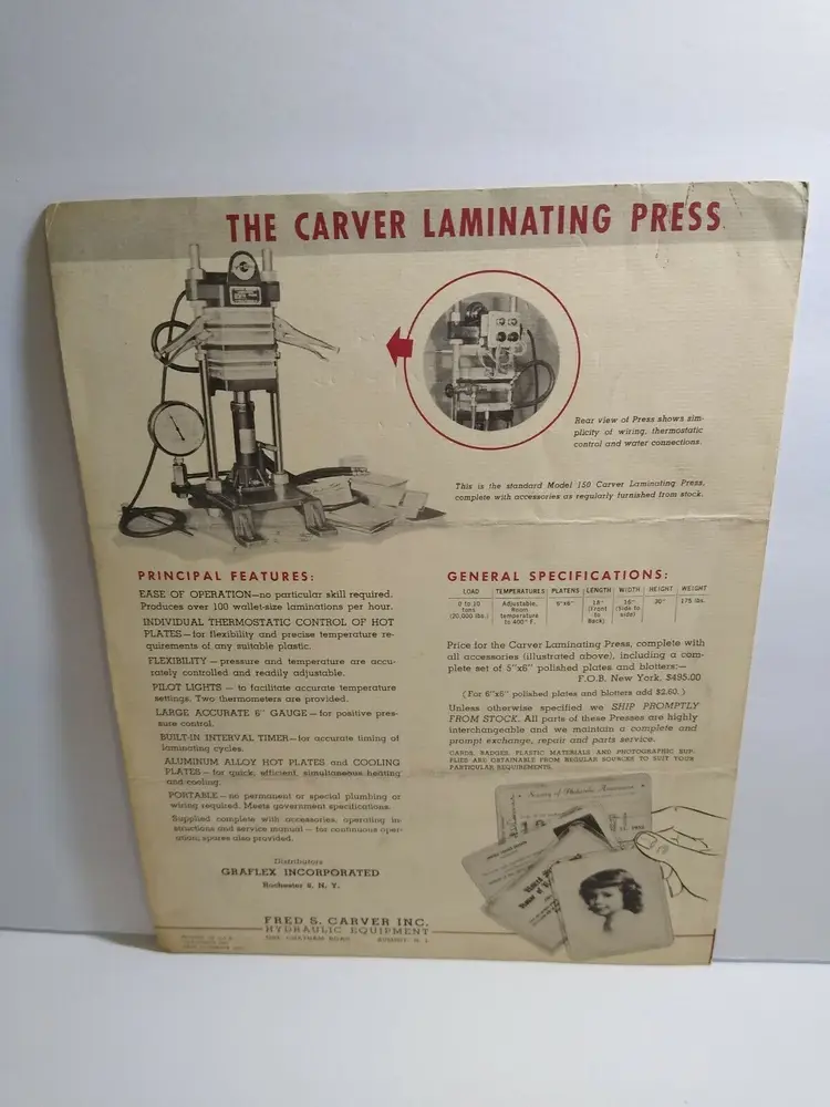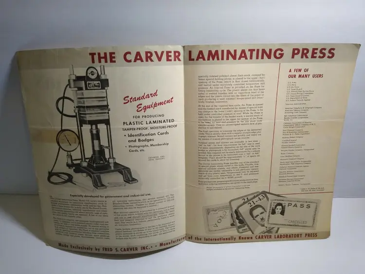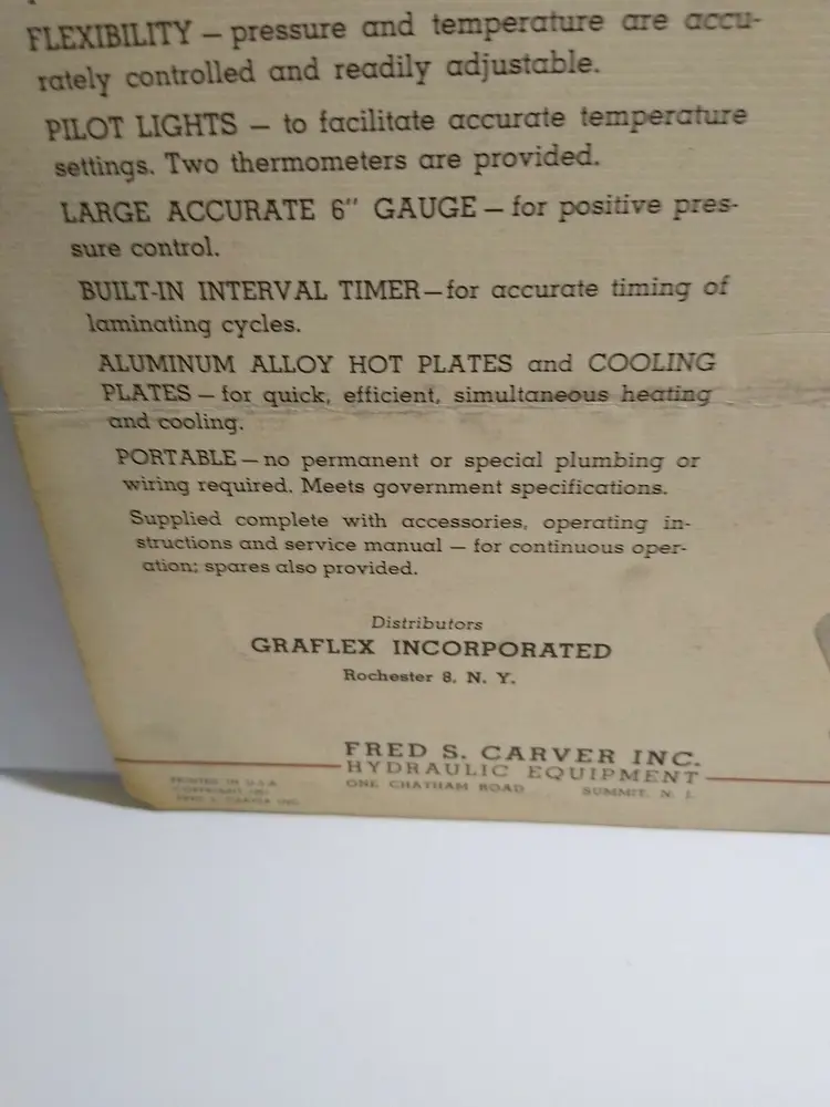 Modified Item: No Country/Region of Manufacture: United States Time Period Manufactured: 1940-59 Company: Fred S. Carver Inc. Subject: Laminating Press