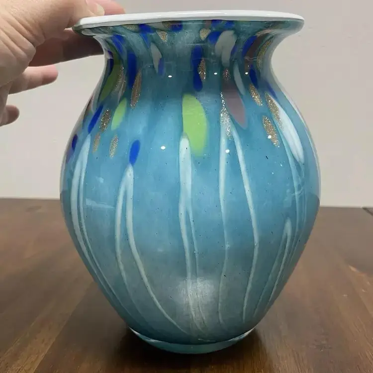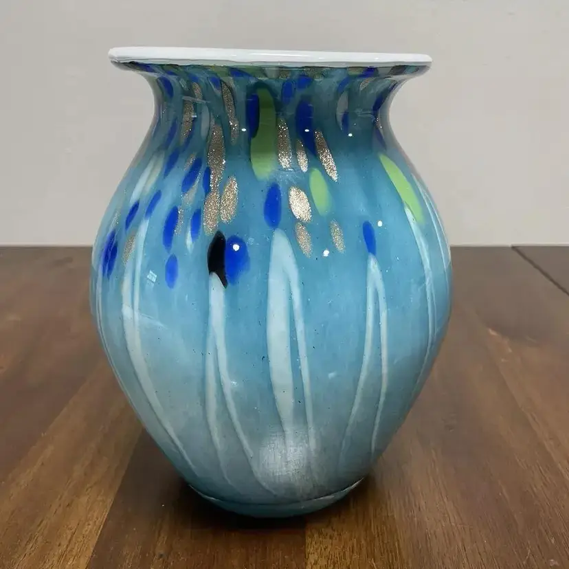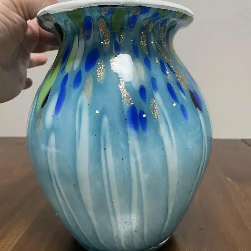 Beautiful cased glass confetti style art glass vase. Used; excellent condition with no chips or cracks. 8 inches tall.