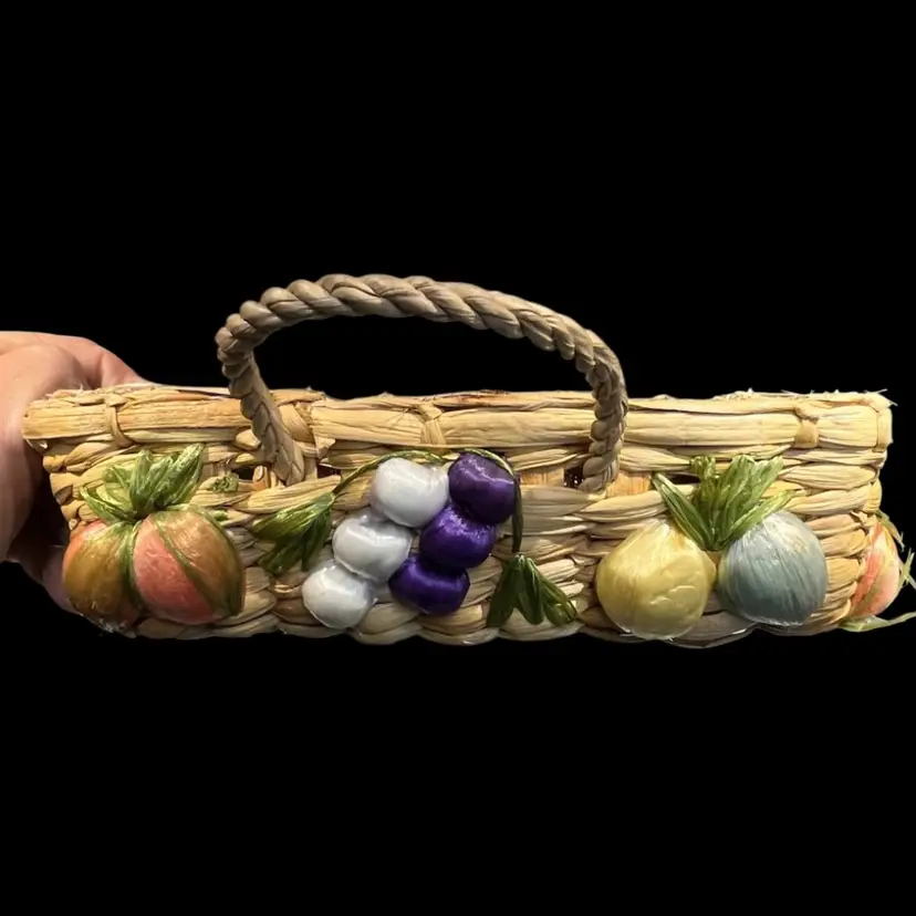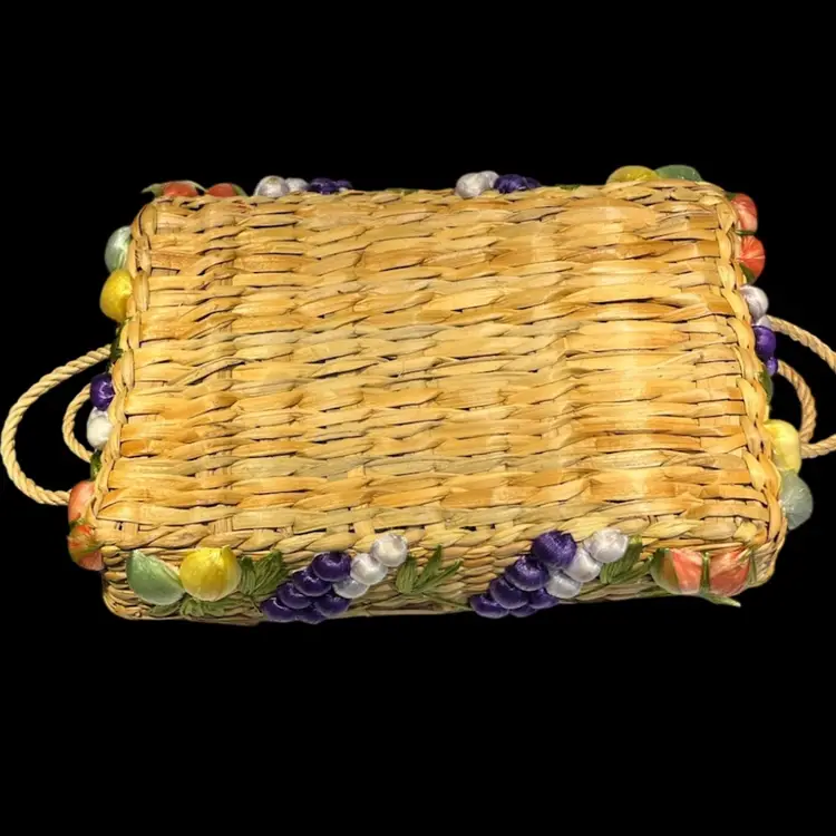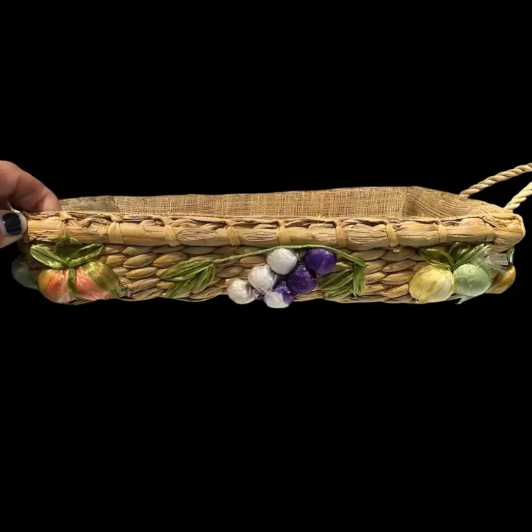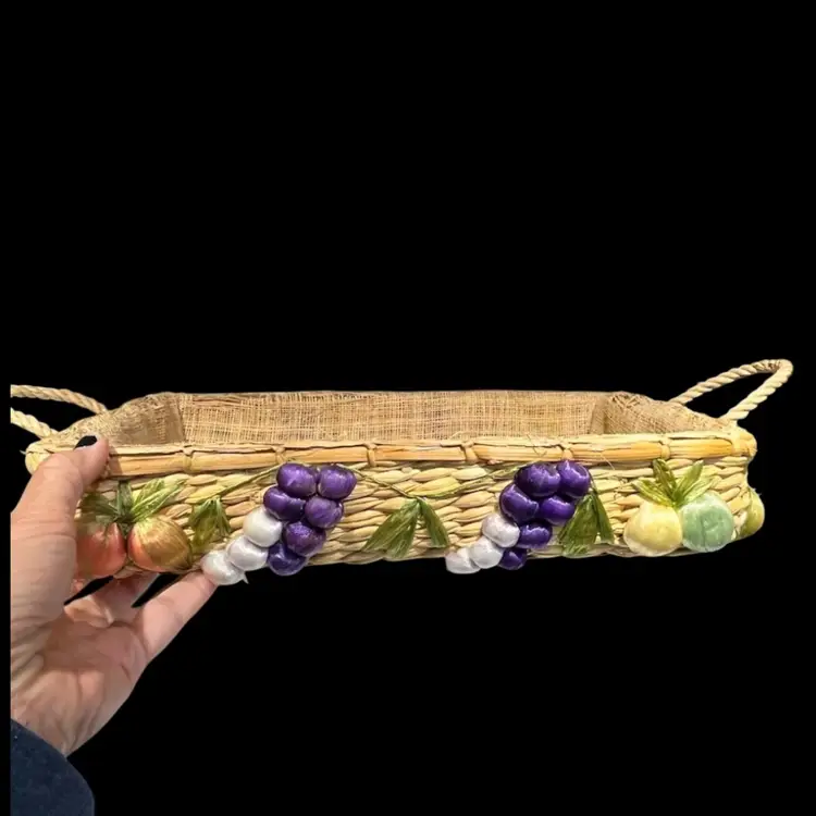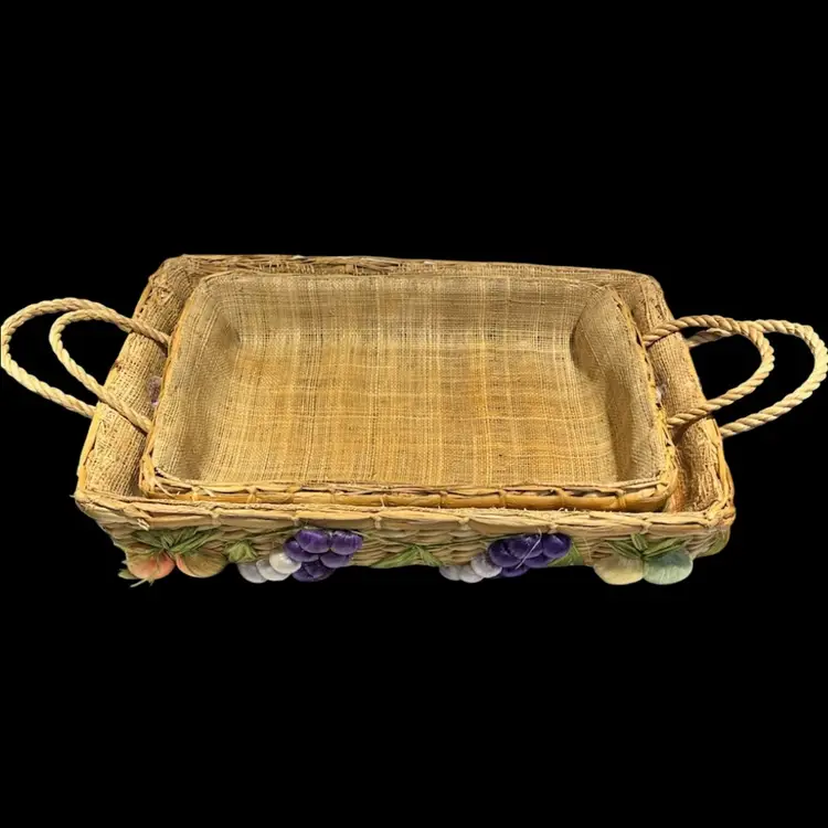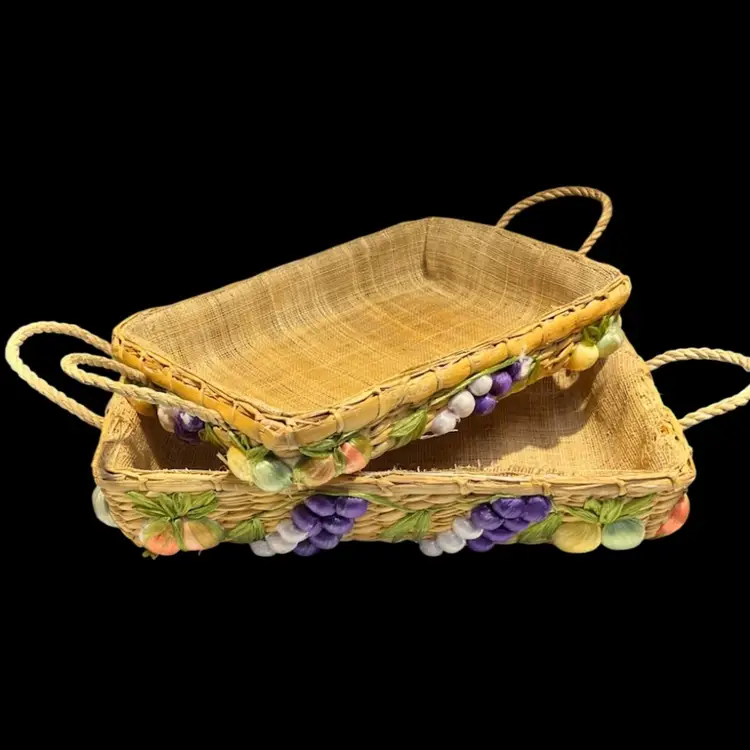 Great vintage condition. A grape on the smaller basket has lost some of the purple raffia covering.