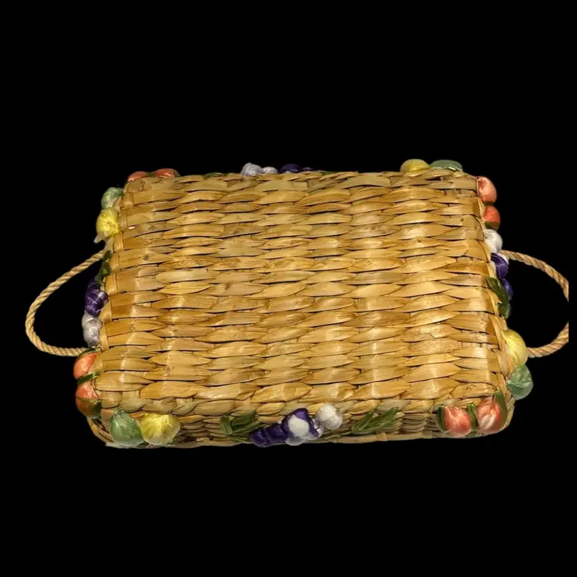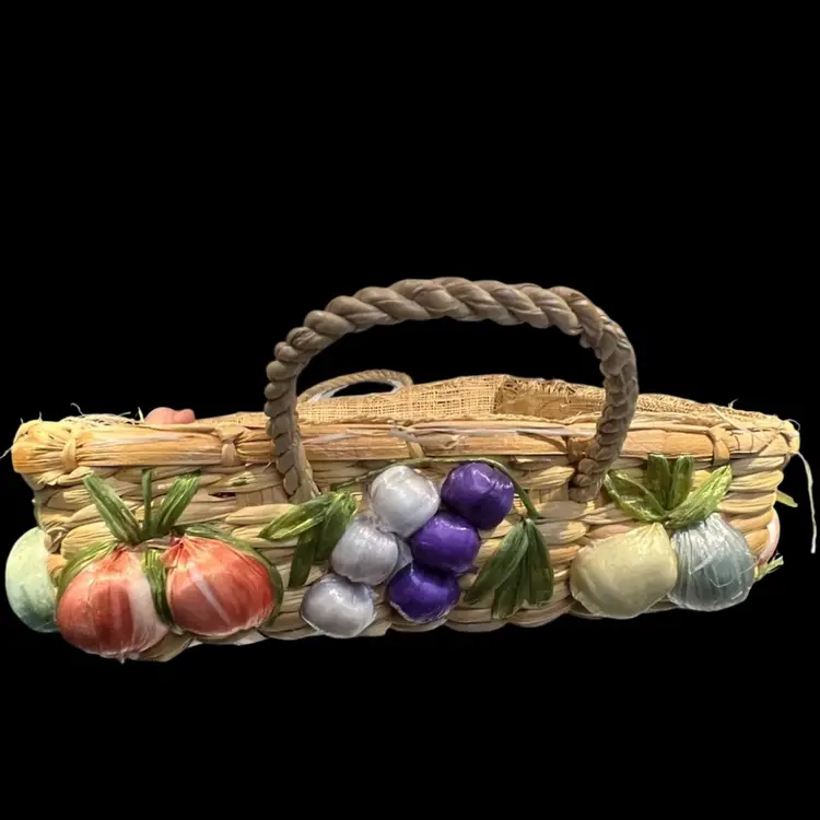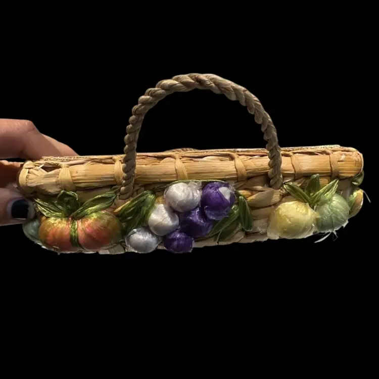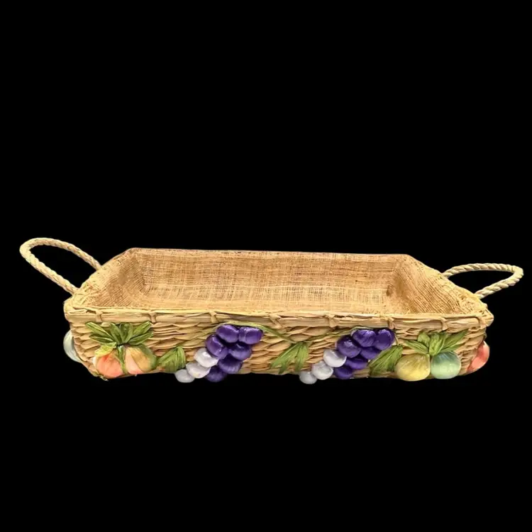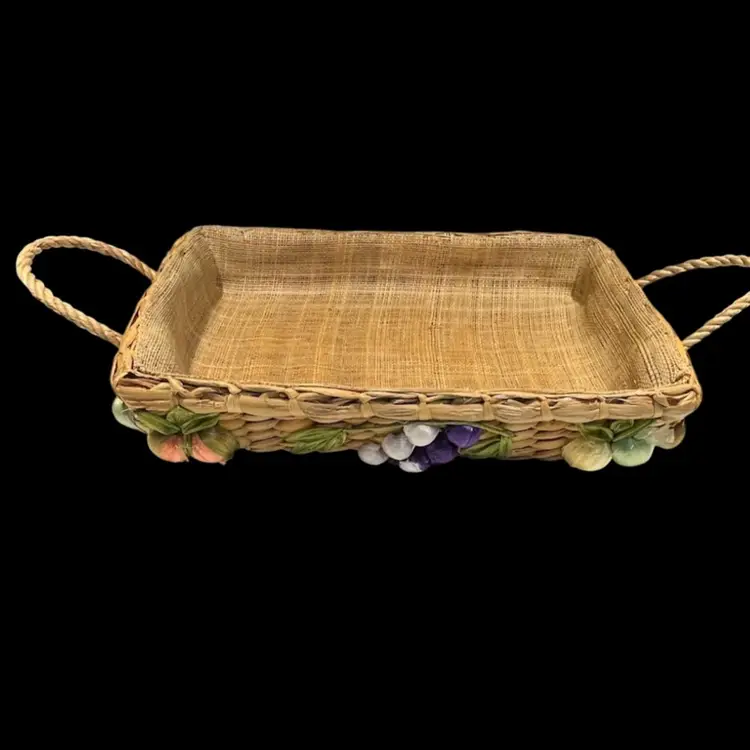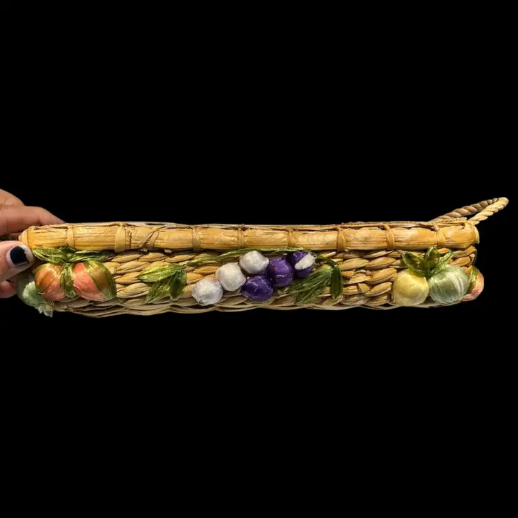Great vintage condition. A grape on the smaller basket has lost some of the purple raffia covering.