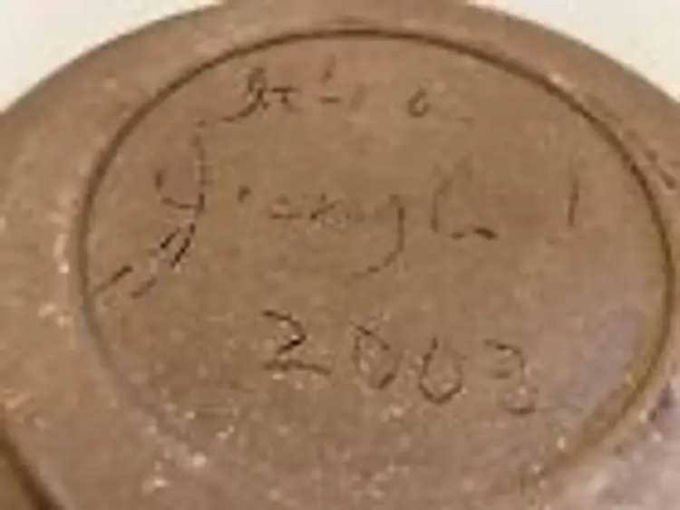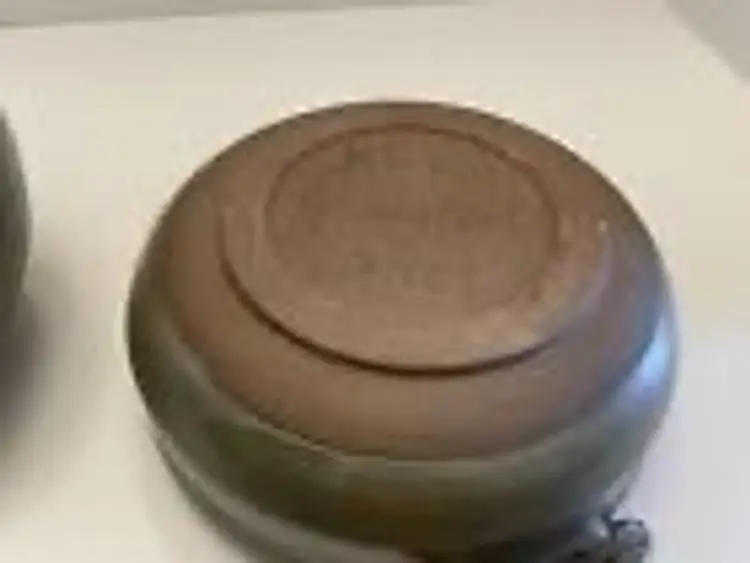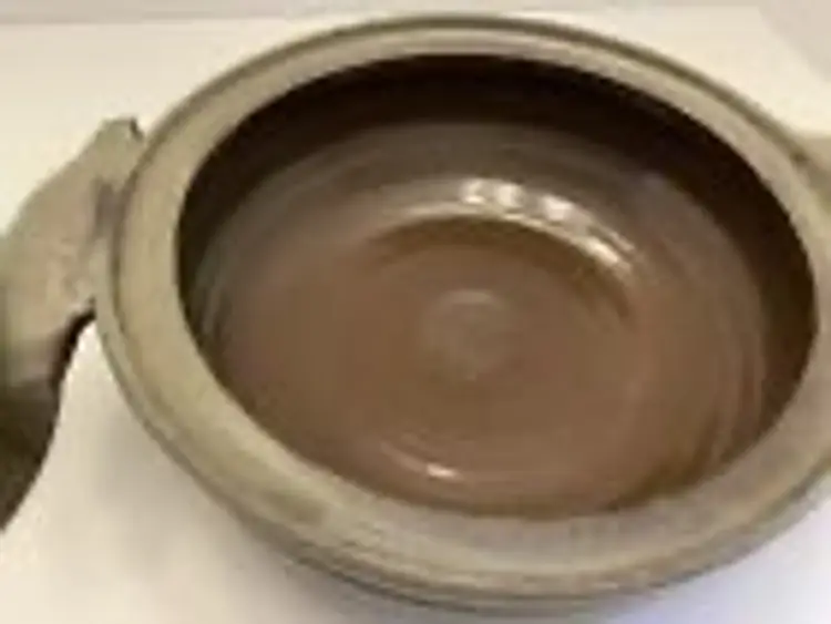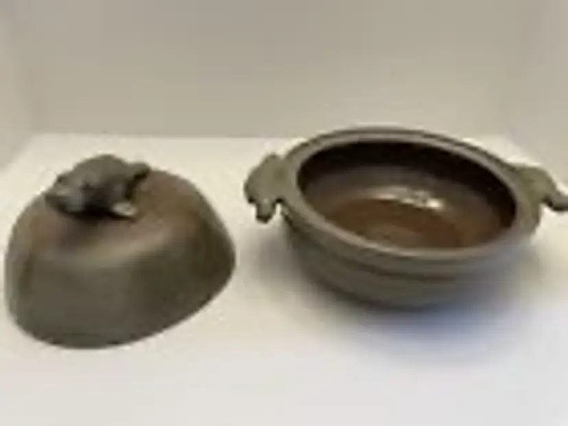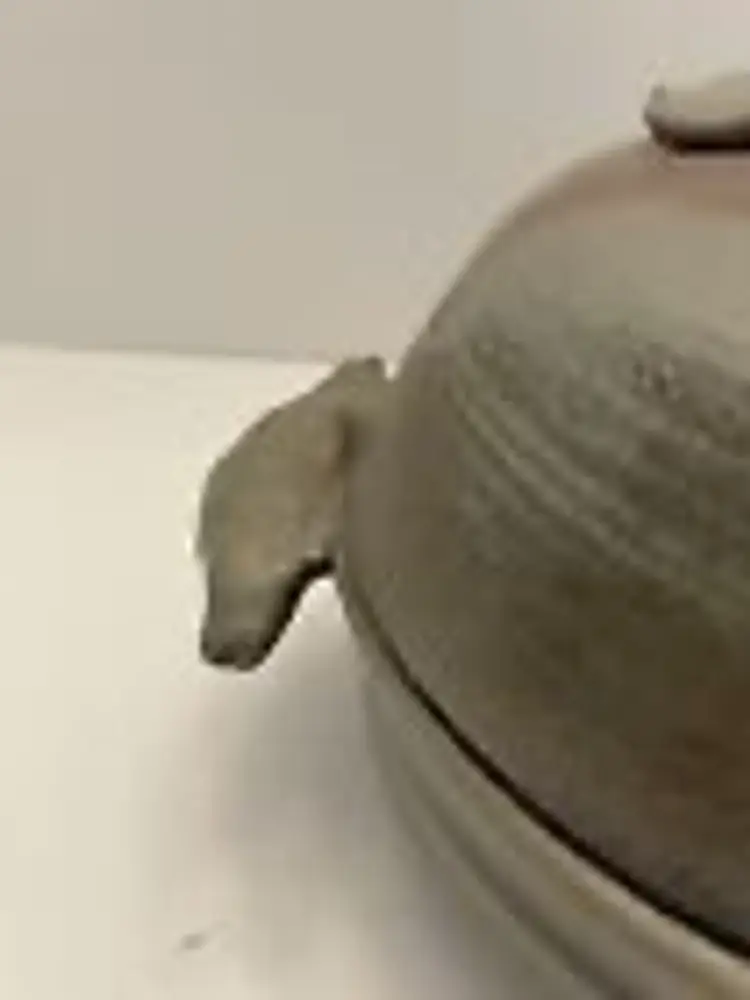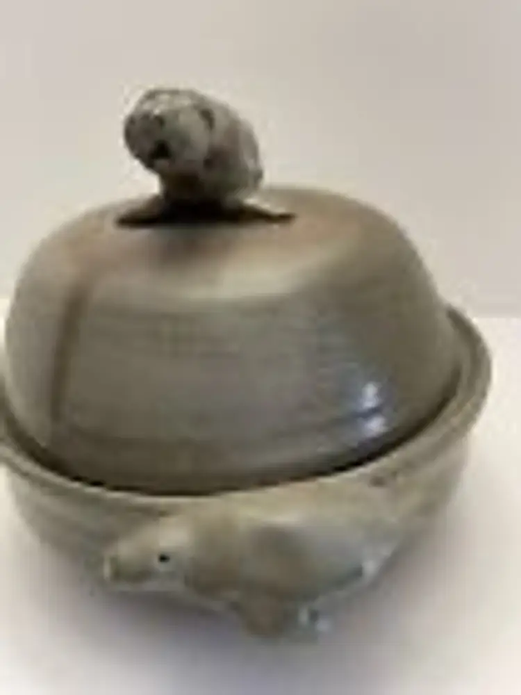 This listing is for a pottery casserole dish - measures 7 3/4 inches across and is about 7 inches tall. Has a manatee on top and one on each side as handles. Dish is signed 2003 and says, It's a J???. I cannot read the artists' name. I was told by the person I purchased this from that they purchased it in Berea, Kentucky. Very nice piece. And heavy!