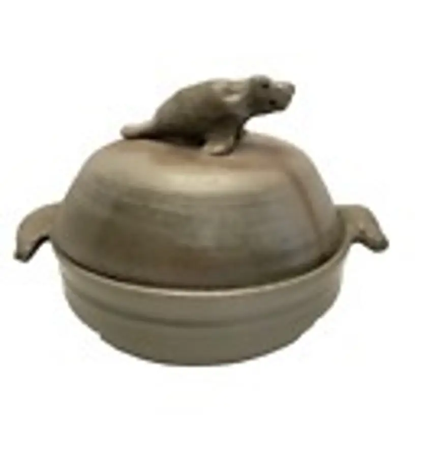 This exquisite covered dish is a true masterpiece that will add charm and elegance to your dining decor. Crafted by a talented artisan from high-quality clay, this original piece features a unique design of a playful manatee with a lid that perfectly fits to keep your food warm and fresh. The beautiful green and brown color combination and the intricate production technique used to make this dish make it a perfect addition to any pottery collection. The dish is from a renowned art studio that specializes in pottery, and it was manufactured in 2003. It is an original and licensed reproduction that showcases the studio's exceptional craftsmanship and attention to detail. Whether you're looking for a functional casserole dish or a decorative item to display in your home, this manatee-covered dish is sure to impress.