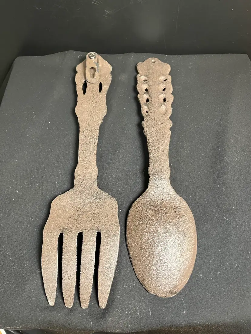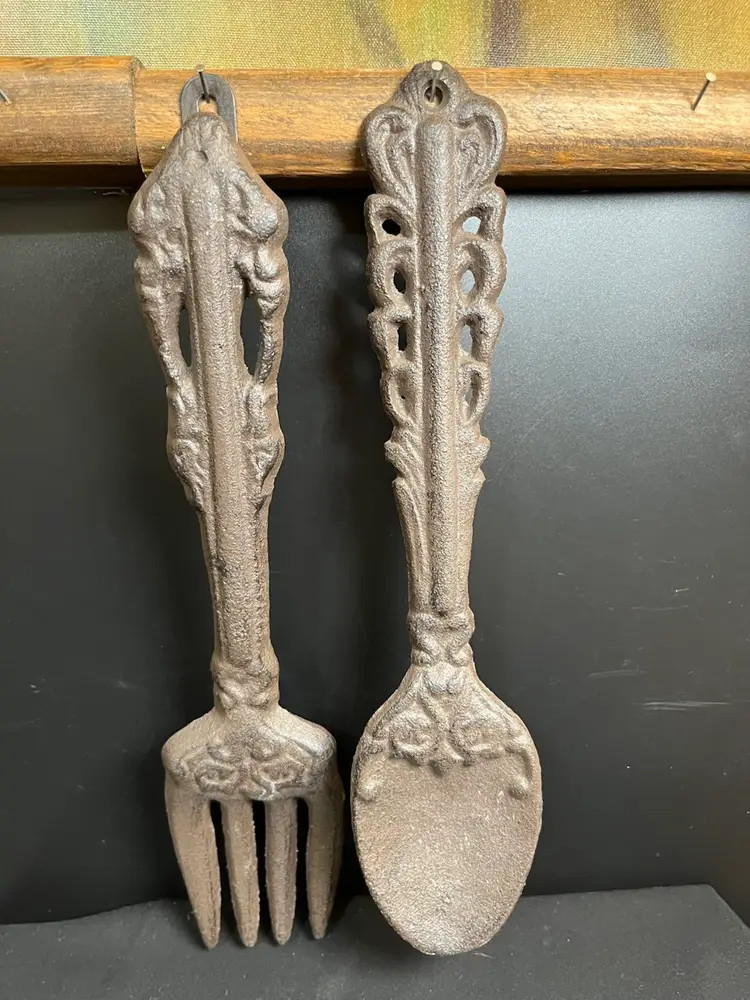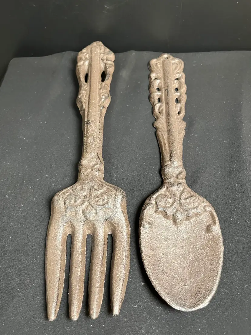 Are in good vintage condition. Fork measures approx 11" H, Spoon approx 10.5"H, Together weigh approx 1 Lb 13 Oz