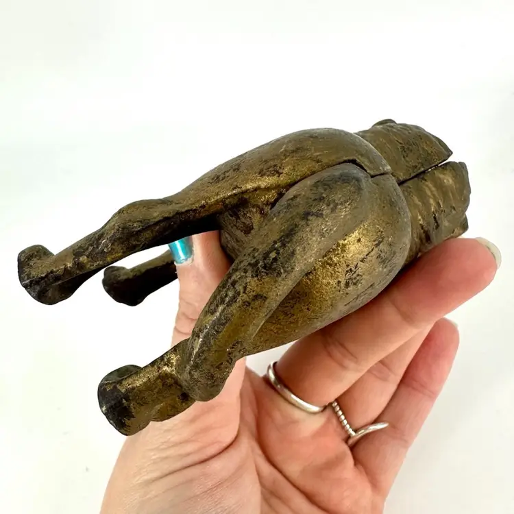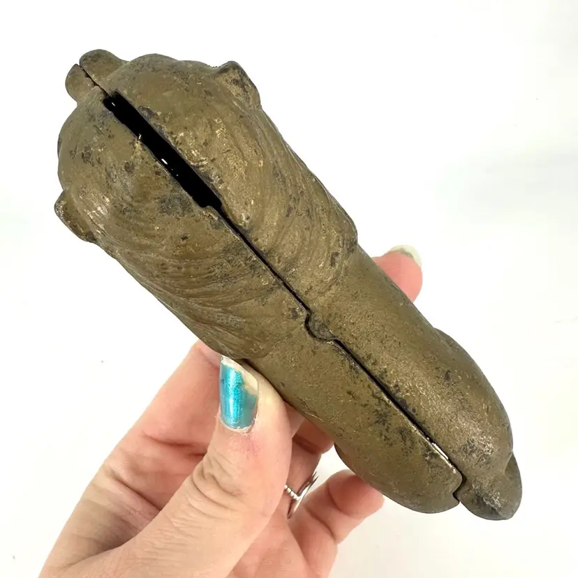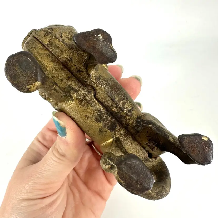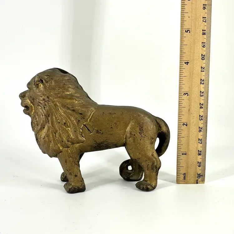This cast iron lion coin bank is approximately 5.5” in length and 4” in height. There are no chips or cracks. Does have some wear on the gold paint on top of cast iron as well as some rusting spots, which can be seen in photos. Not signed or marked anywhere.