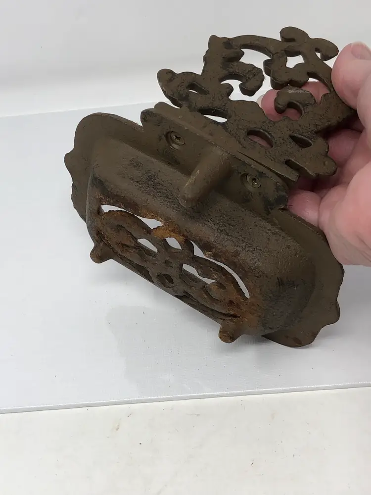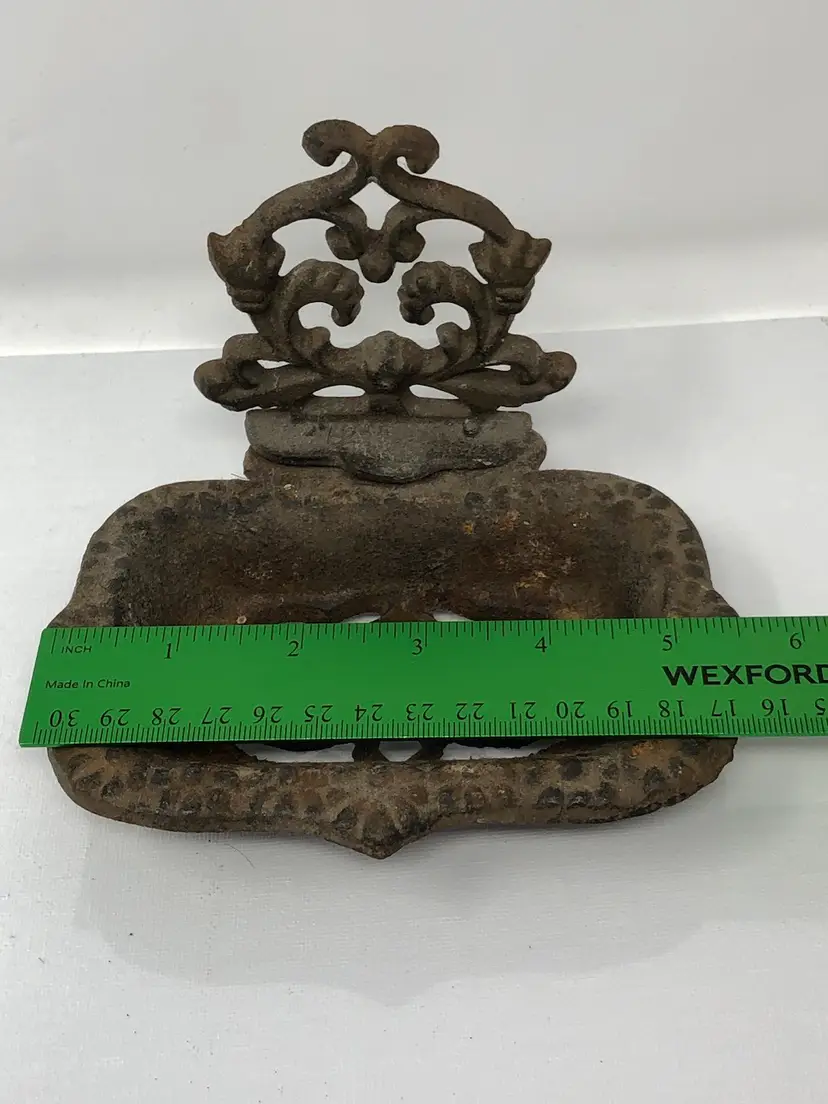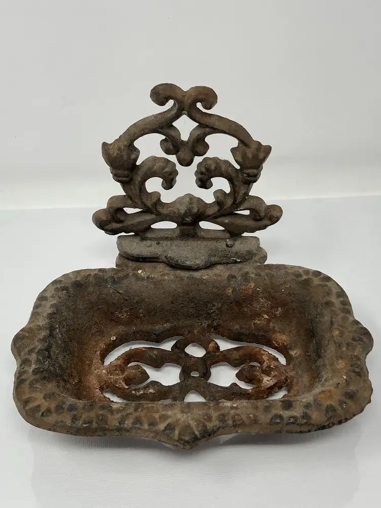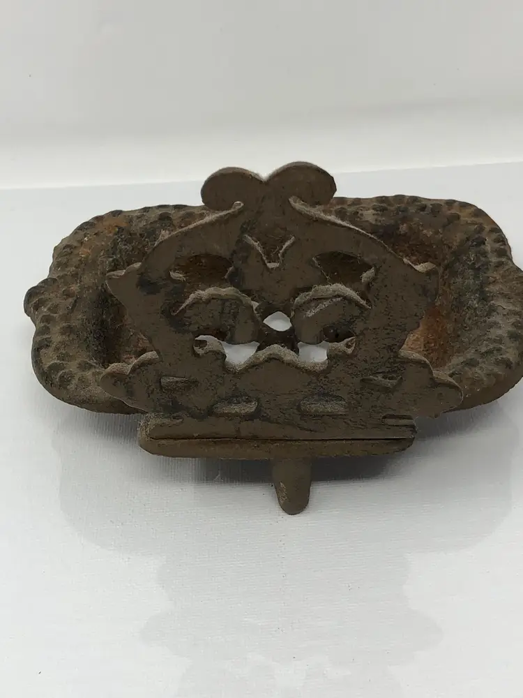 6" rusty crusty iron soap dish with decorative scrollwork pattern. 2-piece, back attached with screws, 3 raised feet on the bottom.