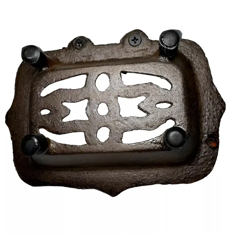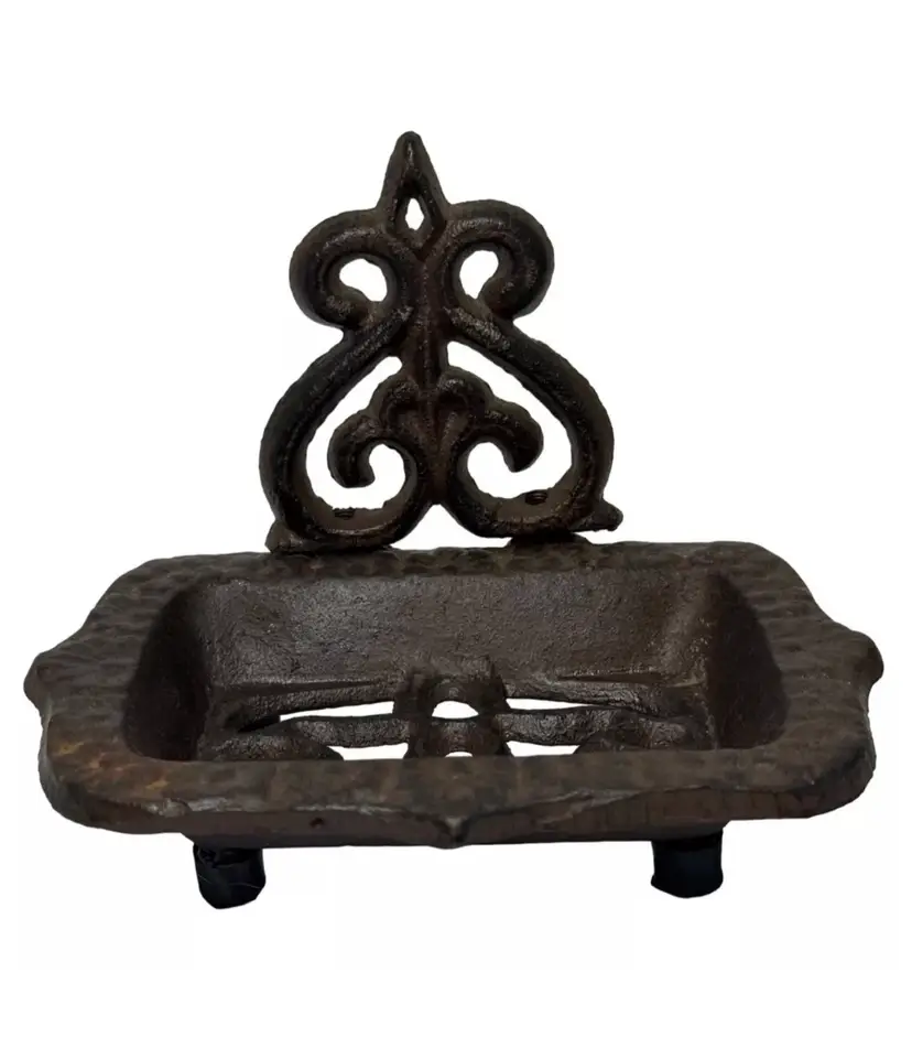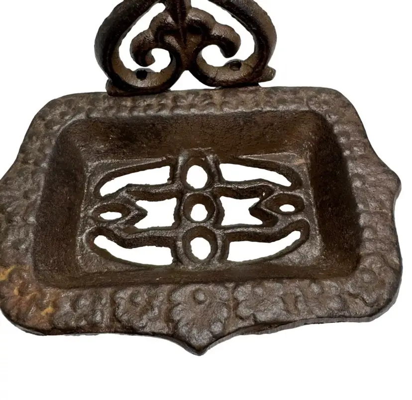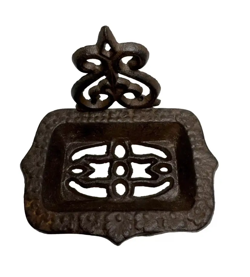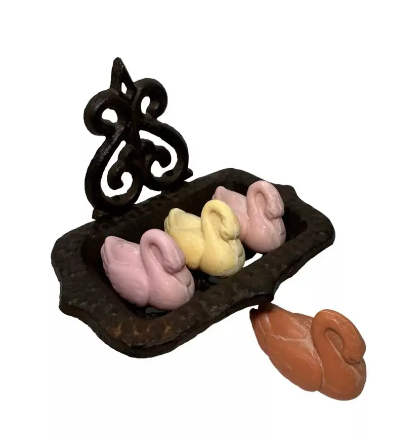 Features: • Bonus 4 swan vintage soaps, 2 pink, 1 yellow, 1 brownish orange. • Heavy cast iron with slots for water to drip off soap. • All Occasions • Pattern around rim is daisies. • Made in United States • Keep clean from built up soap.