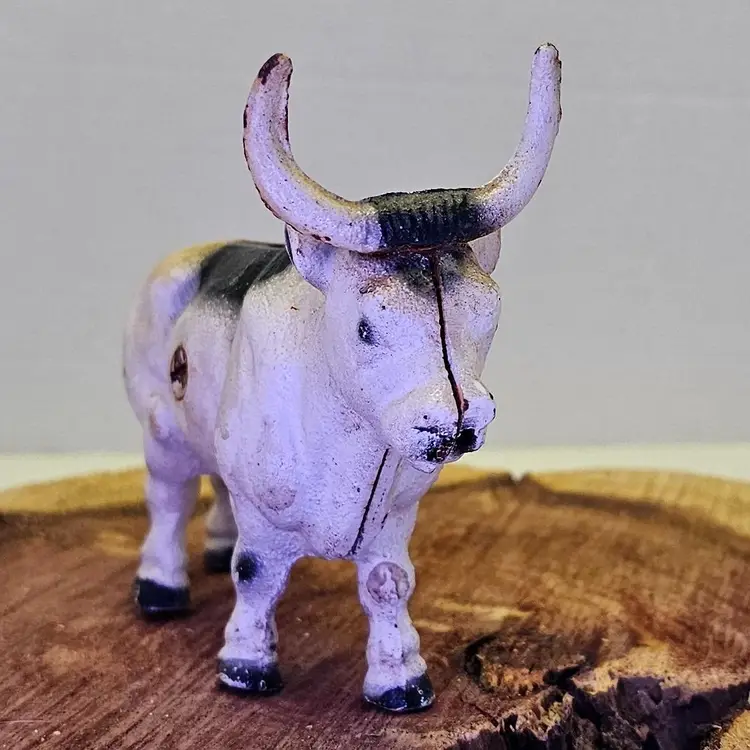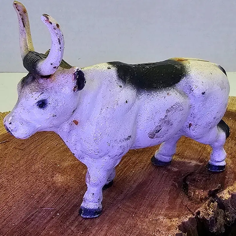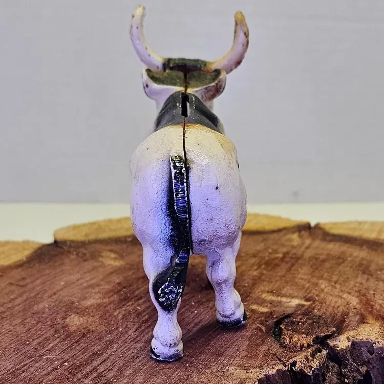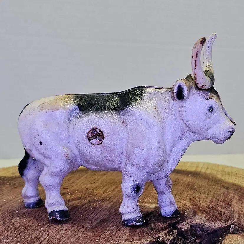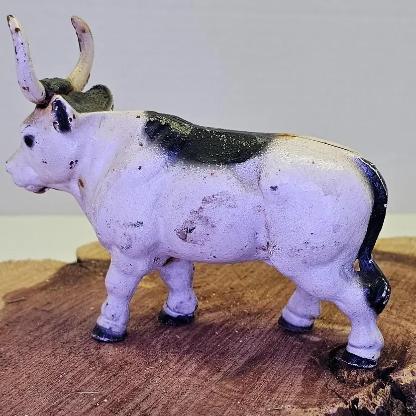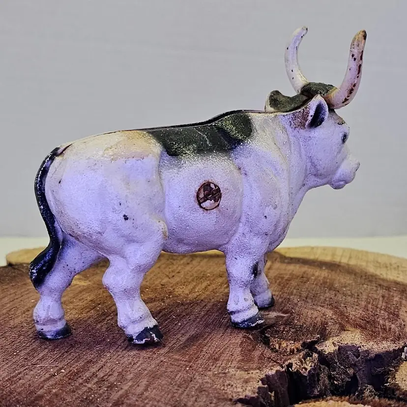 I have done a lot of research on this bank and it appears to be antique. Circa 1920's. I also believe it to be John Wright. I am able to verify this has many of the attributes of his cast iron banks, but can not find this actual bank. The steer is black on white, with all the patina and wear of history, in tact. This bank has a slot in the top and opens with a screw on the side. This is such a cool item. The details in the way the muscle and skin hang around the various parts of the steer are incredible. I live in Texas and get to see these broad chested beauties quite often. Make sure to check out the photos for a good look at the condition and history. I understand that he has a purple tint in a few photos. This evidently is a screen image issue. If you look to the photos with the ruler, you can see more of his true color. Thank you for supporting Beetle's Rucksack.