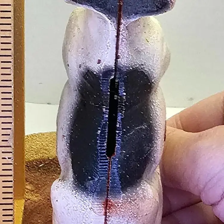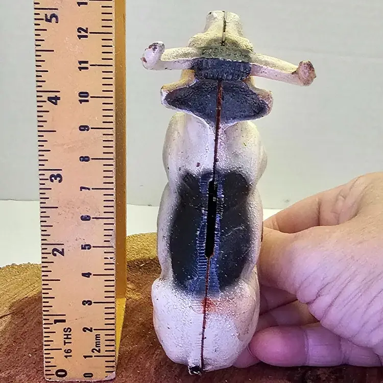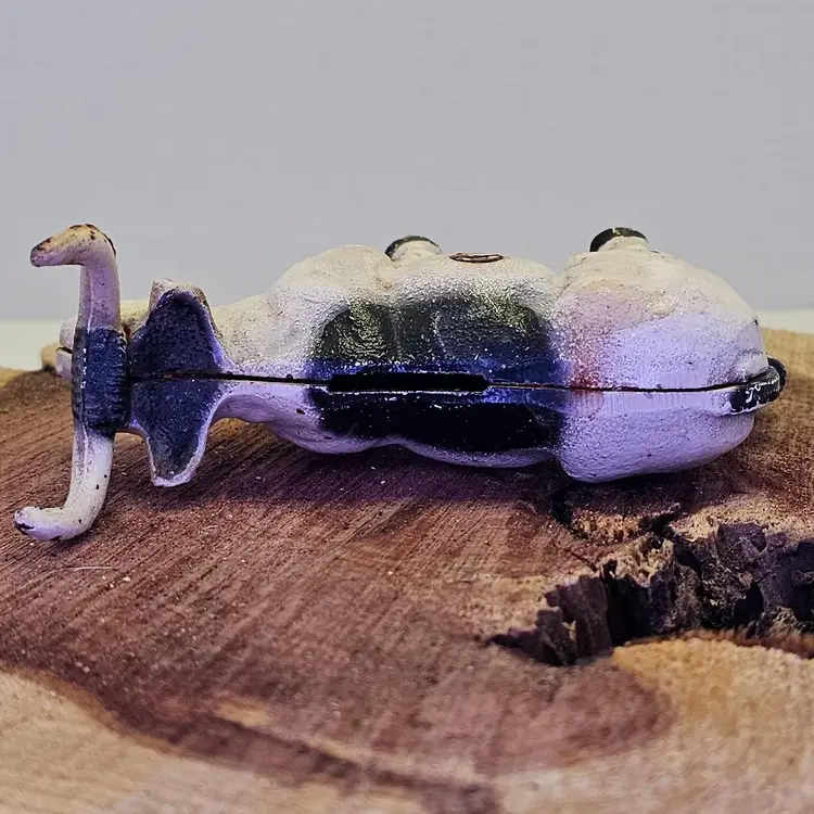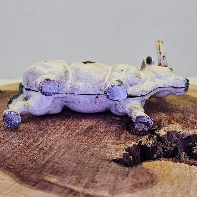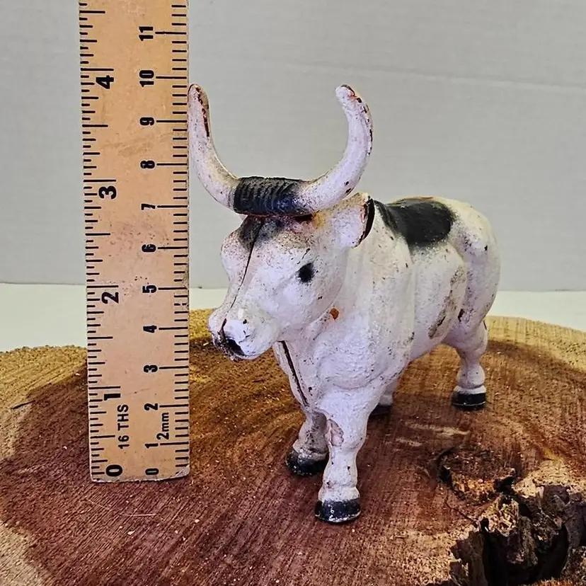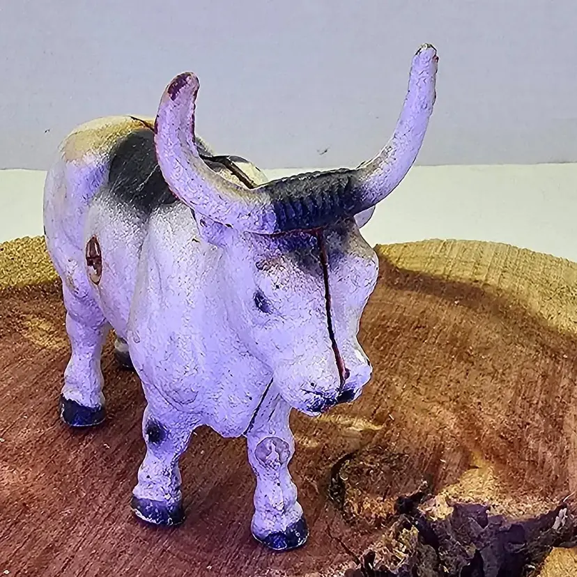I have done a lot of research on this bank and it appears to be antique. Circa 1920's. I also believe it to be John Wright. I am able to verify this has many of the attributes of his cast iron banks, but can not find this actual bank. The steer is black on white, with all the patina and wear of history, in tact. This bank has a slot in the top and opens with a screw on the side. This is such a cool item. The details in the way the muscle and skin hang around the various parts of the steer are incredible. I live in Texas and get to see these broad chested beauties quite often. Make sure to check out the photos for a good look at the condition and history. I understand that he has a purple tint in a few photos. This evidently is a screen image issue. If you look to the photos with the ruler, you can see more of his true color. Thank you for supporting Beetle's Rucksack.