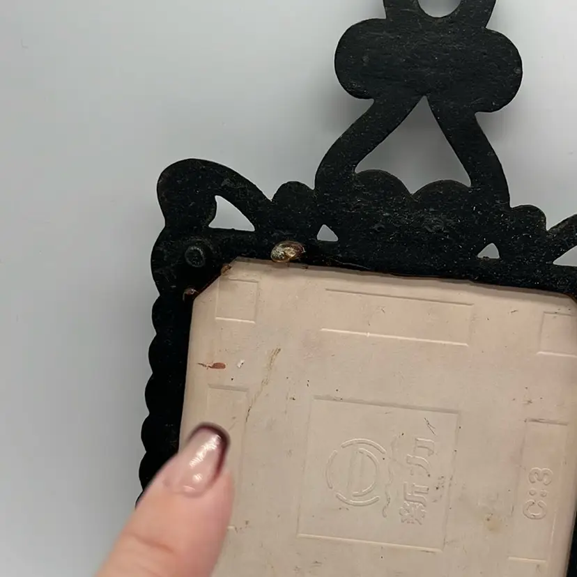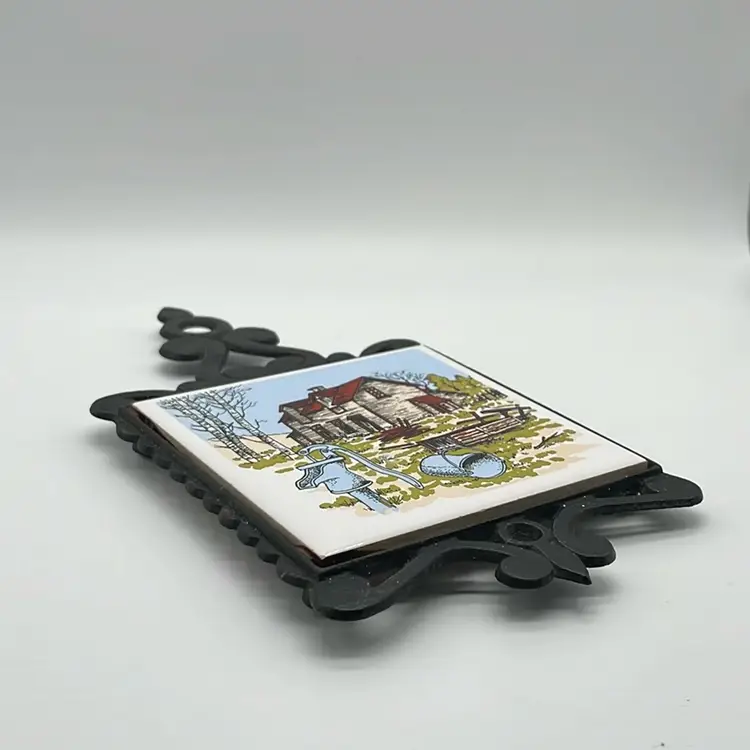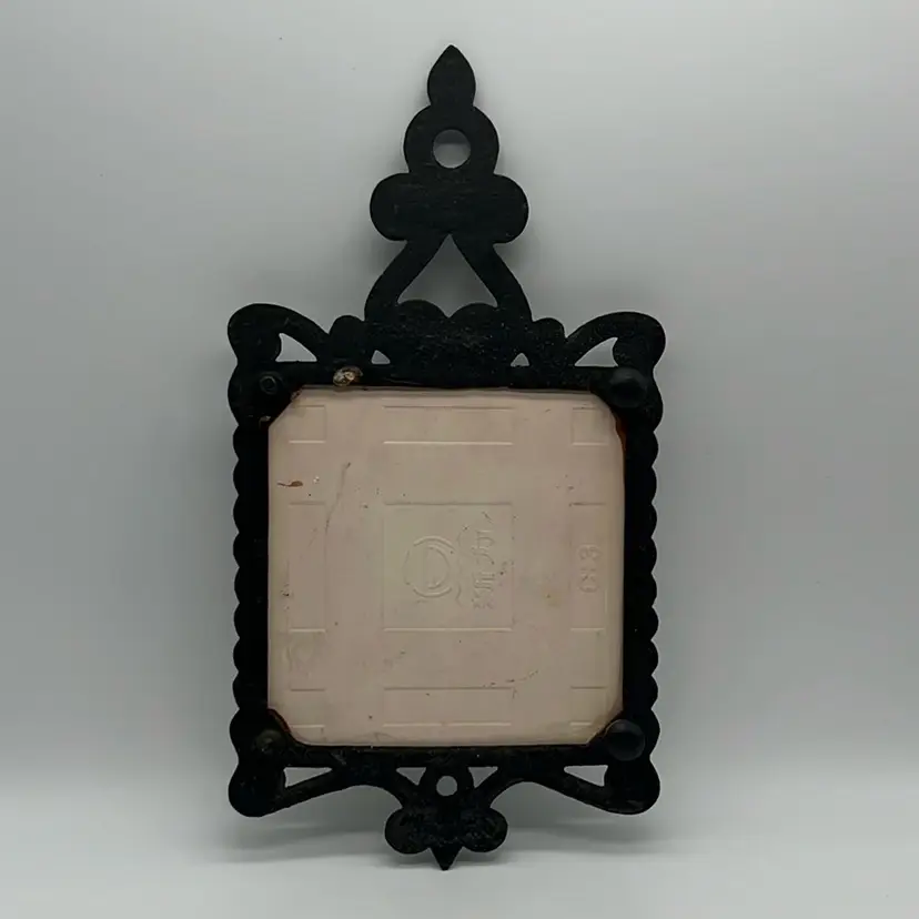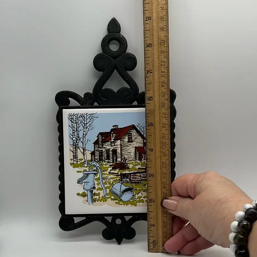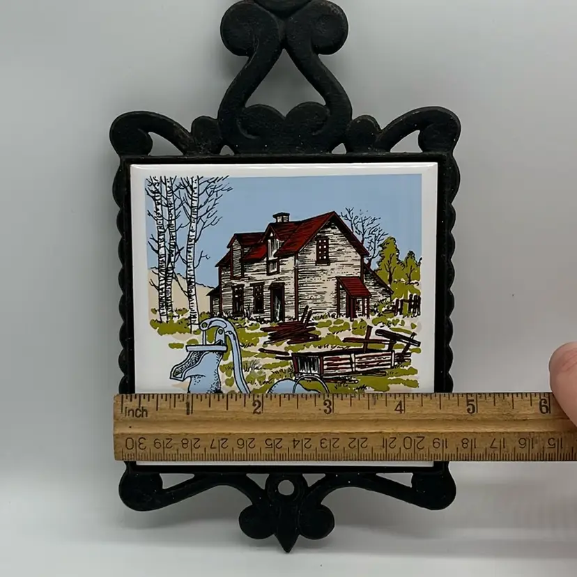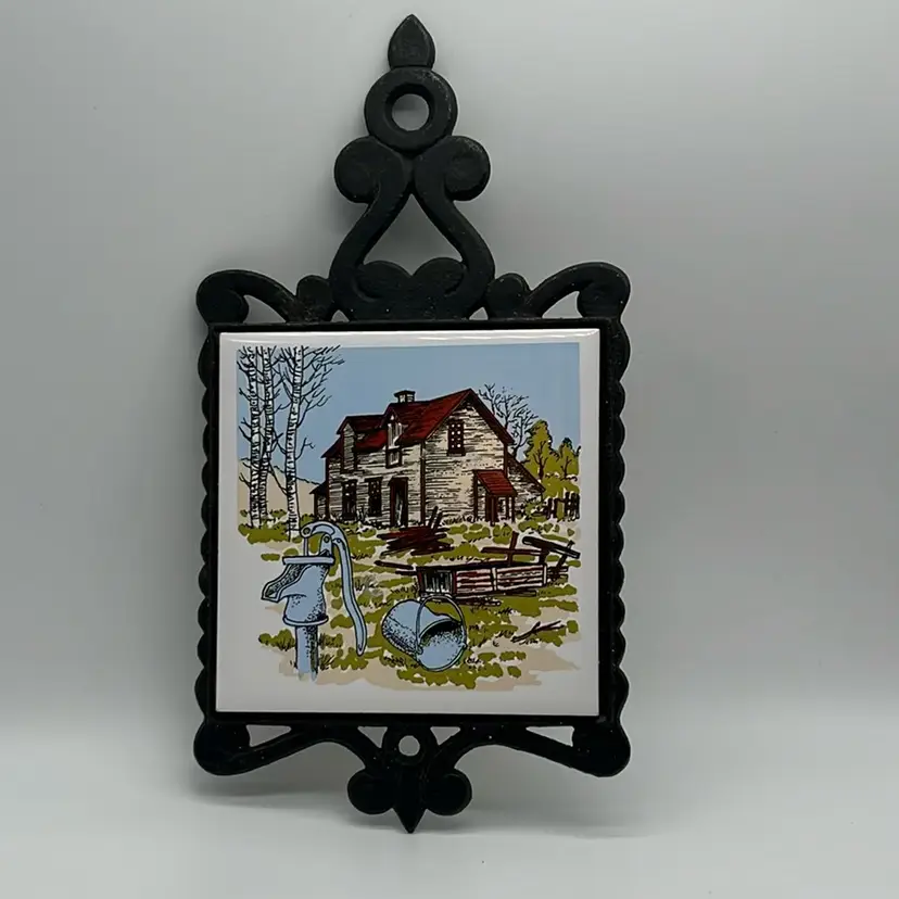 Farm house decor cast iron trivet. Shows some age but good condition. 4 feet, 2 have rubber ends. Approx. 4.75” w x 9” h