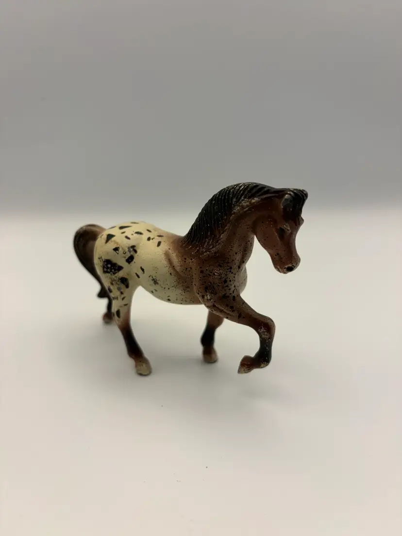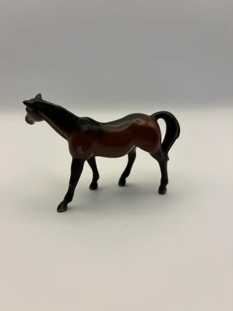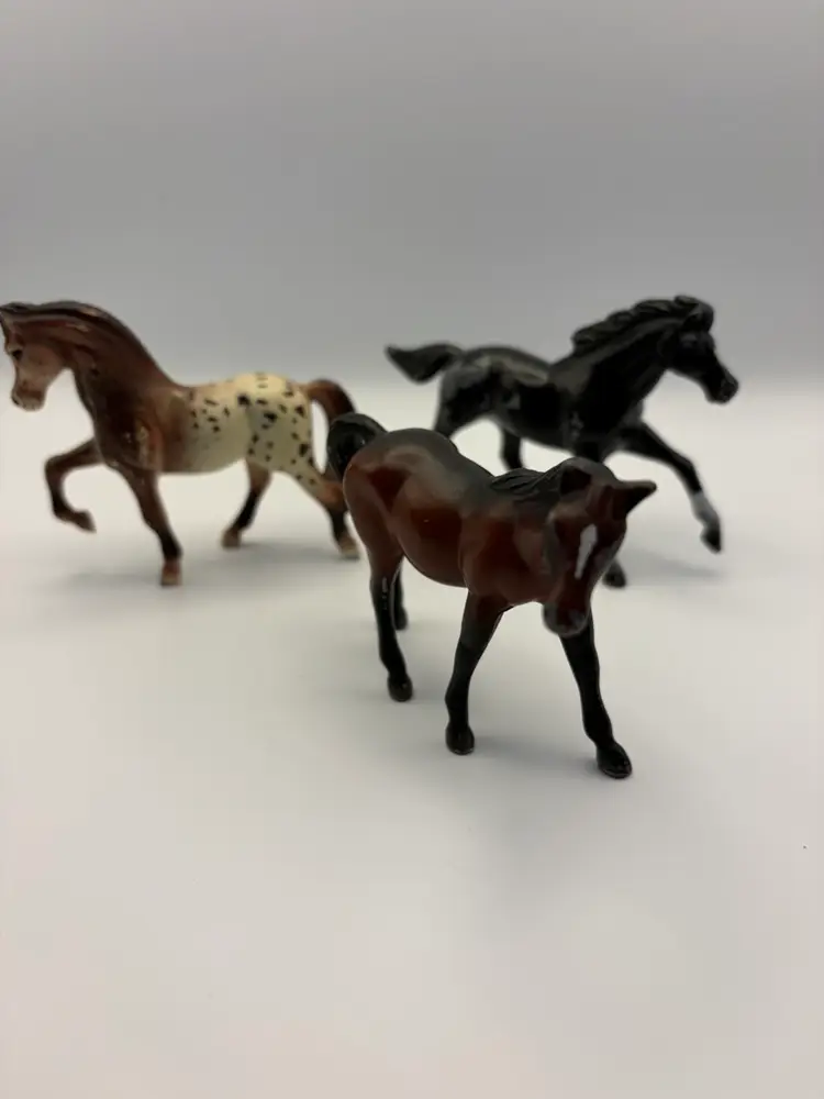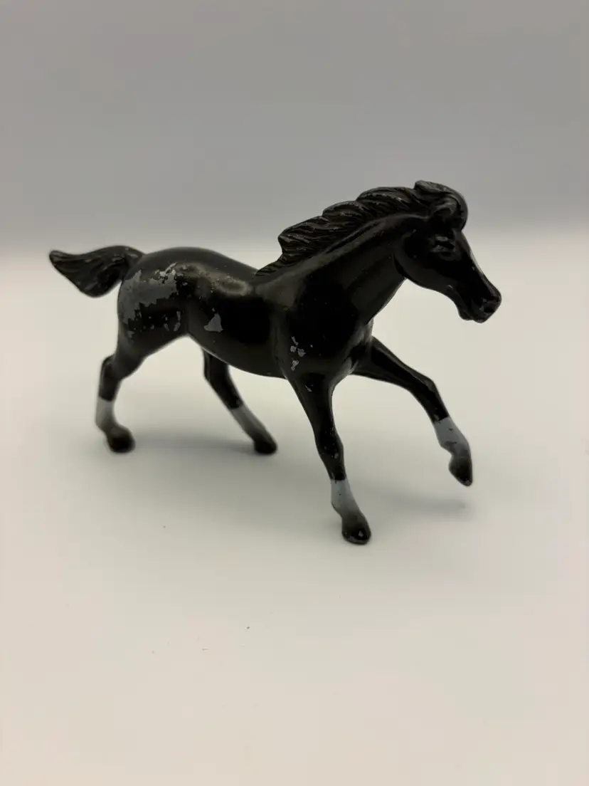 This set includes three original China Lucky Co. cast metal horse figurines, dating 1994. These solid metal toy figures feature hand-painted finishes and realistic sculpting, making them perfect for collectors, Western décor, farmhouse styling, or shelf display. Includes: Spotted Appaloosa • Bay / brown walking horse • Black trotting horse These display beautifully grouped or individually and make a great gift for vintage toy collectors or horse lovers. Condition: Vintage condition with age-appropriate paint wear and small rubs. No cracks, breaks, or repairs. Please review photos for details.