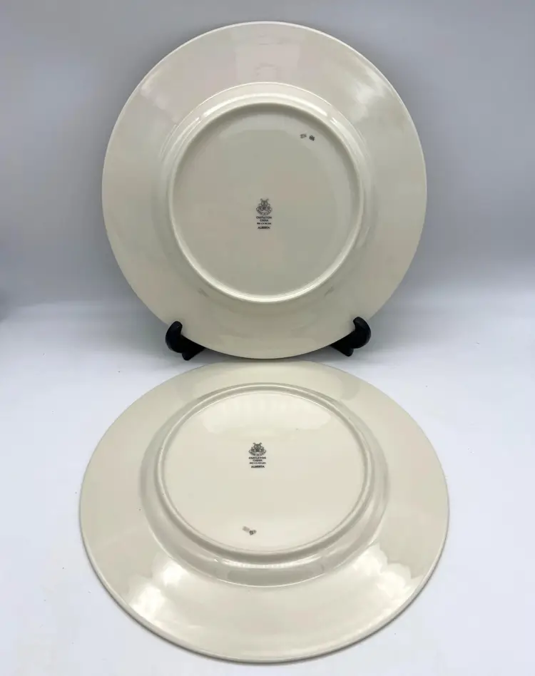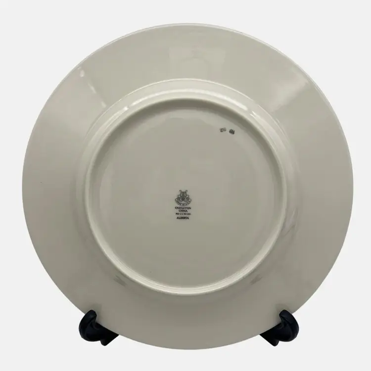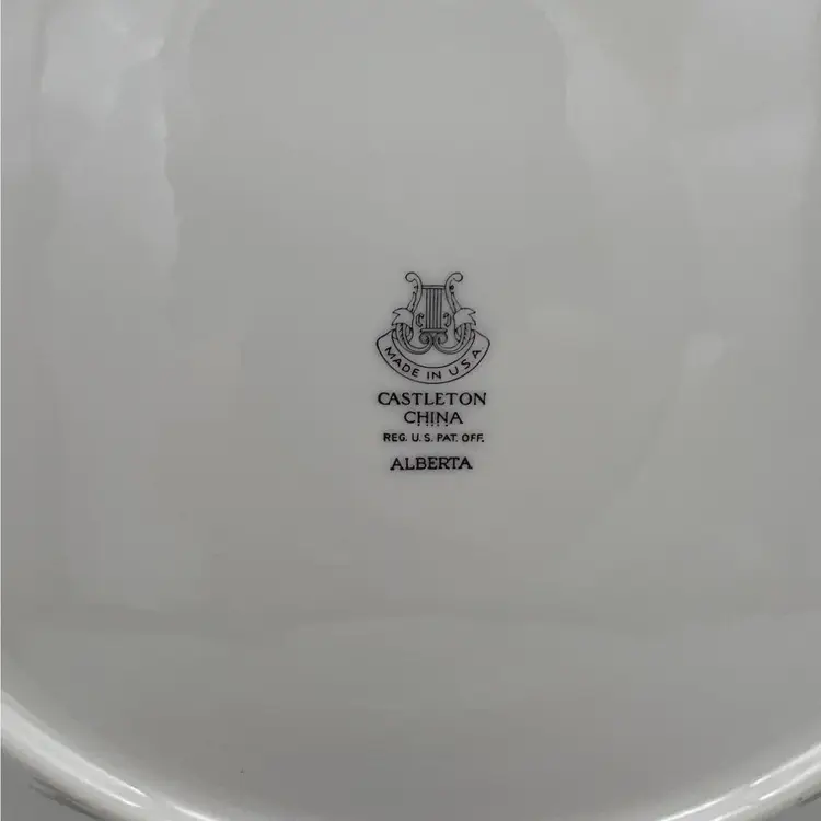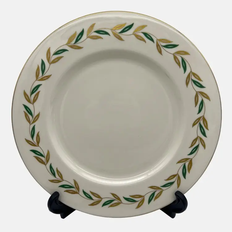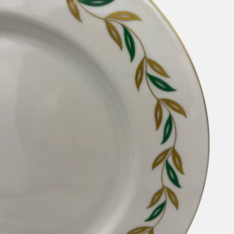 Features: • Type: Dinner Plate • Maker: Castleton China • Pattern: Alberta • Pattern Description: Green & Gold Leaf Band, Gold Trim • Size: 10.75" • Made in USA • Weight: 1lb 3oz each • Years Made: 1952 - 1962 • Current Status: Discontinued