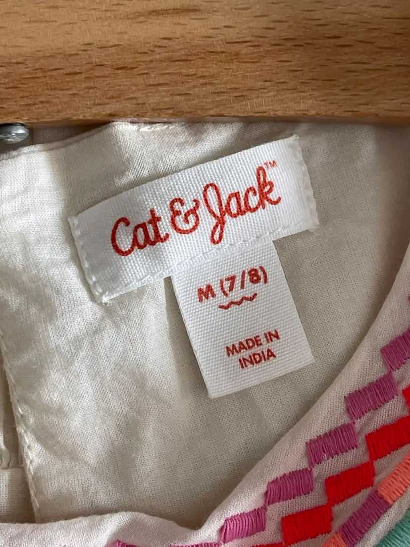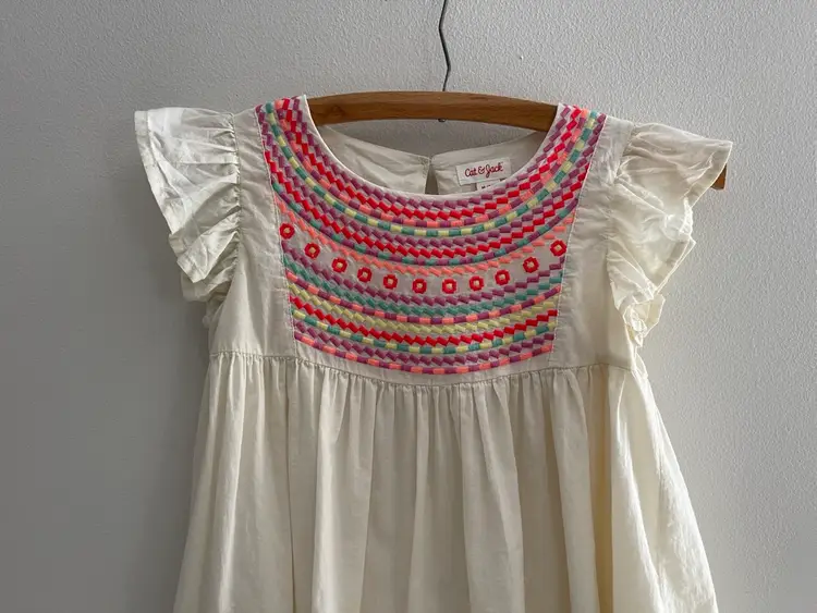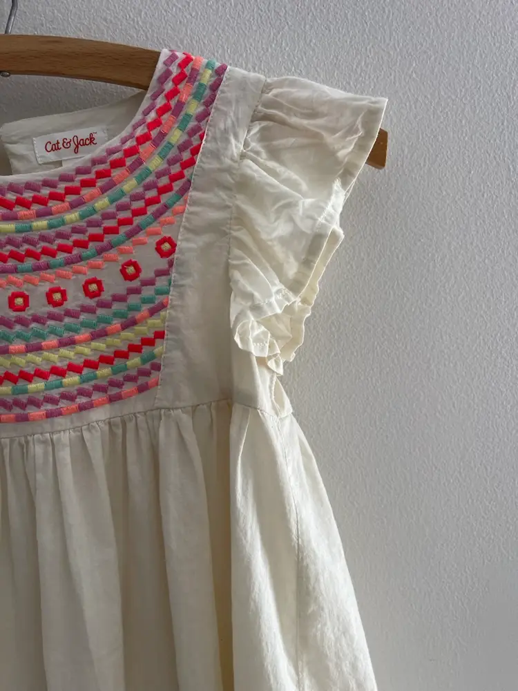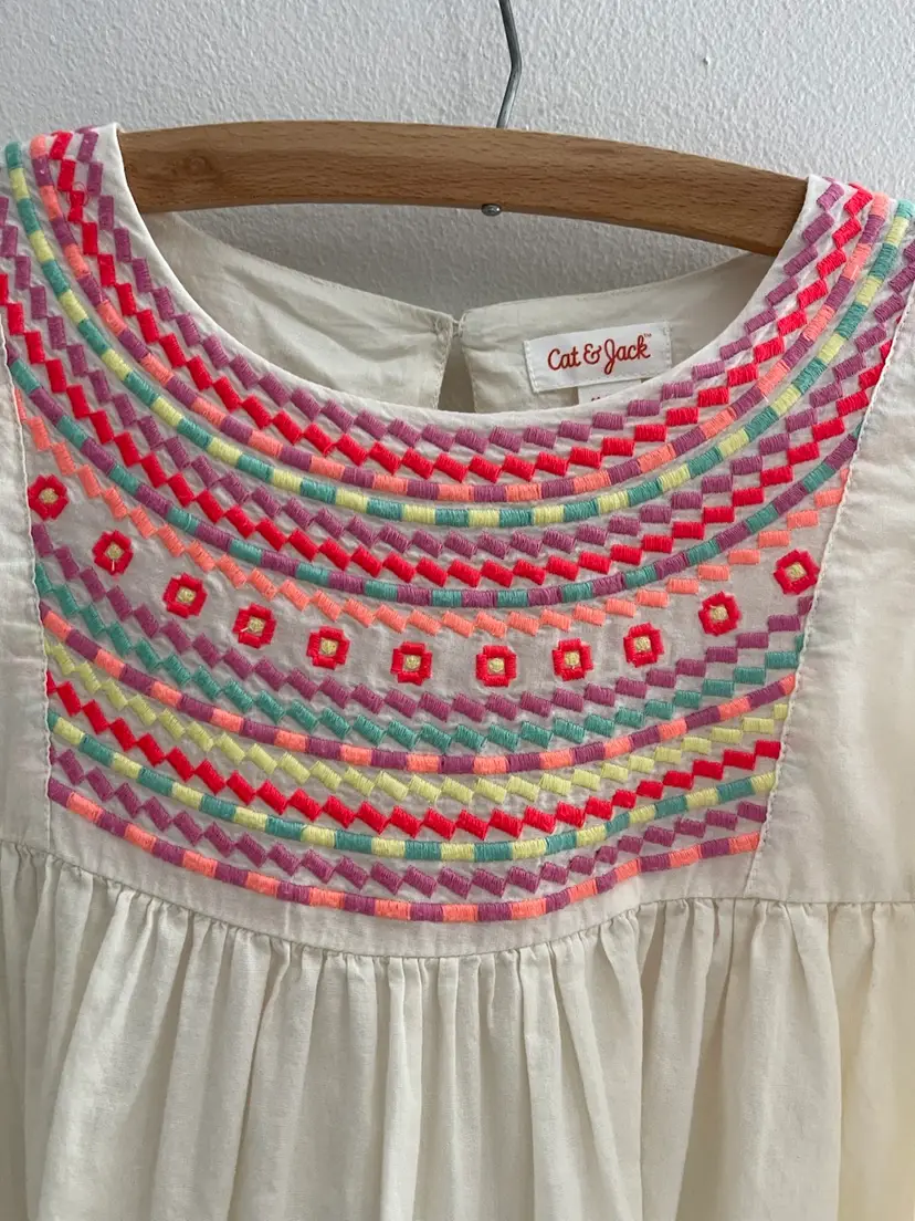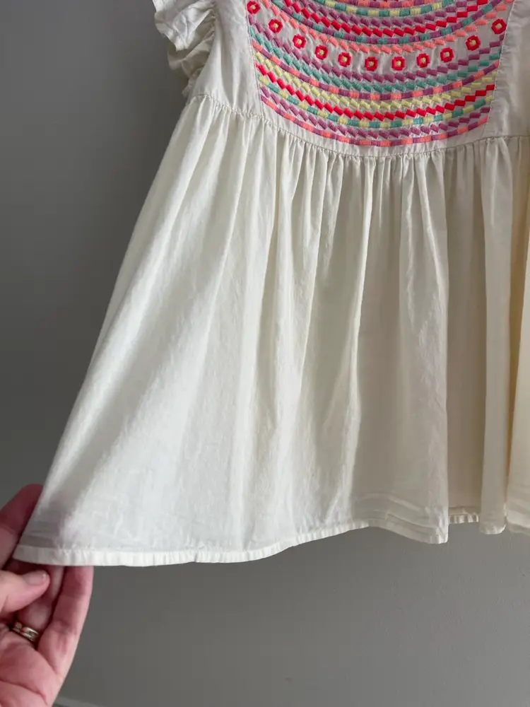 Cat & Jack Girls Multicolor Bright Embroidered Swing Smock Top 100% Cotton Size M (7/8) Double Layered for Volume and Opacity Flutter Sleeve Empire Waist Button Back Closure