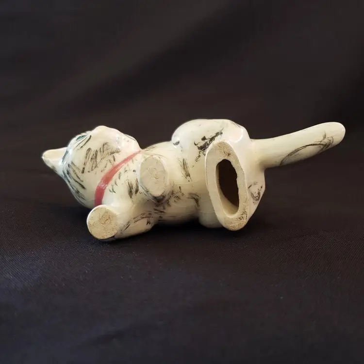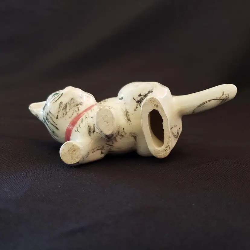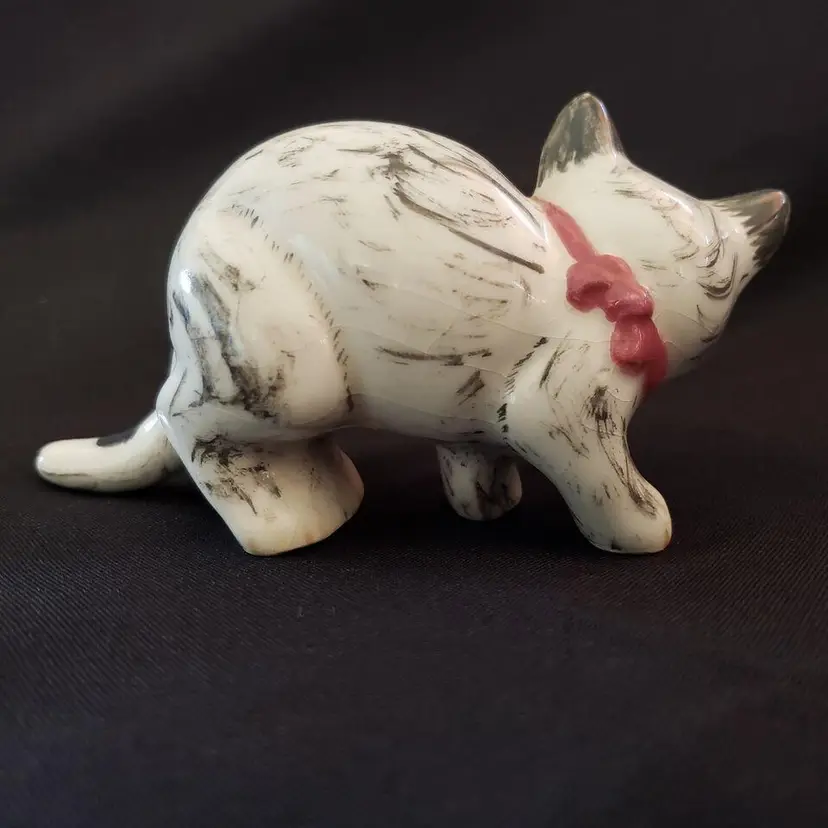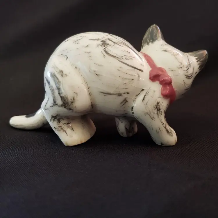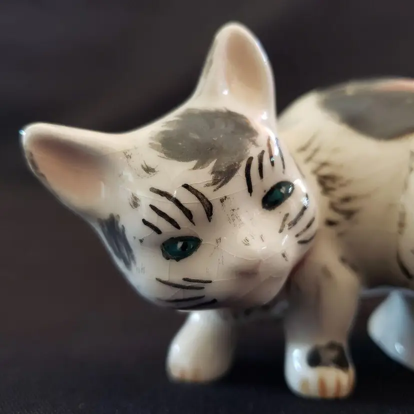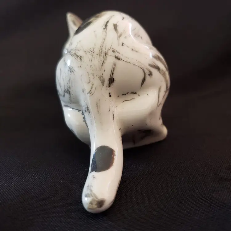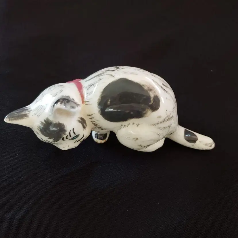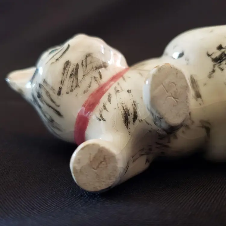 Vintage Studio Art Multicolor Cat Figurine Ceramic Porcelain Handpainted Initialed & Dated 1975. Approximately 5" long. Both the Initials and Date are very faint on the 2 front feet bottoms. Used condition with crazing, dirt on bottom, some glaze wear to the ears otherwise looks good. Please view all photos as they are part of the description and please ask questions prior to purchase if possible.
