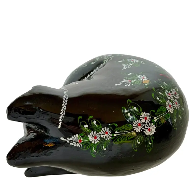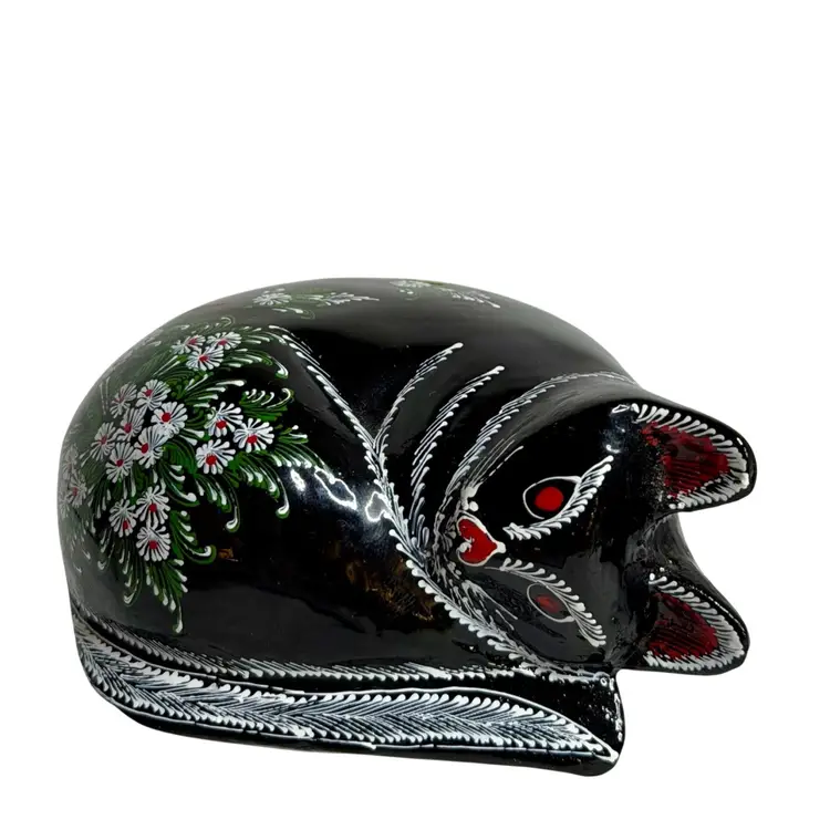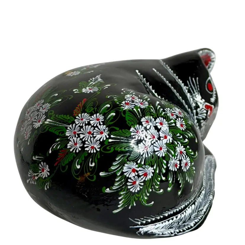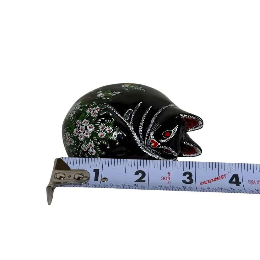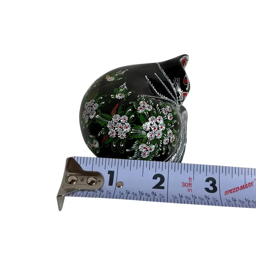 This delicate cat figurine is a stunning addition to any collection. Crafted from high-quality wood and finished with a beautiful black laquer paint and floral hand-painted design.