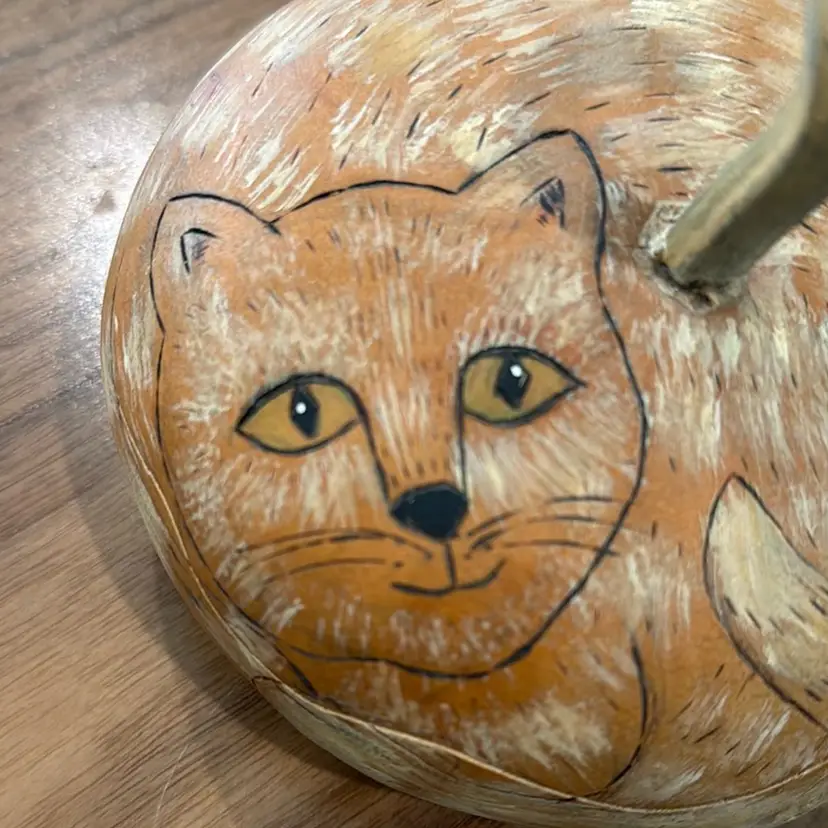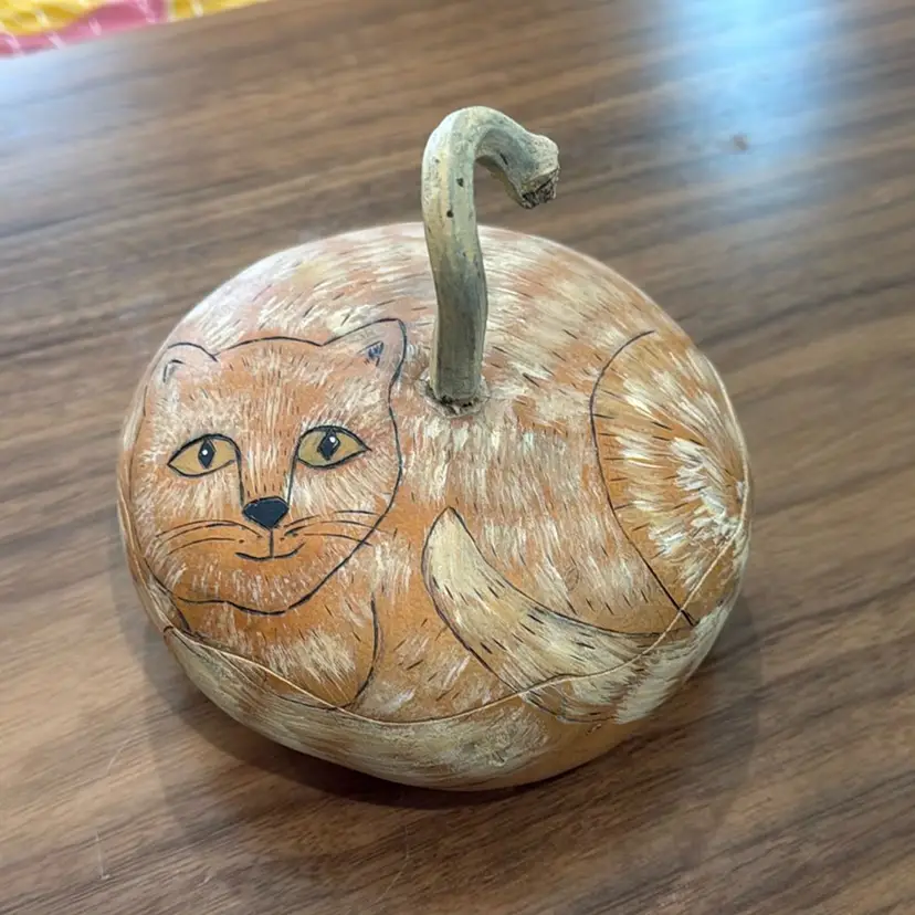 Natural gourd with hand painted cat. 5” diameter, 5” high with stem.
