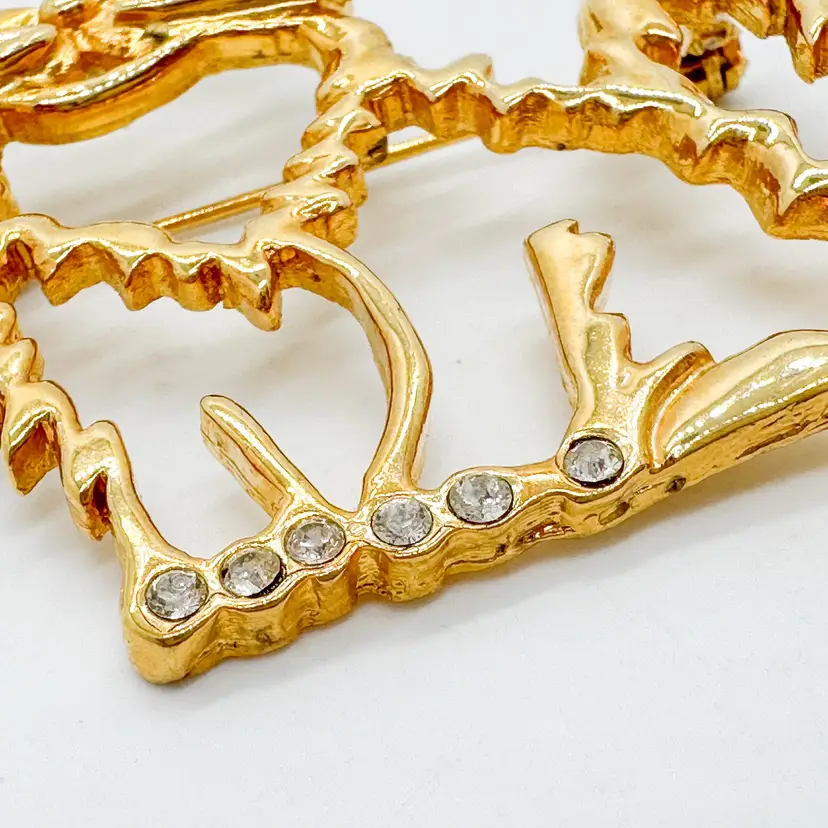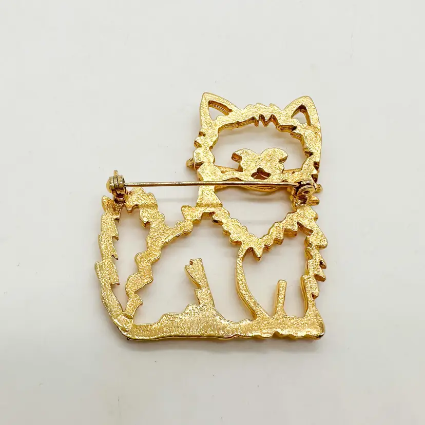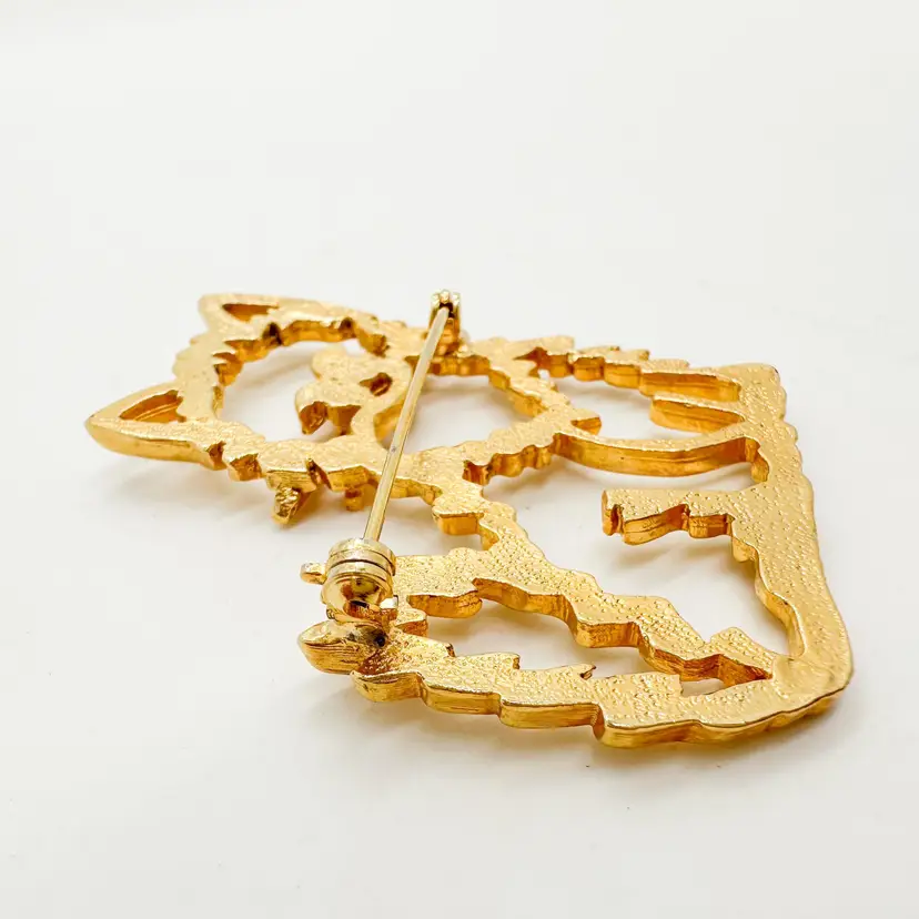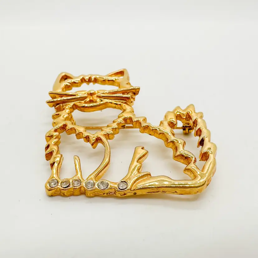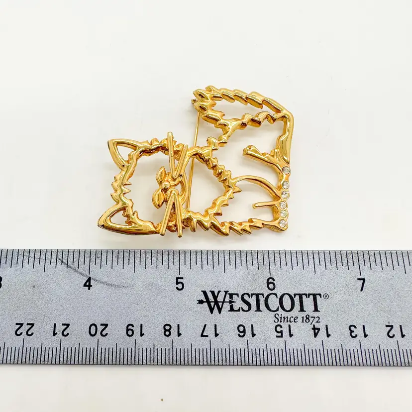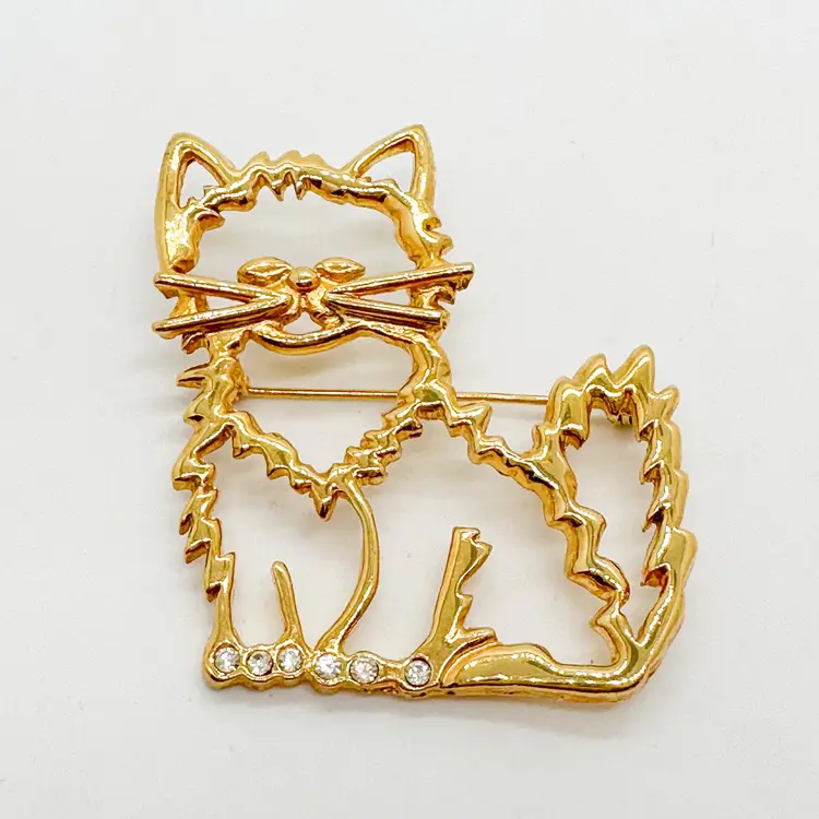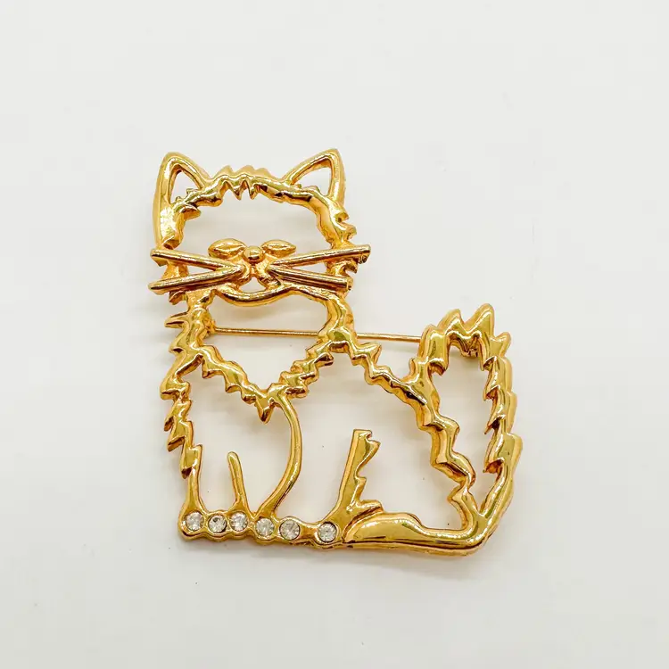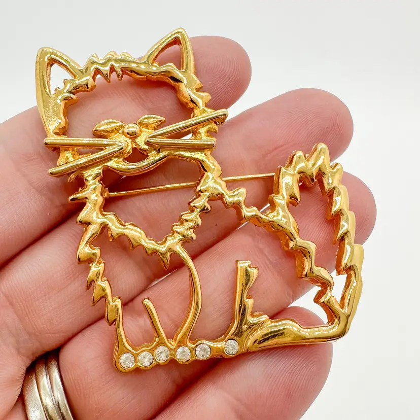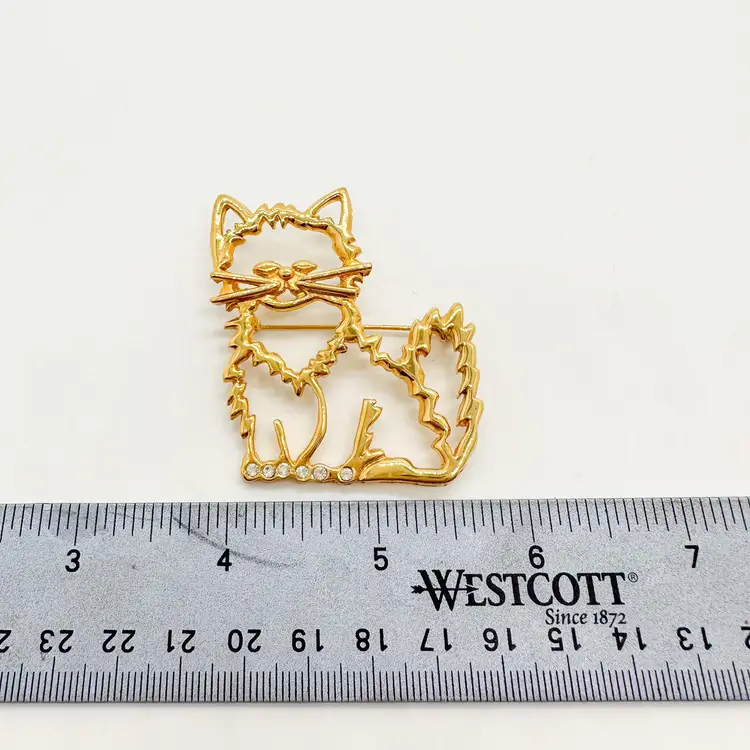 Gold tone cat brooch Features clear crystal claws Unbranded Pre-owned, possible vintage, very good condition, some wear appropriate for age and use, some light surface wear, see all photos Approximately 2.25" H X 1.75" W