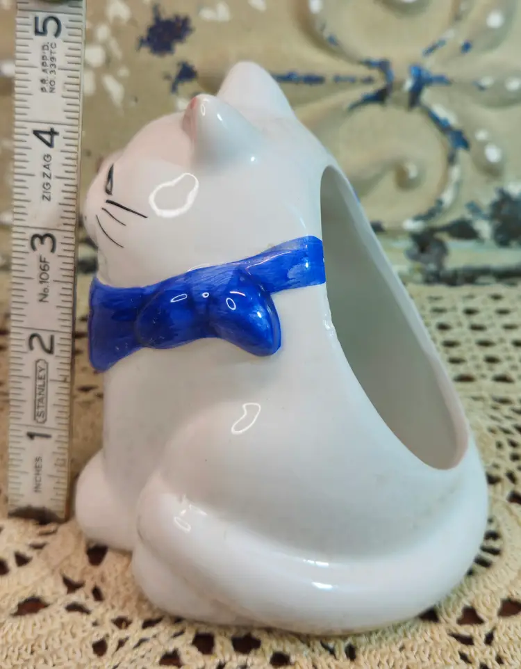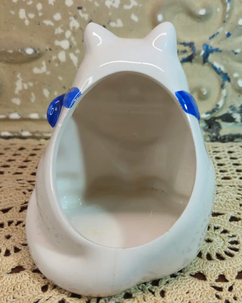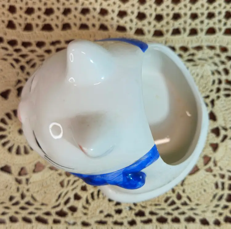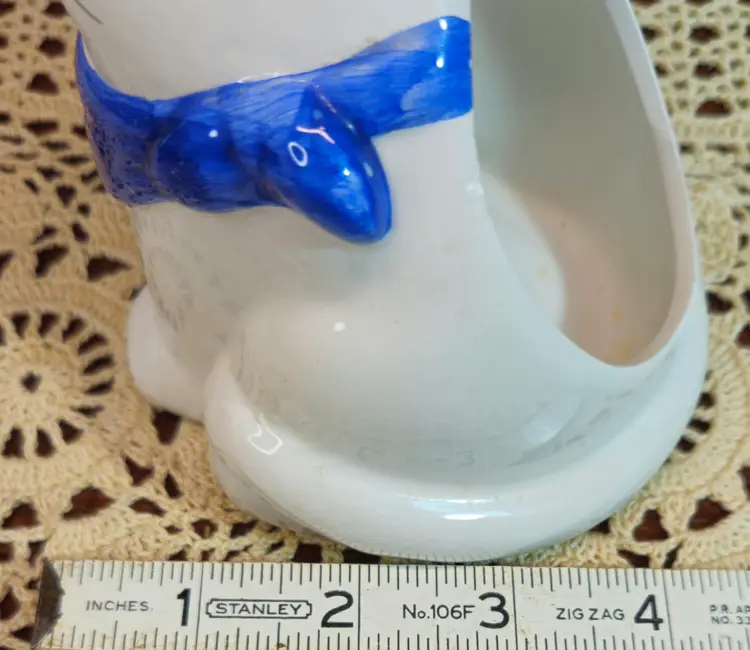 This adorable sponge holder is in excellent, used condition, with no appreciable chips, scratches or cracks. There is a small amount of decolorization on the bottom, due to its age. There is a small orange area on the bib, which used to be a painted fish. Measurements are depicted in the pictures of the item or listed in the description of the item. Please review the photos, as they are part of the item description. Photos will always reveal noticeable defects, as will my description. Any white “blemishes” that are not pointed out in this section are from the lighting that I use for my photos. If you need clarification, please reach out to me.