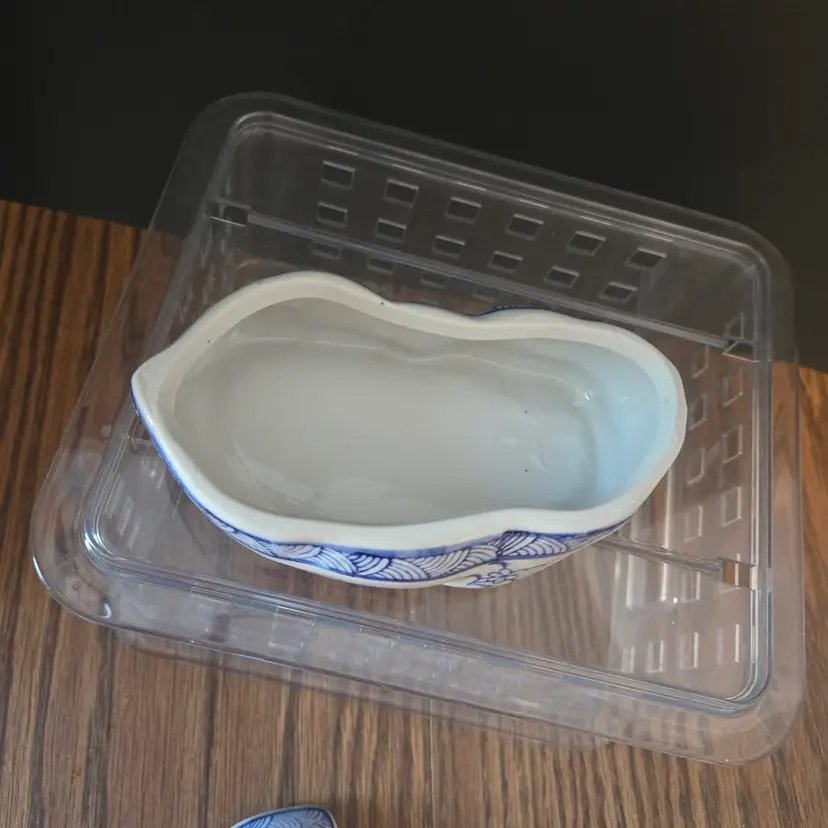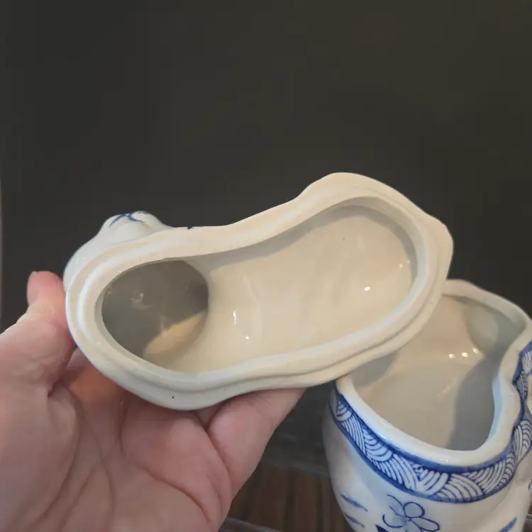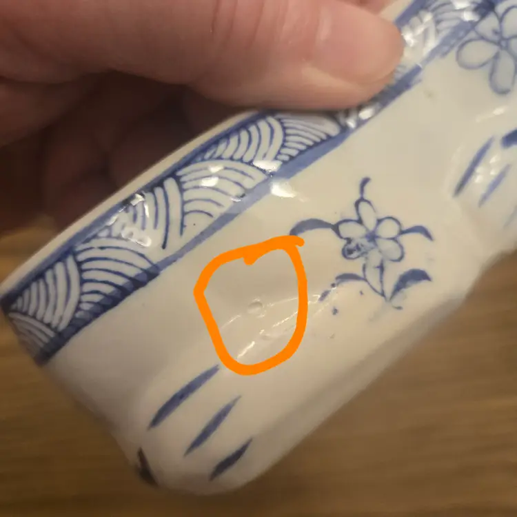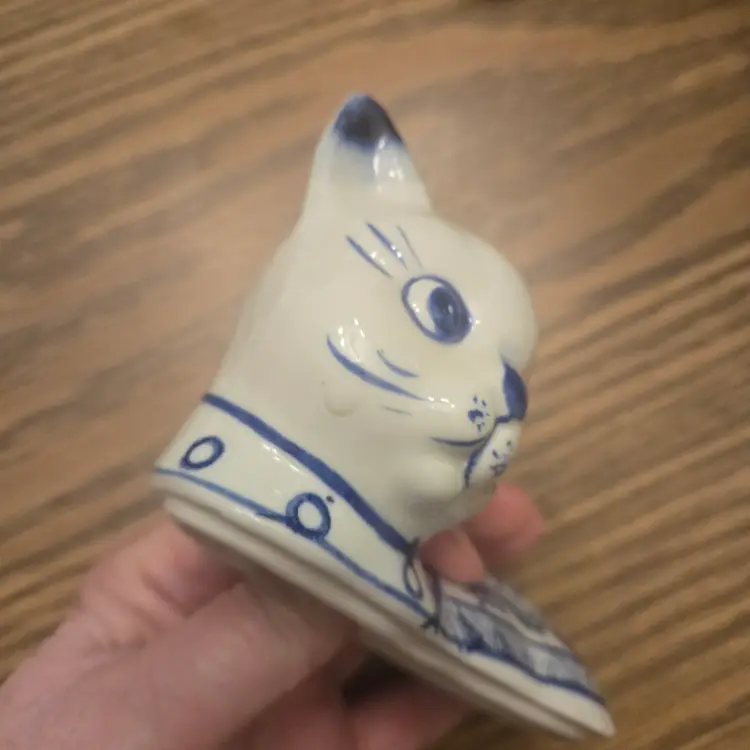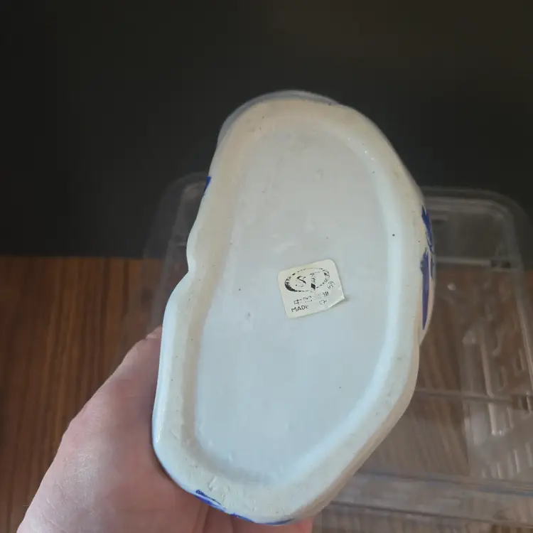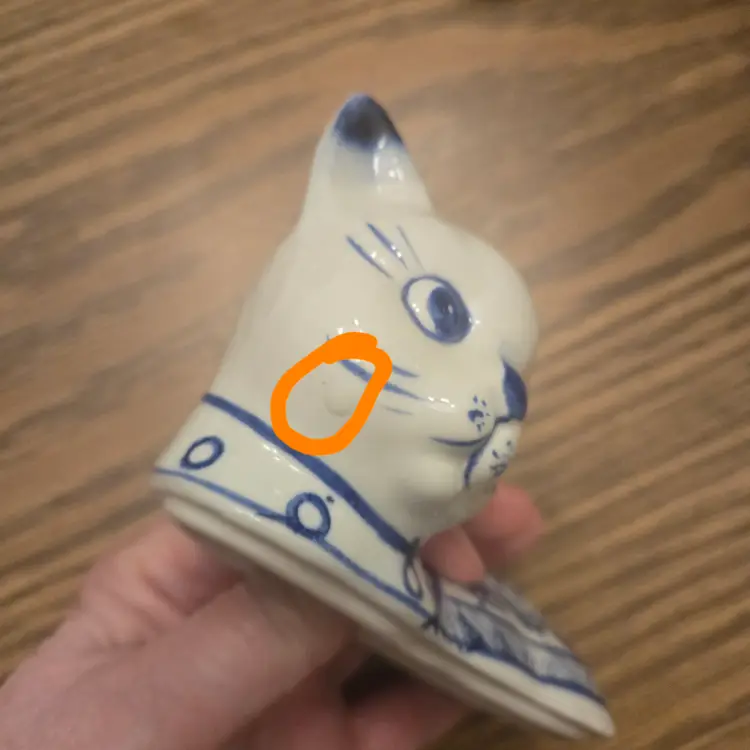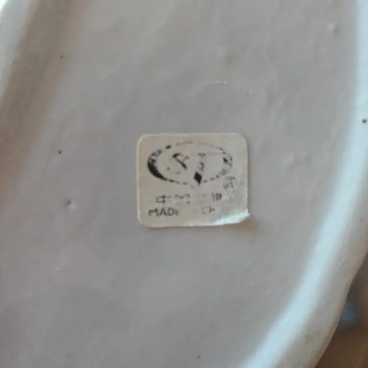 It is in good used condition. I didn't find any chips or cracks on her, but she does have a dimple on her cheek and a small scratch - both shown in pictures. The dimple seems to be from a glaze bubble and the scratch seems to be from a broken glaze bubble (not sure if those are the correct terms!). The colors are bright. The bottom rough edge shows some wear (see pictures). The edge at the opening is clean. Although the sticker is faded, it is clear enough to show the manufacturer, ST Porcelain from China.