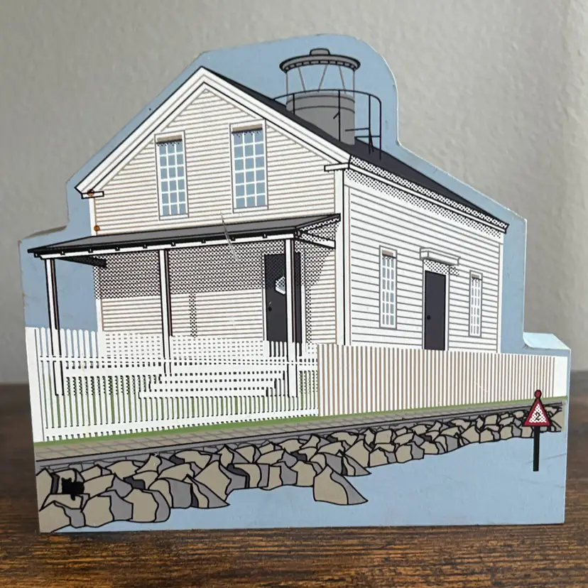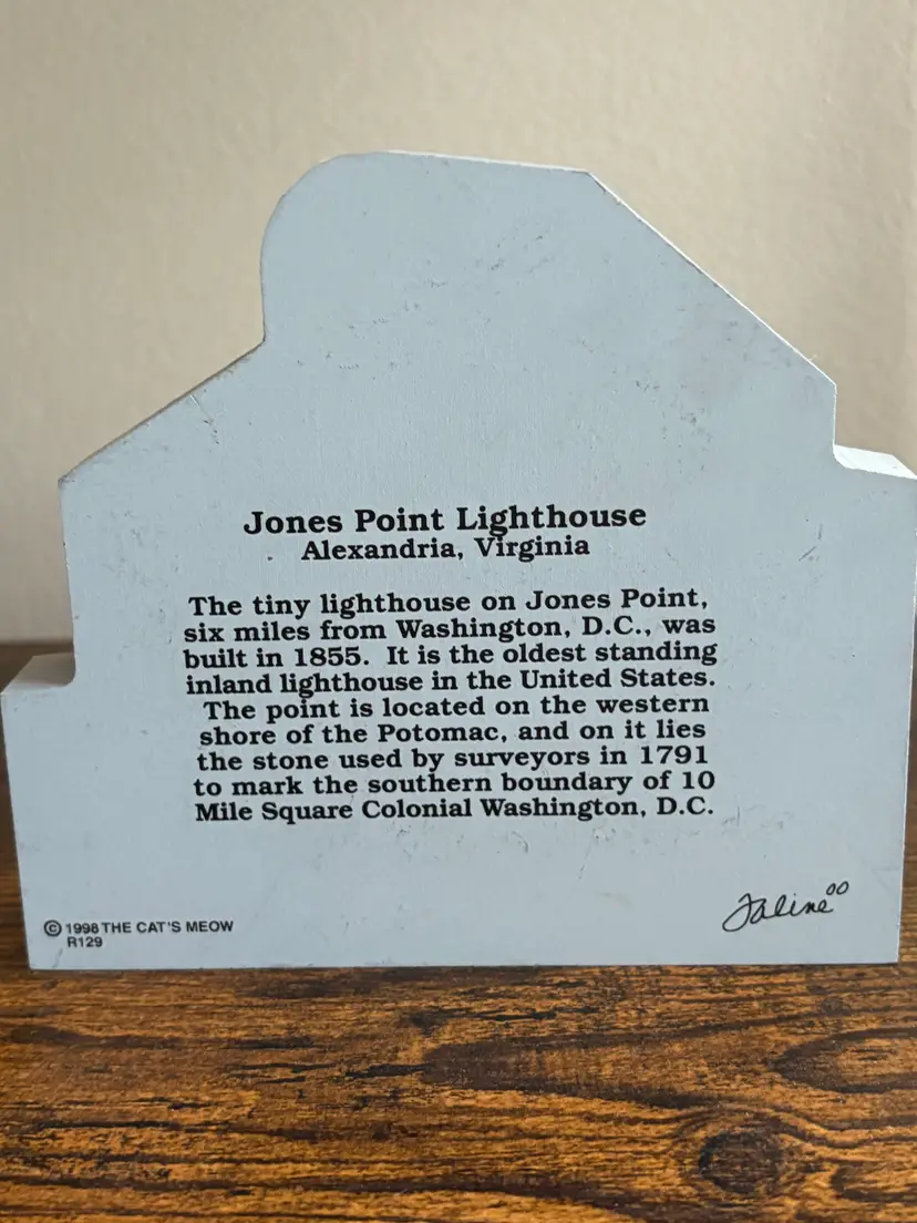The Jones Point Lighthouse is located in Alexandria, Virginia, on the Potomac River. It was built in 1855 and is a small, square-shaped lighthouse attached to a keeper's house. It was decommissioned in 1926. It marks the southern terminus of the original District of Columbia boundary line. Signed 1998.