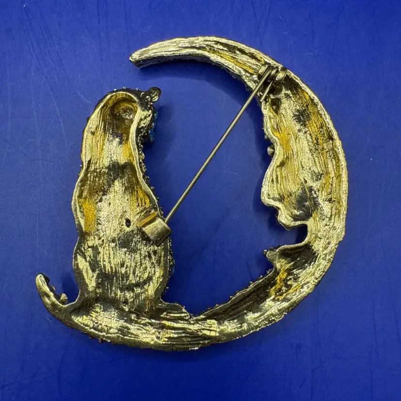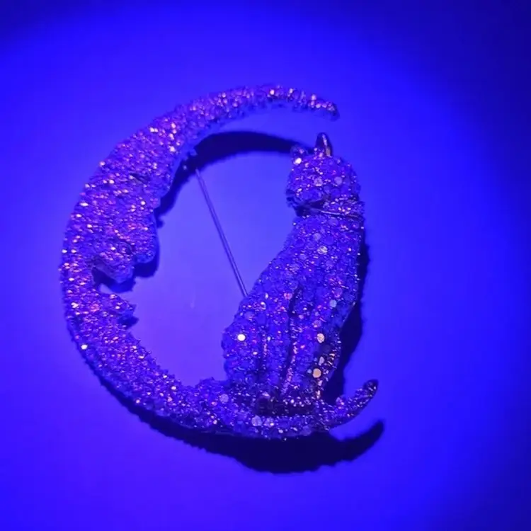 Cat on the Moon Brooch Cat is covered with blue and yellow (hints of)rhinestone crystals with clear crystal collar Moon is white crystals Measures 2 inches wide by 2 1/4 inches tall Back is gold tone metal Last photo is under black light… glows purple