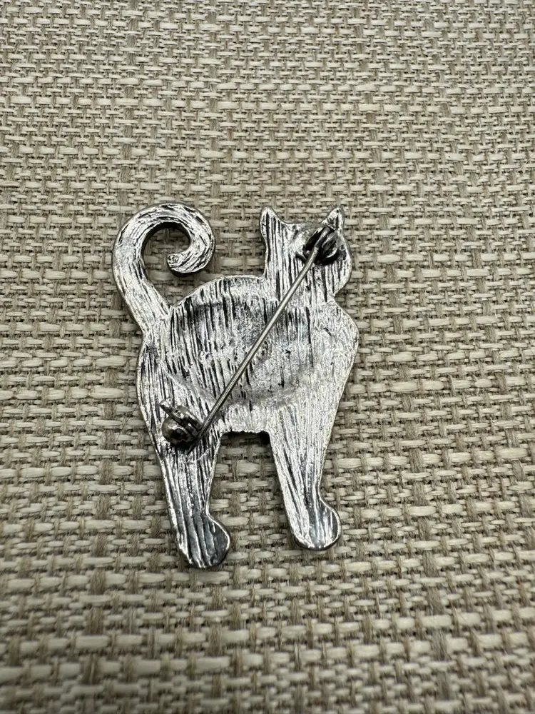 Silver toned brooch with blue accent. In good condition 2”