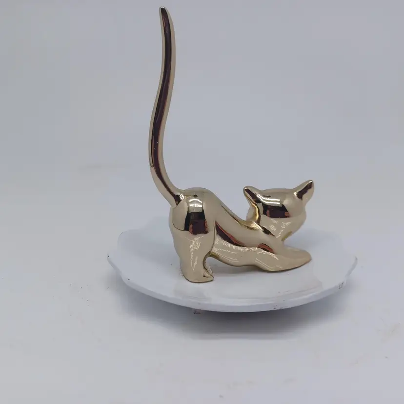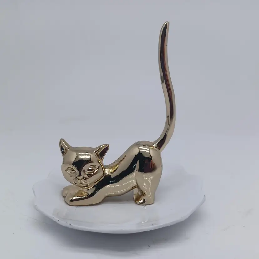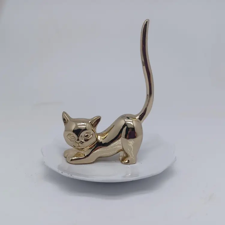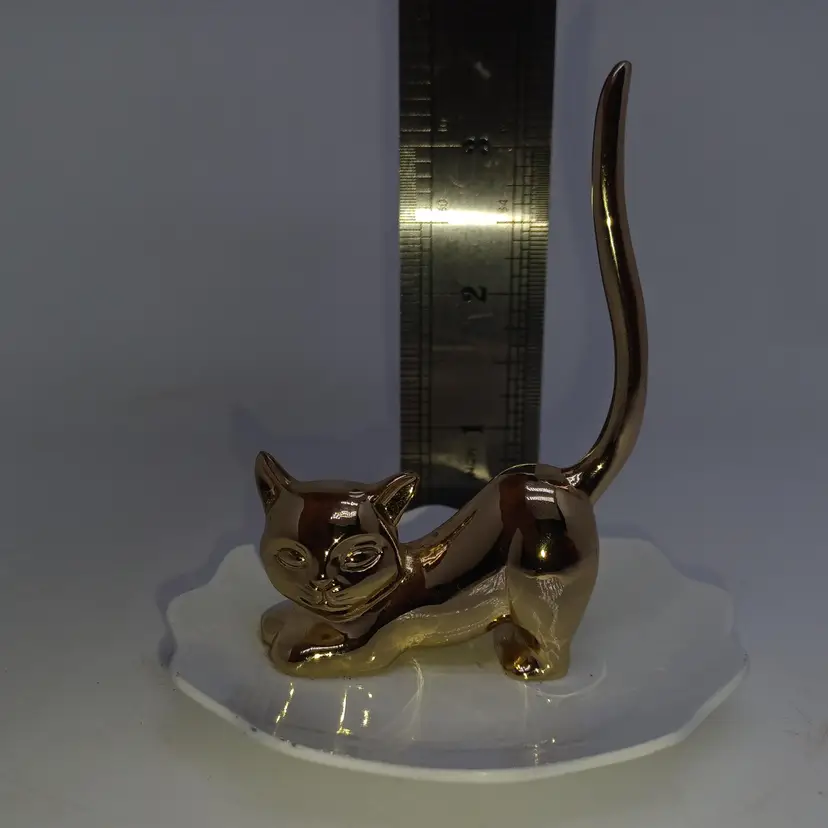 Cat Ring Holder Tray Gold Tone & White Porcelain Metal Tray Measures 3in x 3.5in x 3in In good condition with a few scratches and wear to the edges of the metal tray but nothing that really detracts from use or display has original made in China sticker on the bottom and a felt pad so the dish does not slide please see all pictures as they're the best description all items from a smoke-free home with pets experienced shipper
