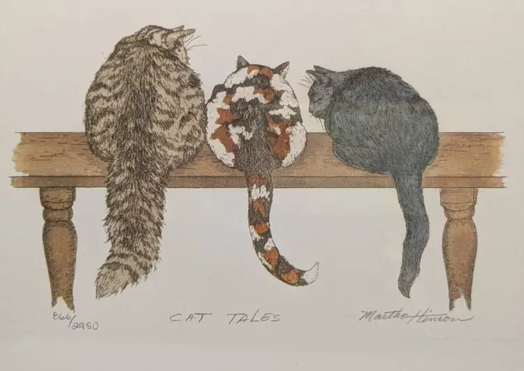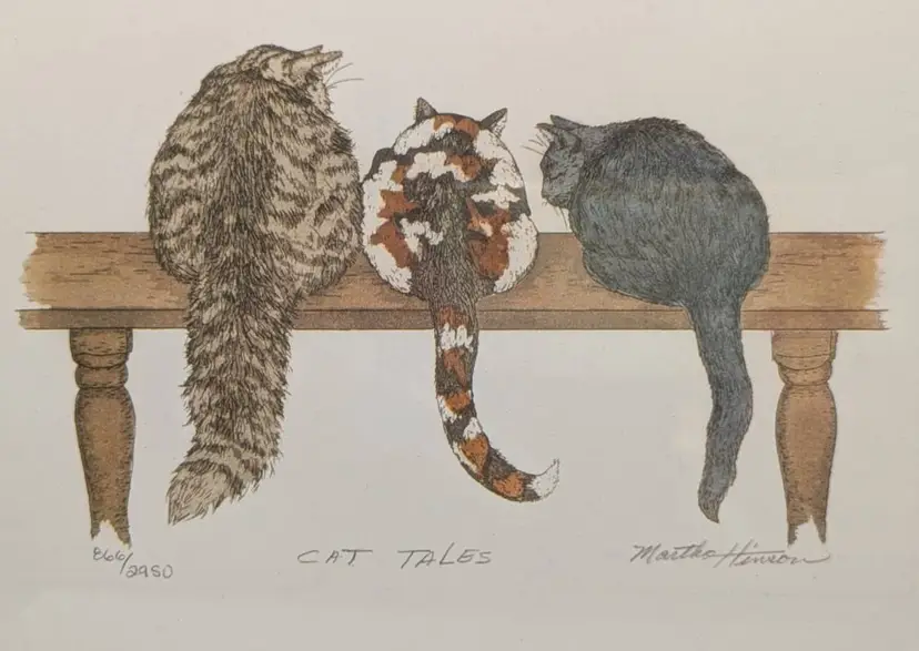 This is a lithograph- limited edition print- signed, numbered 866/2950. The title is "Cat Tales" Its a sweet print featuring a black, a calico and a tabby cat sitting on bench. The frame is 10 x 8 inches. The print measure 6.75 inches by 8.75 inches. This is being sold as used- it was enjoyed by family for years. Non smoking home Non pet home. Frame has some bruises- please see photos.