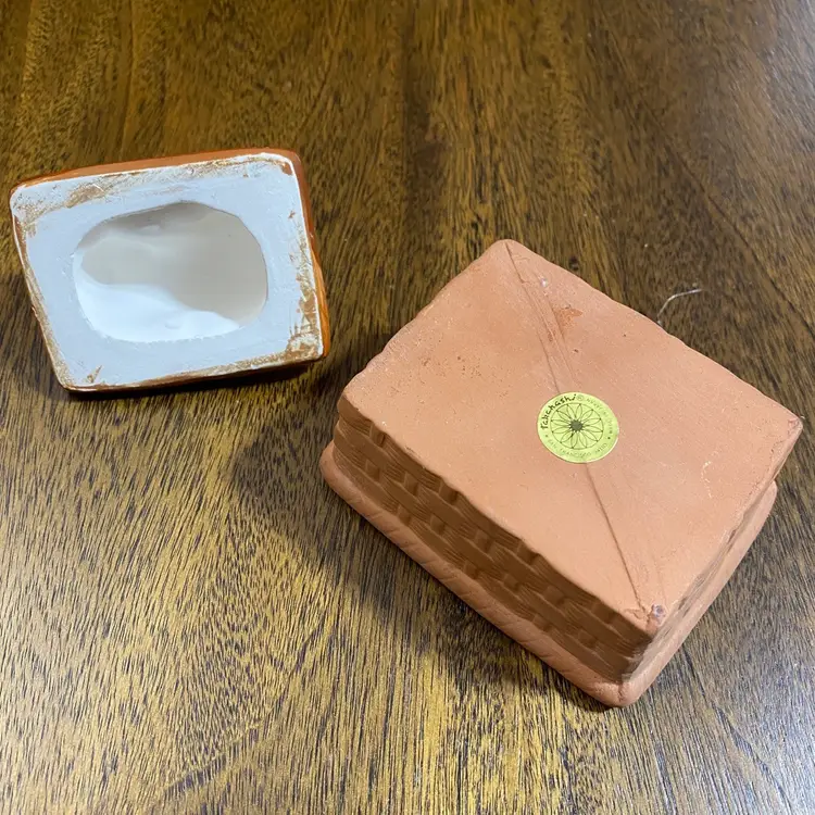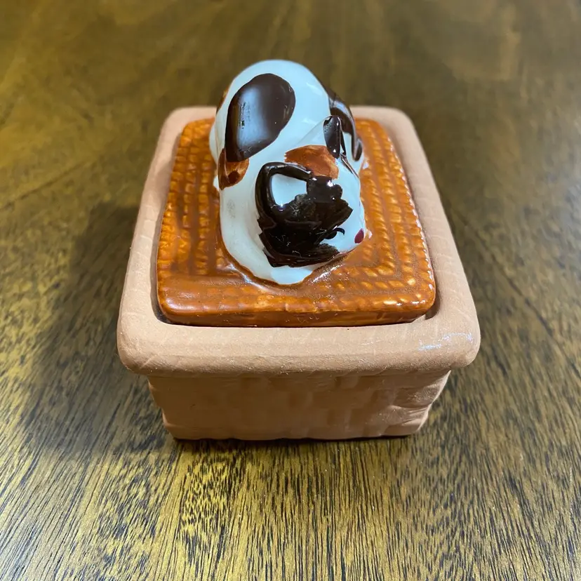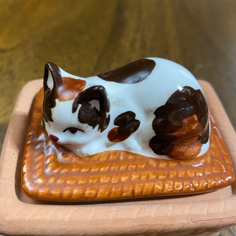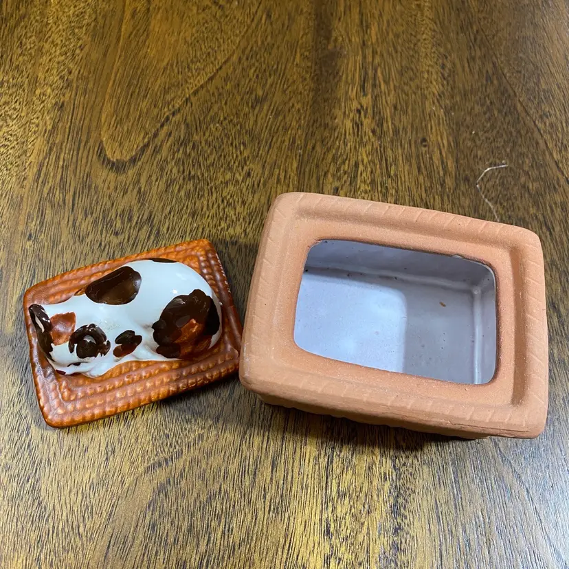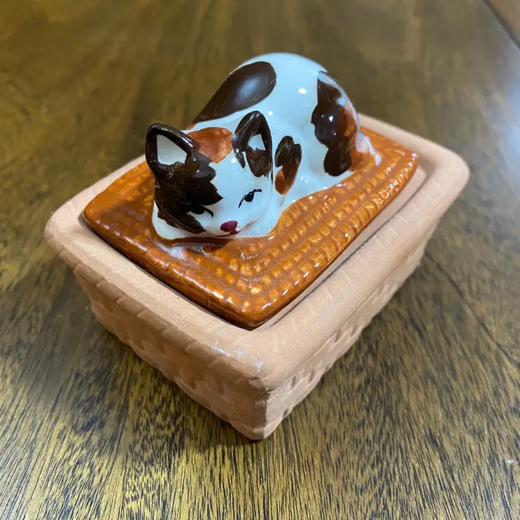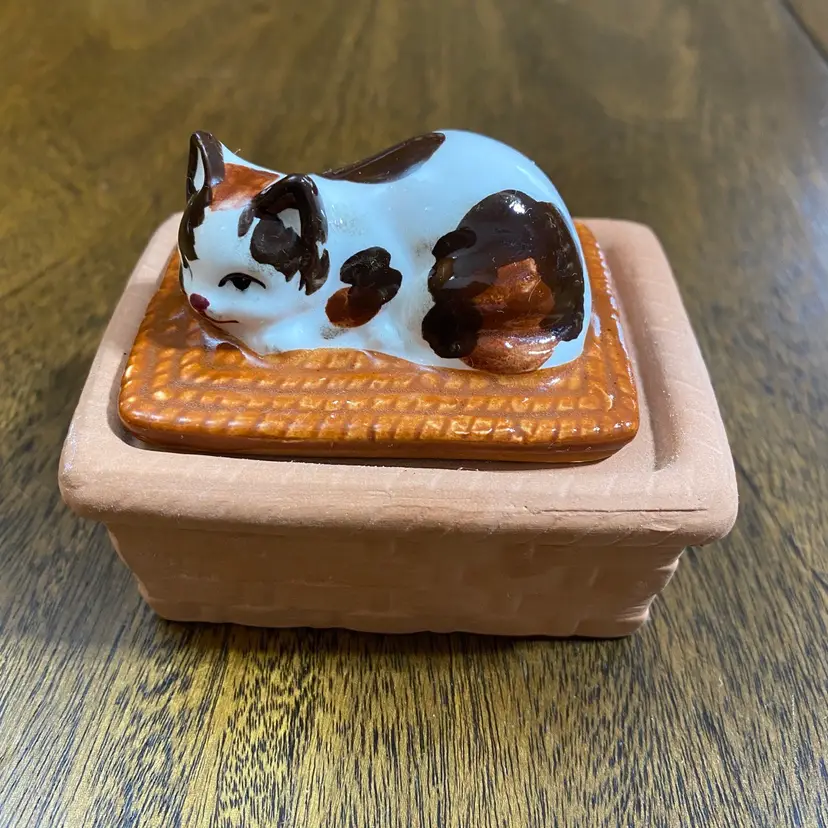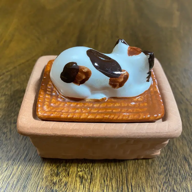 Size: about 3” x 2 1/2” Material: Ceramic Bisque on Bottom, Cat Lid is glazed. Condition: no chips or cracks. Please see photos as it is part of my description.