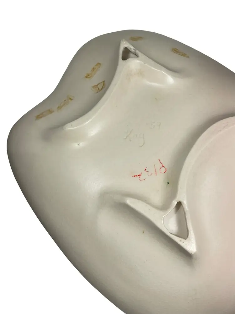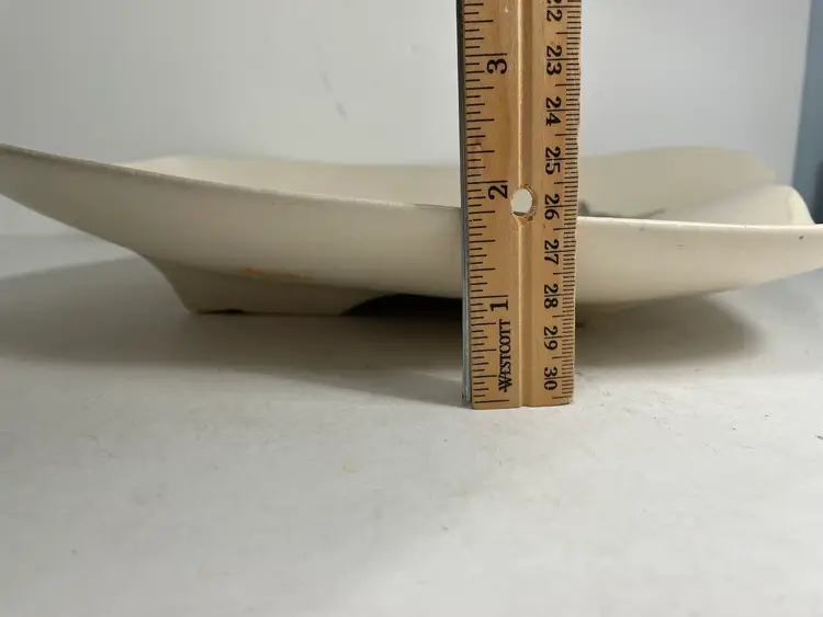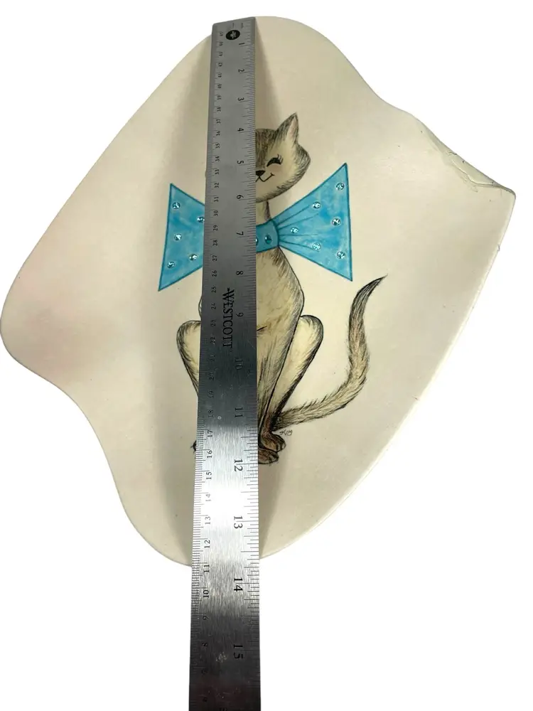 12” x 14” x 2”. Faux jewels on bow. No chips or cracks, small flaw under glaze, smooth touch.