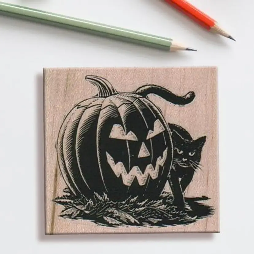 Cat With Pumpkin Halloween Rubber Stamp Wood mounted Red Rubber Size: 2-1/4 x 2-1/4 inches Brand new/unused • Great for crafts, junk journals, mixed media projects, collage, card making, party invites and tags. • First purchase on District? Use this code for $5 off a $10 min purchase. ALOHAG34