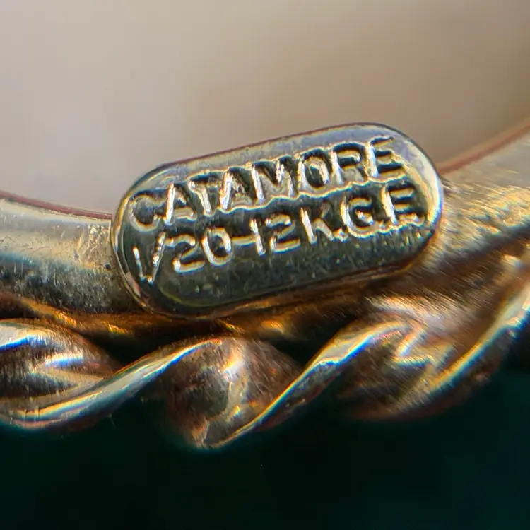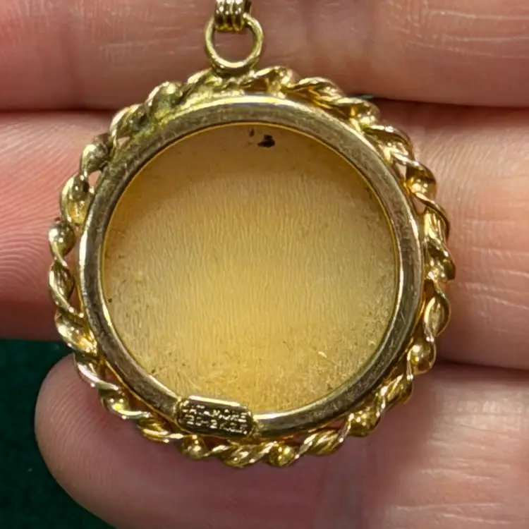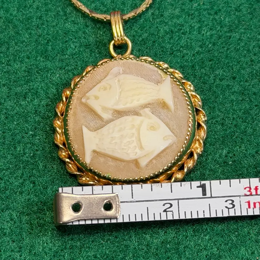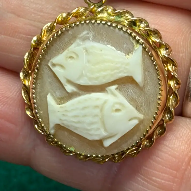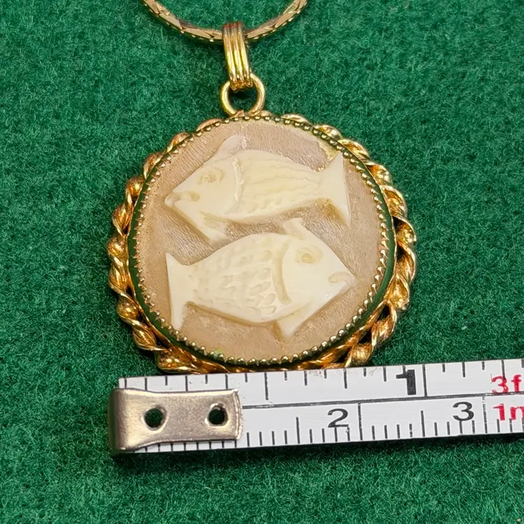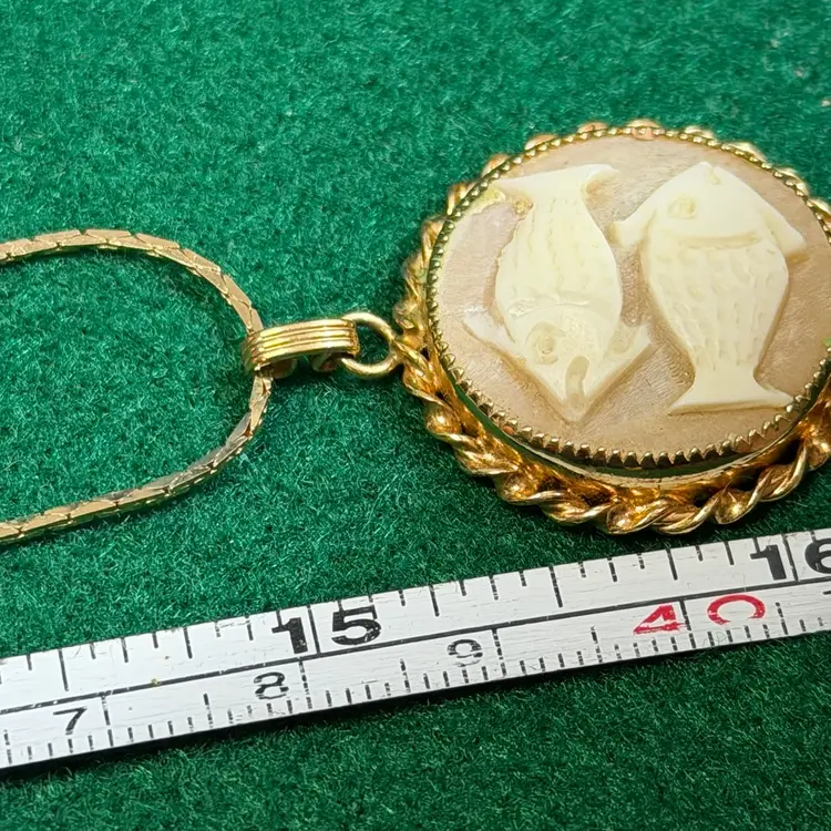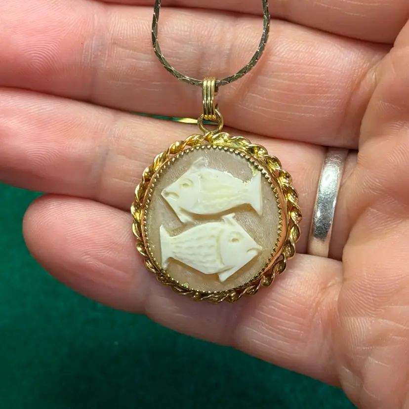 This interesting cameo is hand carved depicting two fish. It is set in a marked 1/20 - 12k gold electroplated/filled setting made by Catamore. It is hanging from an unmarked gold tone chain that is approximately 30 inches long. The pendant is about 1 inch across.