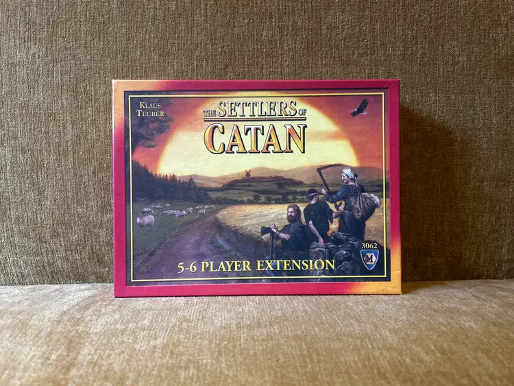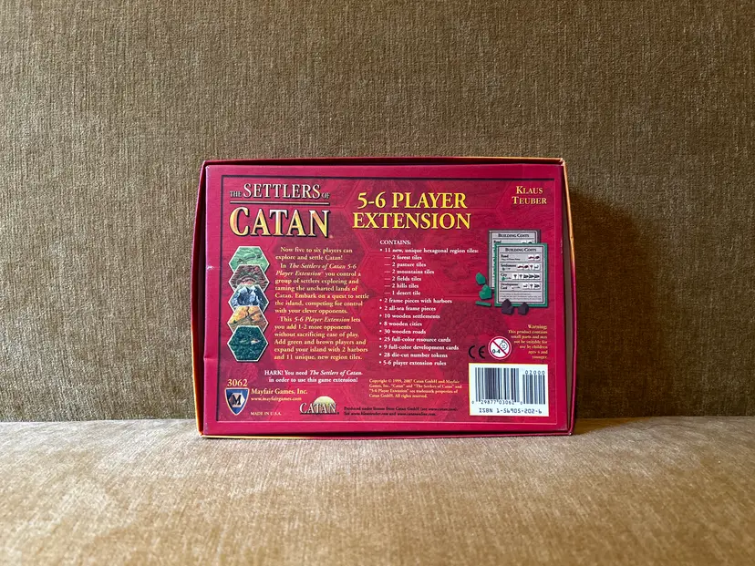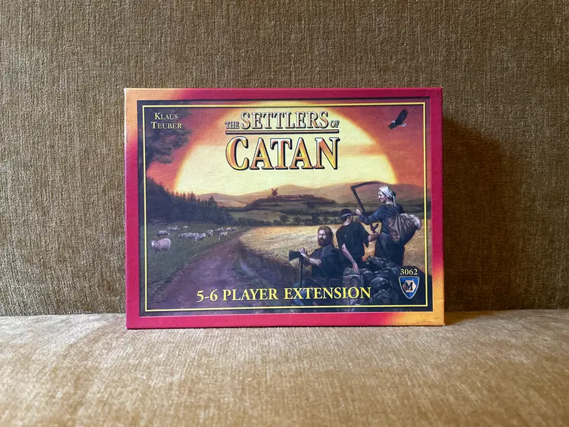 Allows you to add up to two more opponents to The Settlers of Catan. The only change in the rules is that there is a building round at the end of each turn in which any player can build.