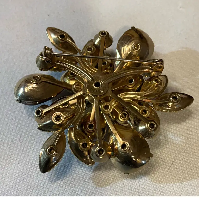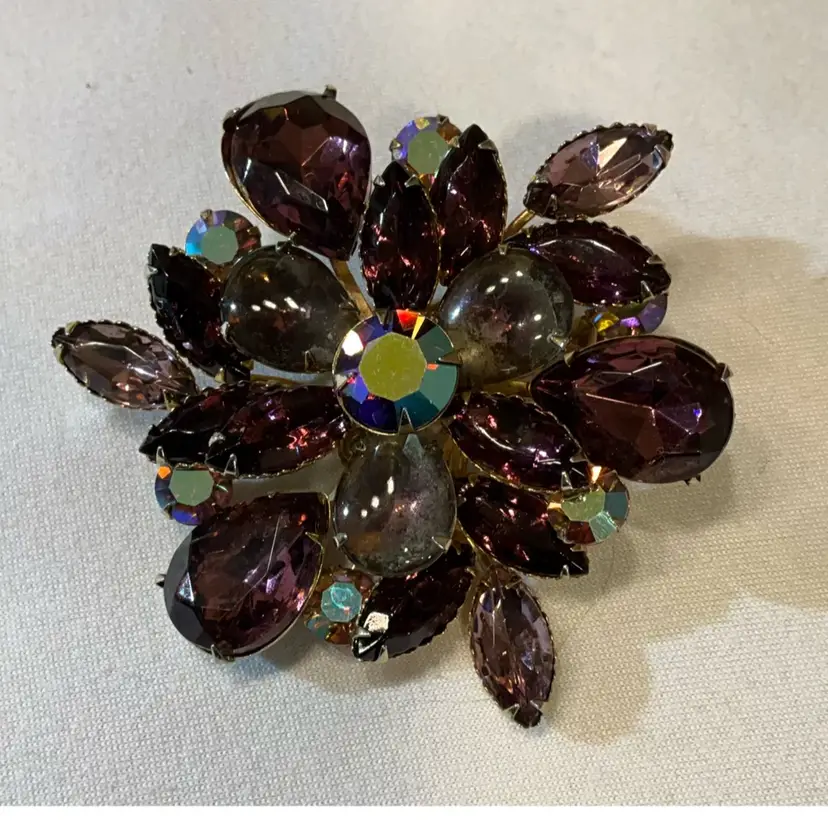 Cathe Jewels was a Torrance based California based costume jewelry company operating from 1961-1984, known for its high quality, collectible pieces. This brooch features prong set purple and AB stones. It is designed with floral, layered motif. Measures 2.5”.