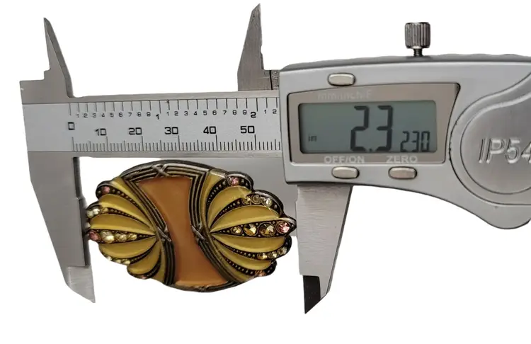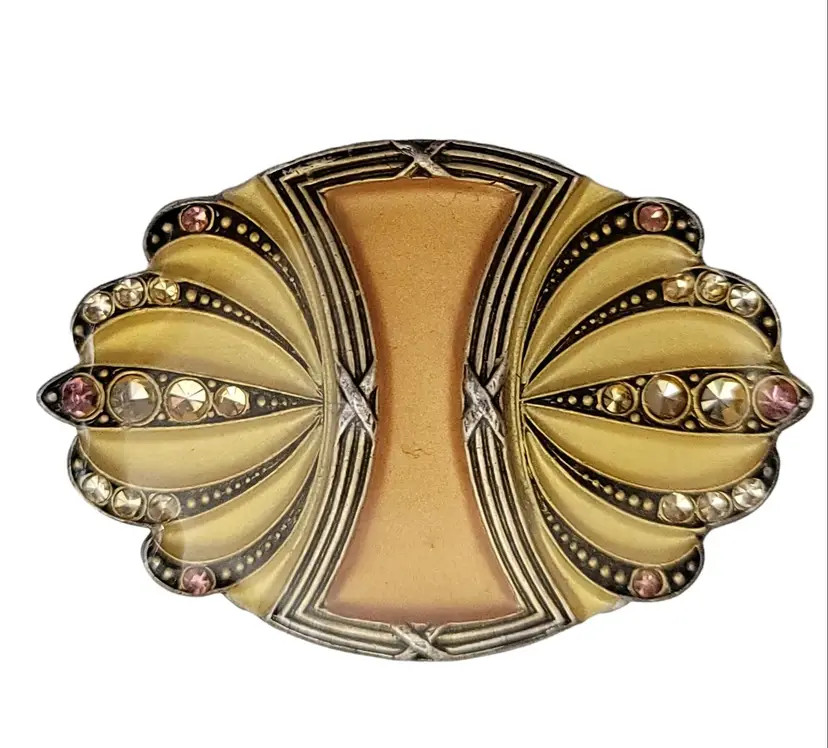 A stunning brooch in Bex style, an exquisite design. This vintage Catherine Popesco brooch features an enameled pale yellow with clear acrylic covering for a gleaming showpiece and is accented with clear faceted rhinestones on the black enamel parts. Measure approximately 2.3-inch wide and 1.5-inch high. The trombone clasp at the back functions properly.