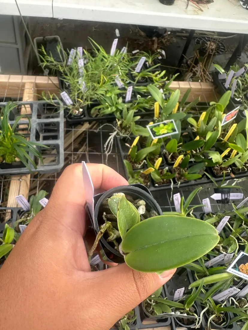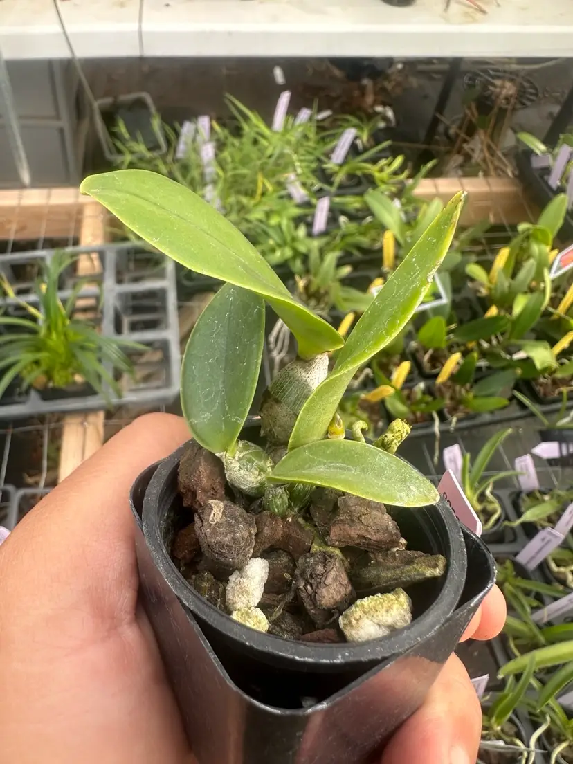 Plant is actively growing in orchid bark in a 2.5” pot. These starter plants are approximately two to three years away from their first bloom. This is a great way to add a one-of-a-kind bloom to your collection at a more affordable price.