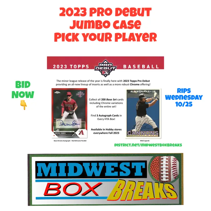You are bidding on all the cards of the player listed in the title in this JUMBO Case of 2023 Topps Pro Debut Baseball Cards. Case will be opened LIVE on Wednesday, 10/25/2023, at apx 10 PM Eastern / 7 PM Pacific. Opening will be viewable & simulcast on Midwest Box Break's District, Twitter, and YouTube. Shipping is $4.50 for your first auction spot won if you do not have open mail with MBB; any additional spots won are FREE. Any spot won where no cards of the player are found in the box will receive a sealed pack of Topps product. Any cards featuring multiple players will be assigned live between the spots depicted on the card.