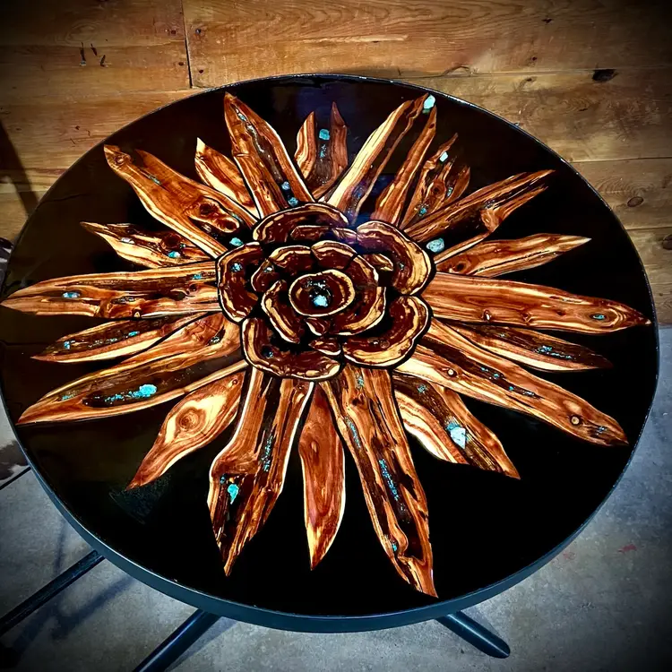 One of a kind, stunning mosaic table with custom metal base. The hand-pieced flower mosaic is made from dead standing Western Red Cedar, inlaid with turquoise and chrysocolla. Designed with a black epoxy resin background for a dramatic background, but also clear epoxy windows down into the natural cavities of the wood itself.