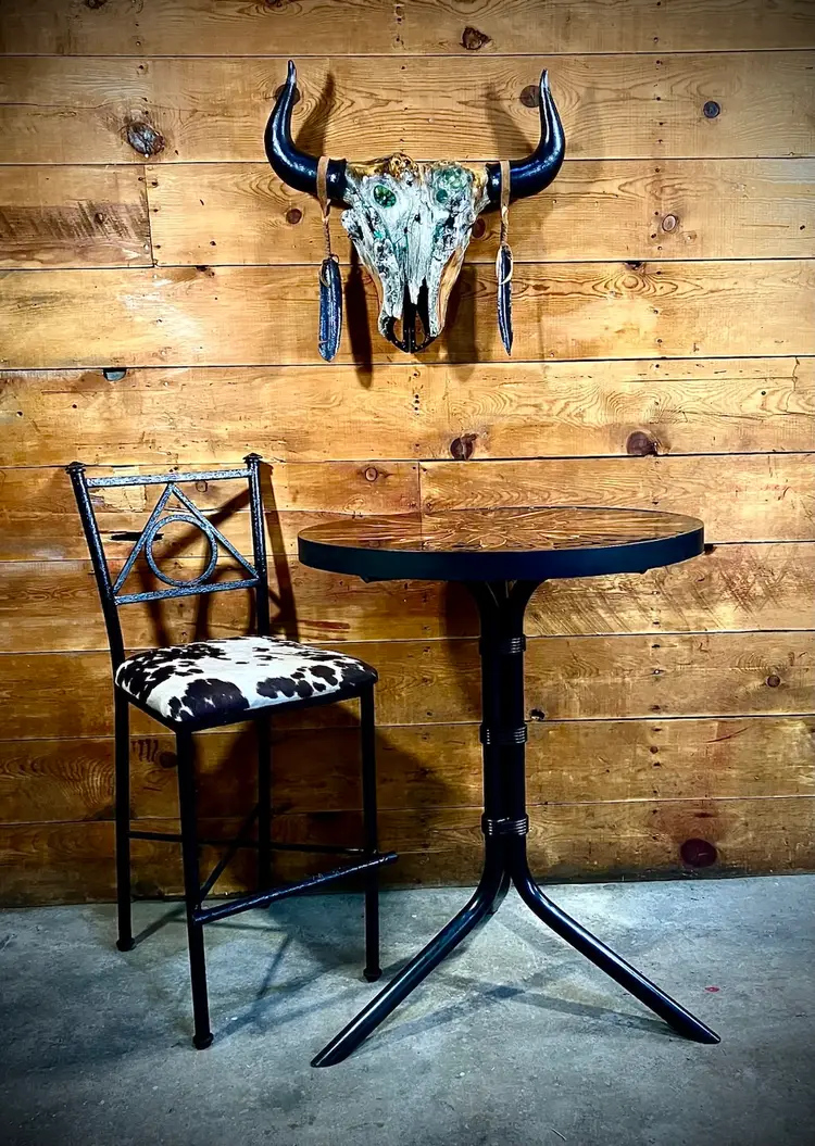 The base was designed and built by our master blacksmith here at Twisted Tree Forge, and it is a stable and stunning piece of craftsmanship in its own right. I use only USA made, food safe epoxy resin in my furnishings and fine art. This table is an eye catcher!