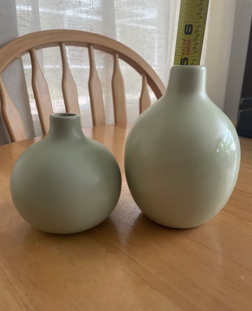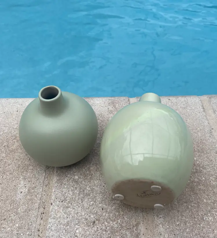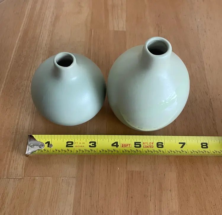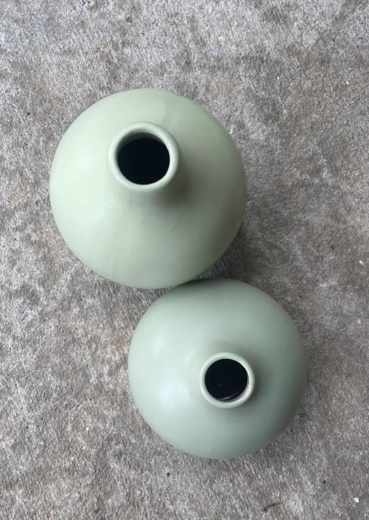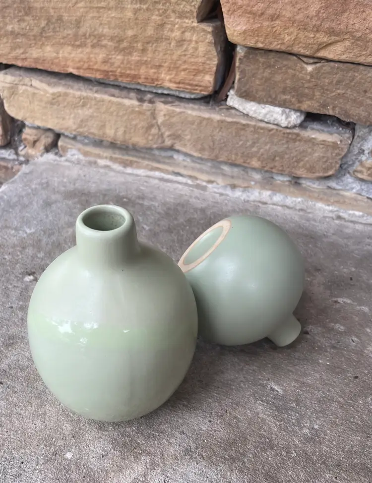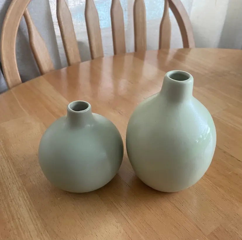 Pretty little pair of celadon bud vases--one matte, one with a glossy stripe. Very cute as a duo.