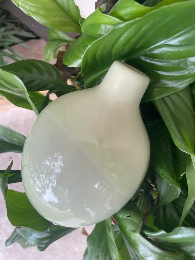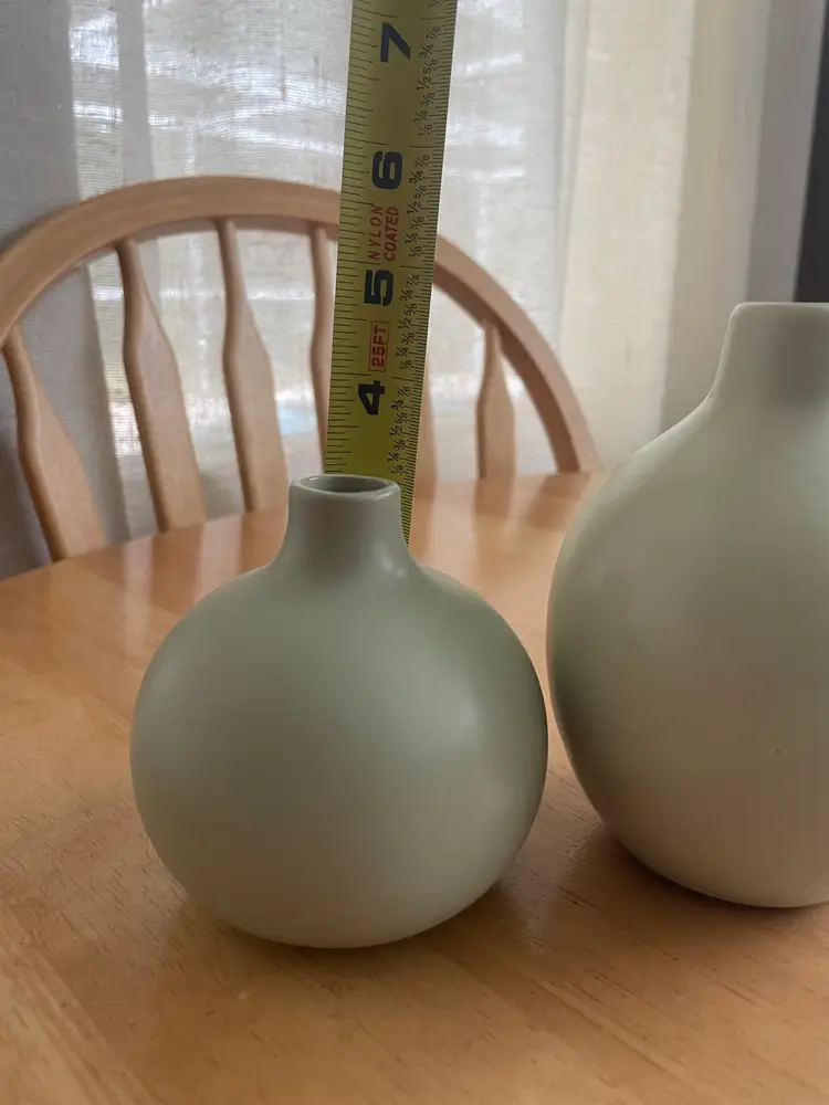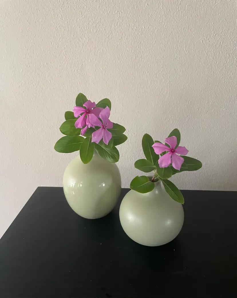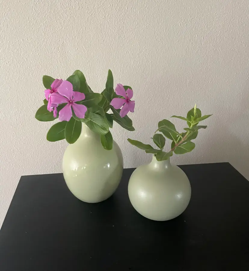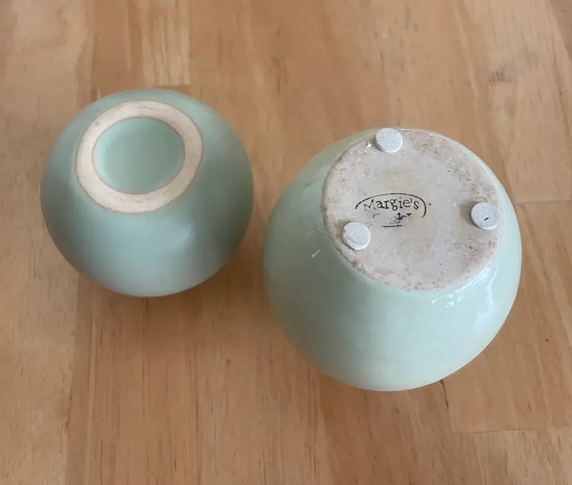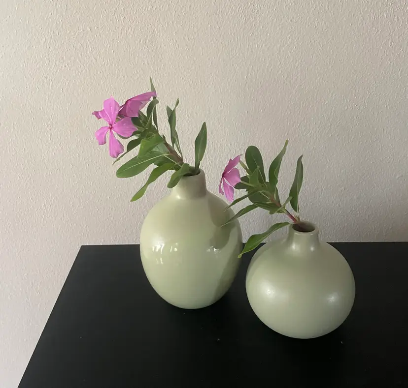 Pretty little pair of celadon bud vases--one matte, one with a glossy stripe. Very cute as a duo.