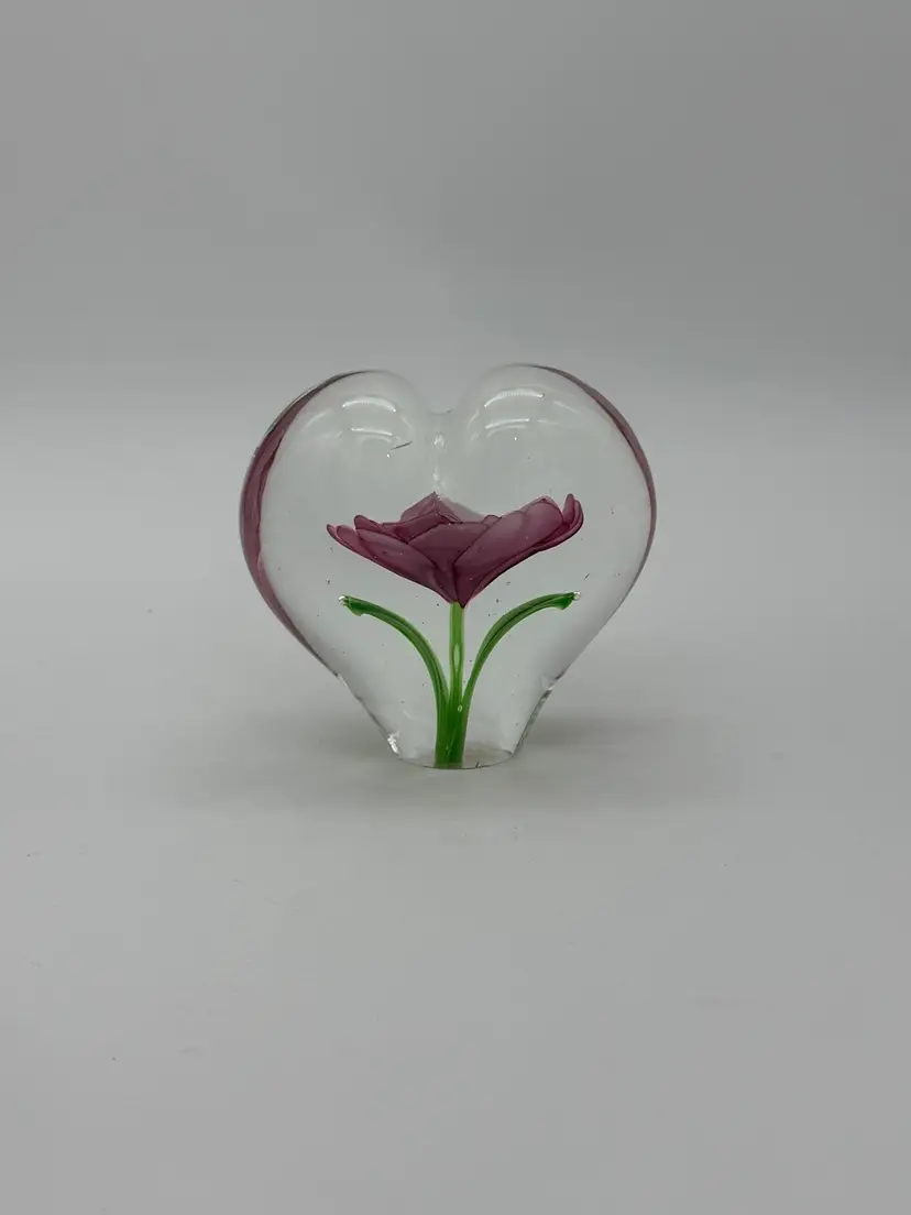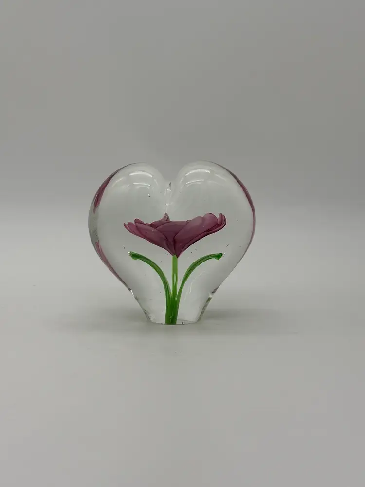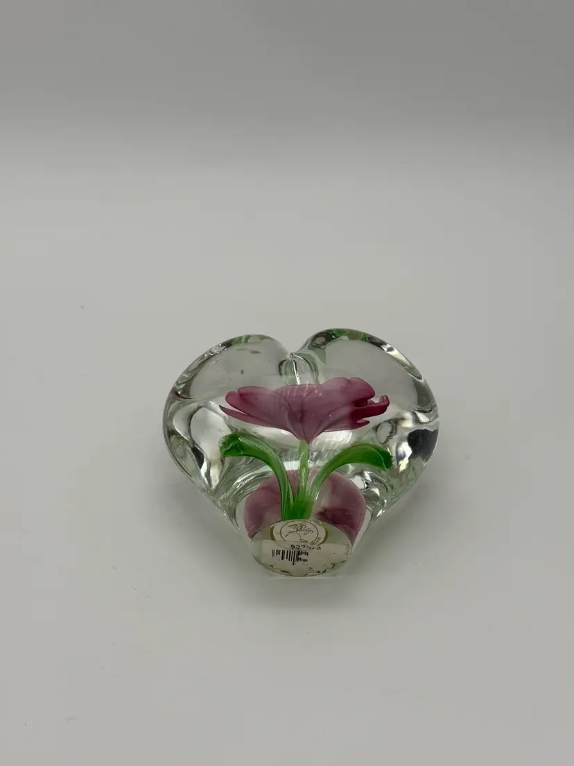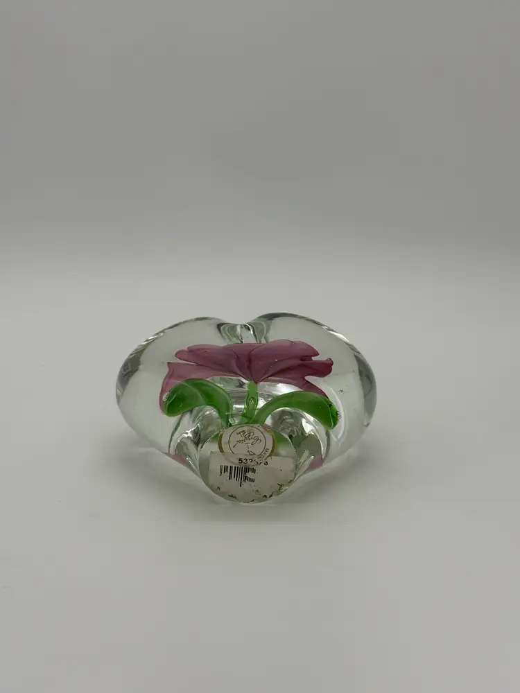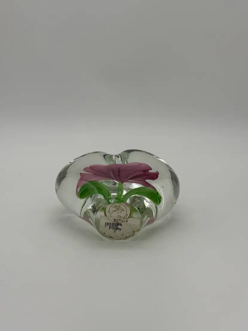 The Celebrations Royal Pink Flower Heart Shape Crystal Glass Paperweight is a beautifully crafted piece that showcases a 3-D flower pattern with controlled bubbles, creating a whimsical and decorative design. This hand-blown art glass paperweight features a contemporary style with a shiny finish, and is in excellent condition, making it a stunning addition to any decor. The intricate details of the pink, clear, and green leafy colors add a touch of elegance, while the brand's original design captures the theme of love and beauty. Made in China, this unique and vintage piece is sure to be a cherished item for any flower lover or collector. Measures to be 4” X 4”