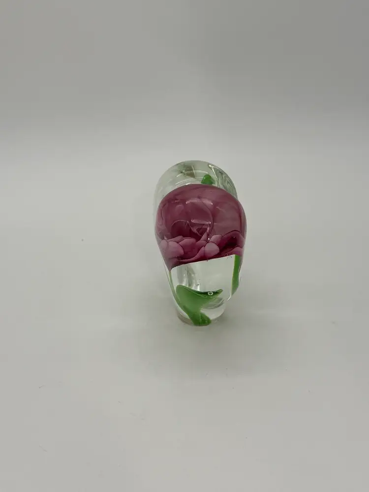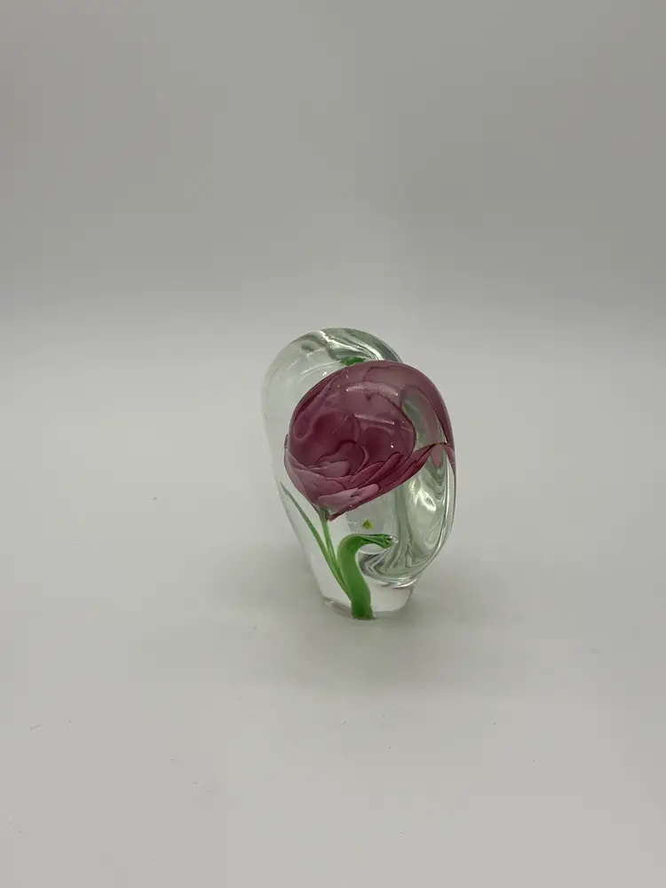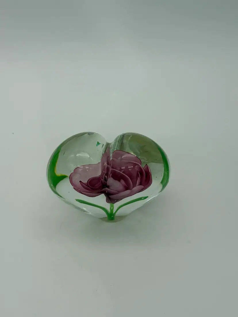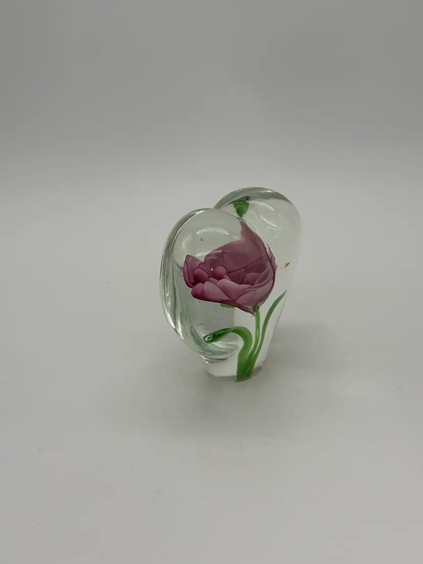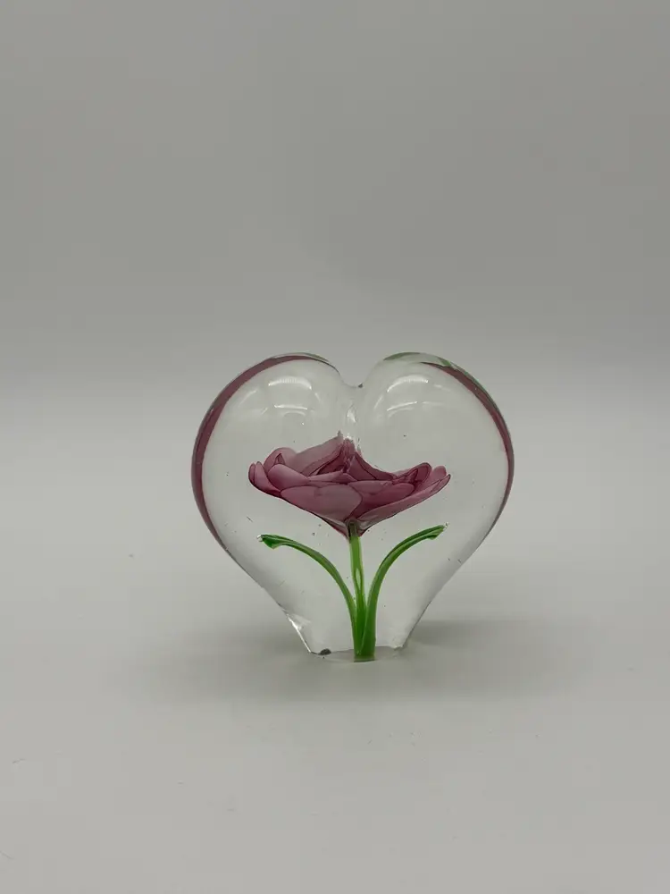 The Celebrations Royal Pink Flower Heart Shape Crystal Glass Paperweight is a beautifully crafted piece that showcases a 3-D flower pattern with controlled bubbles, creating a whimsical and decorative design. This hand-blown art glass paperweight features a contemporary style with a shiny finish, and is in excellent condition, making it a stunning addition to any decor. The intricate details of the pink, clear, and green leafy colors add a touch of elegance, while the brand's original design captures the theme of love and beauty. Made in China, this unique and vintage piece is sure to be a cherished item for any flower lover or collector. Measures to be 4” X 4”