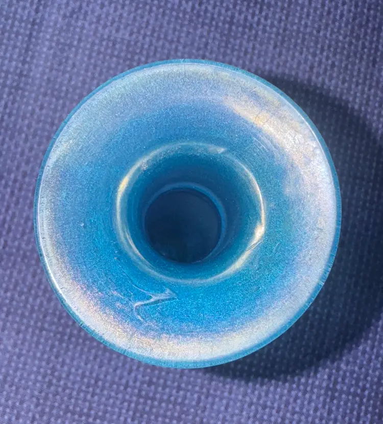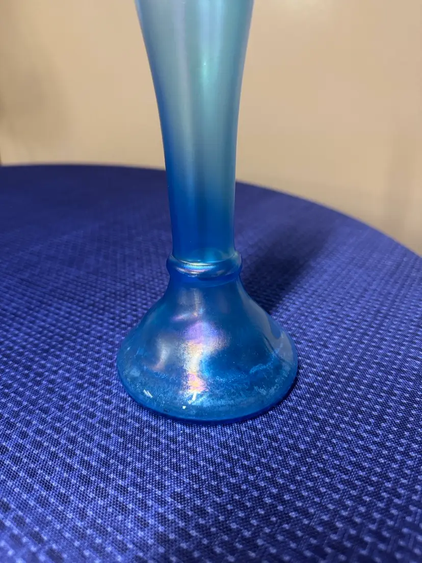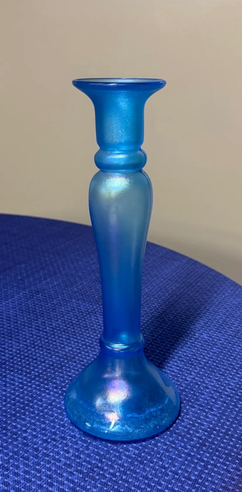 Elegant iridescent blue glass candle holder. Perfect for home decor. GLASS CELESTE BLUE STRETCH GLASS CANDLESTICKS Vintage Vases Can be used as a candlestick or a bud vase 9.5” tall Excellent condition with no breaks or chips there are some water stains in the bottom (1095108255)