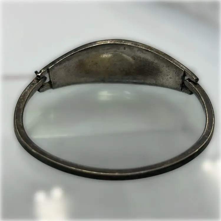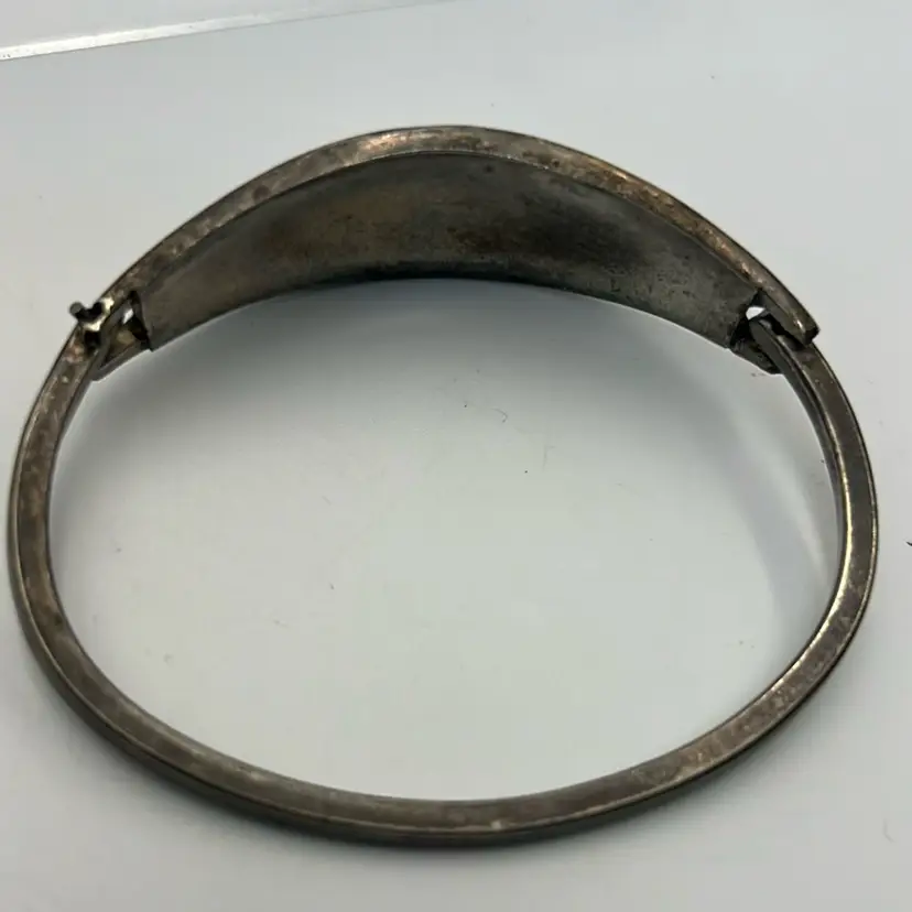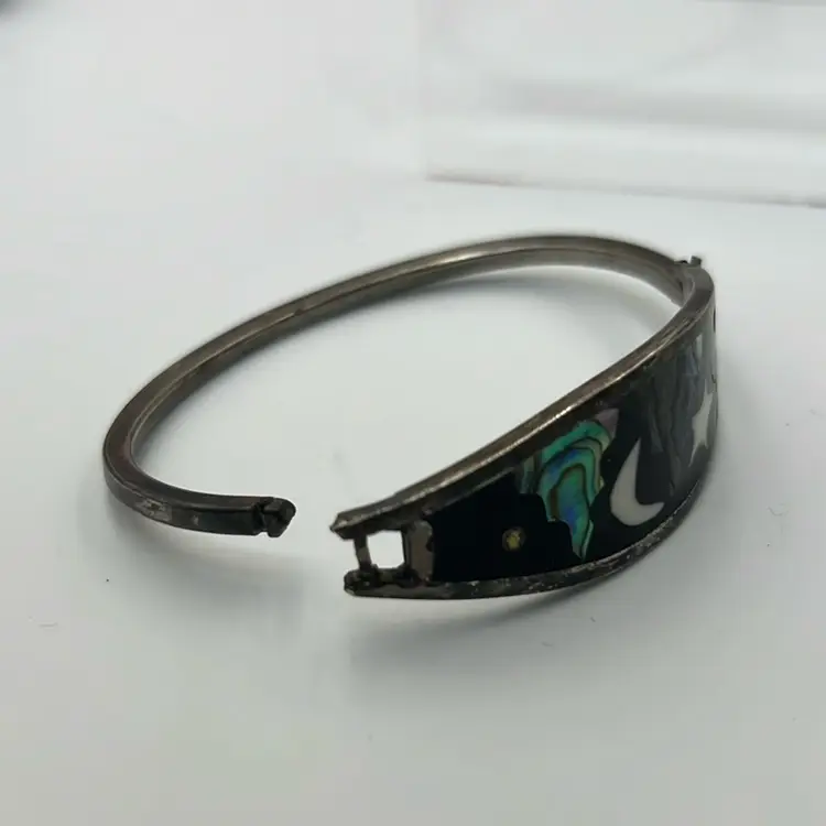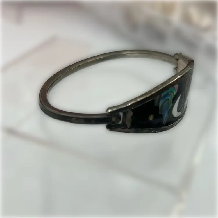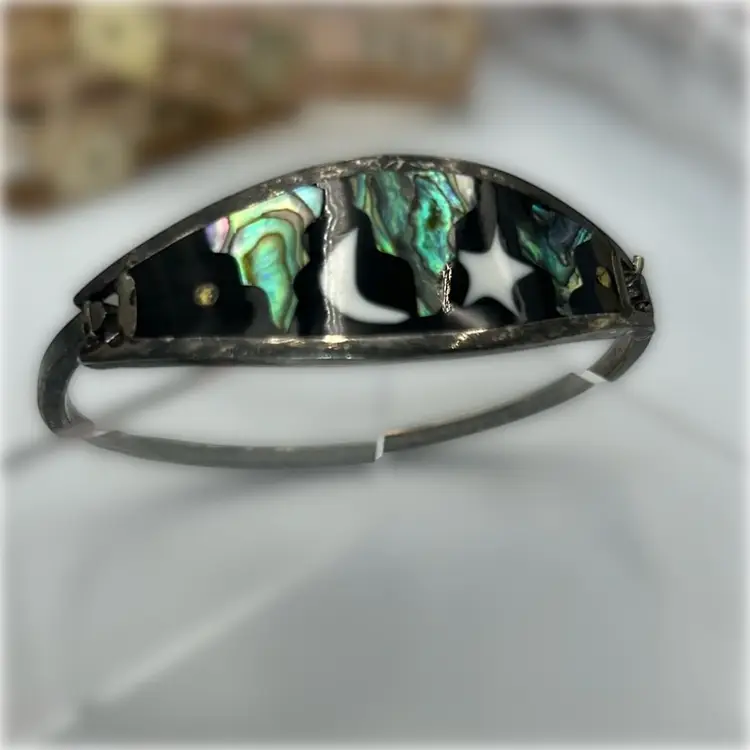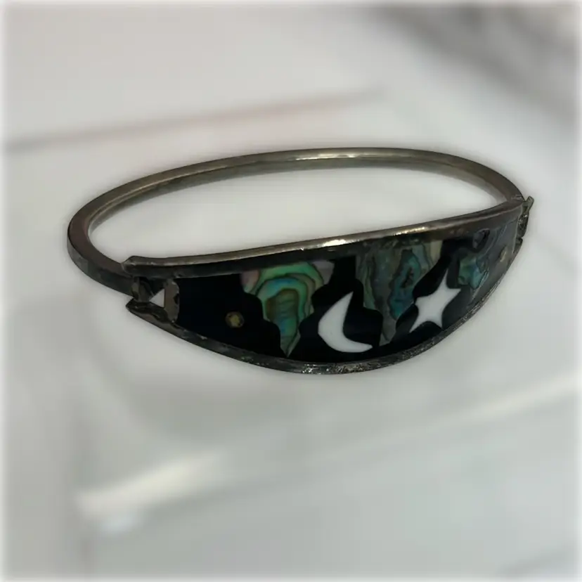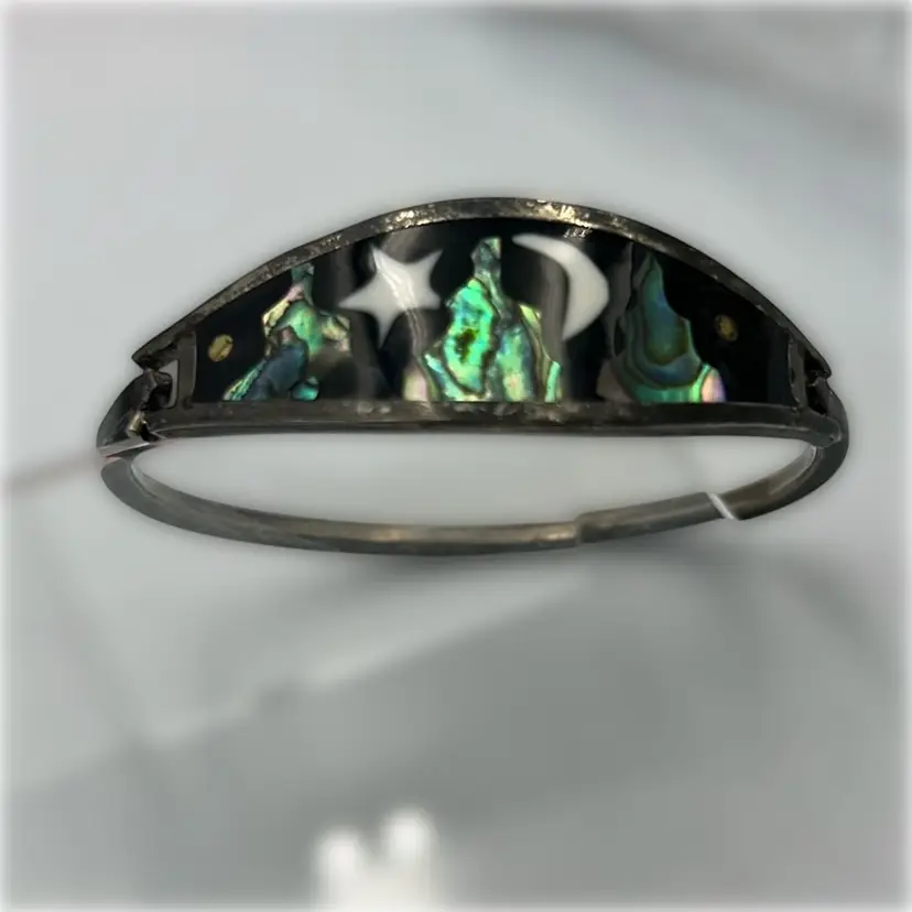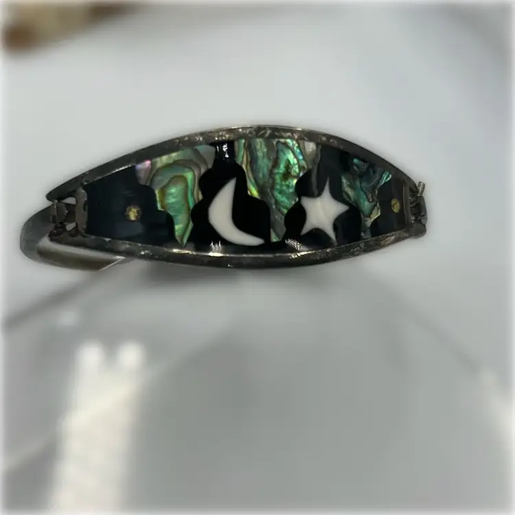 I see the abalone as mountains with star and moon in between! Alpaca is a silver tone metal alloy of copper, nickel and zinc. Vintage, bohemian.