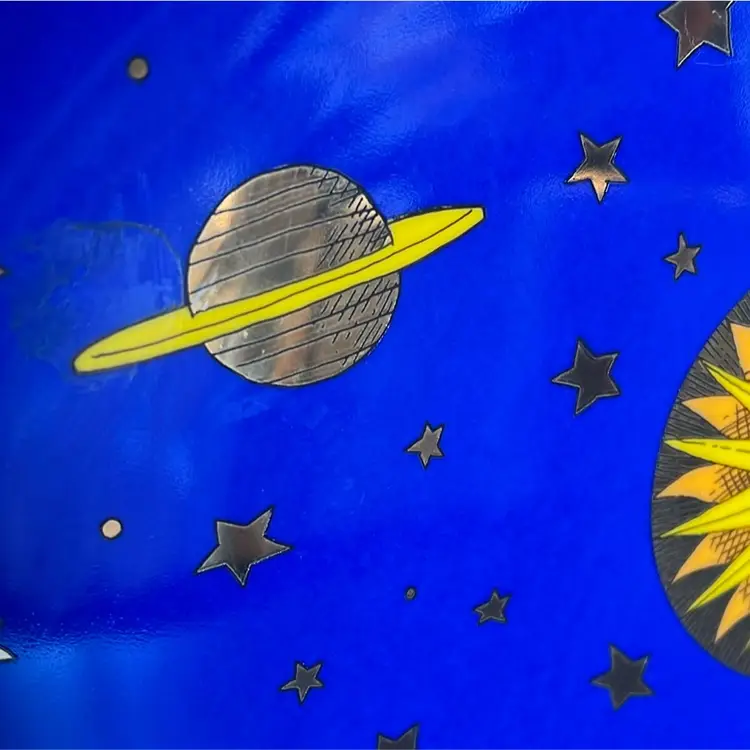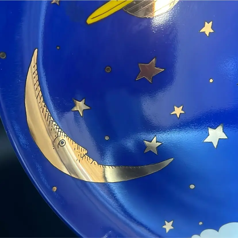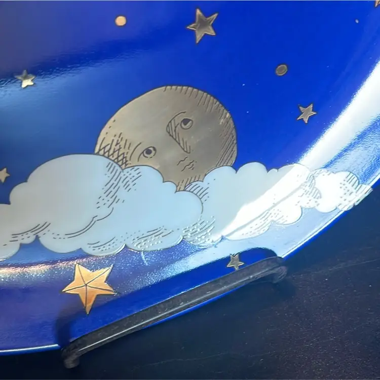 The plate is dark blue with a gold sun, moon, a planet & stars as well as white clouds