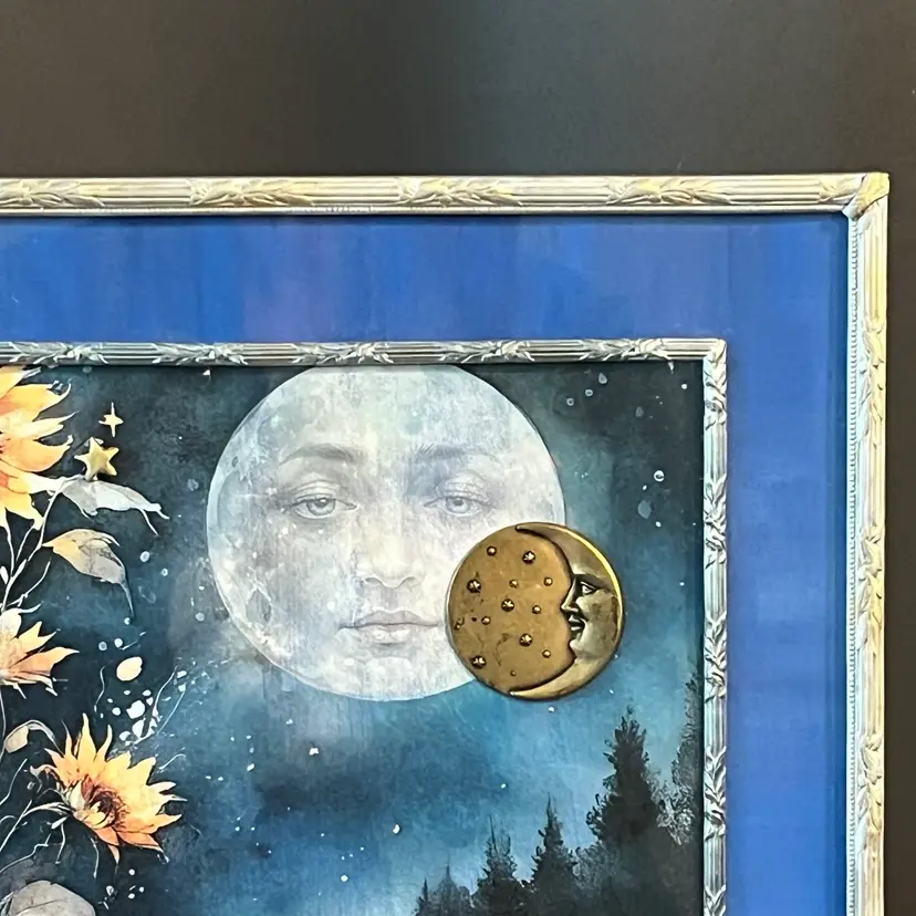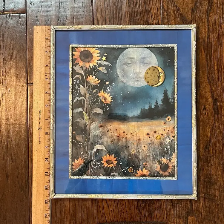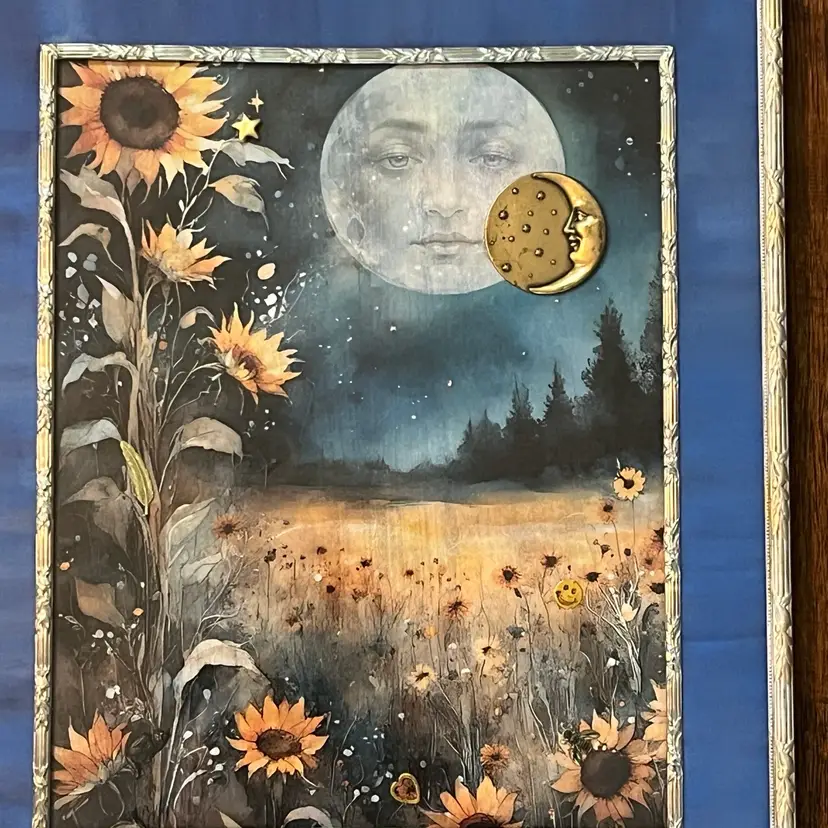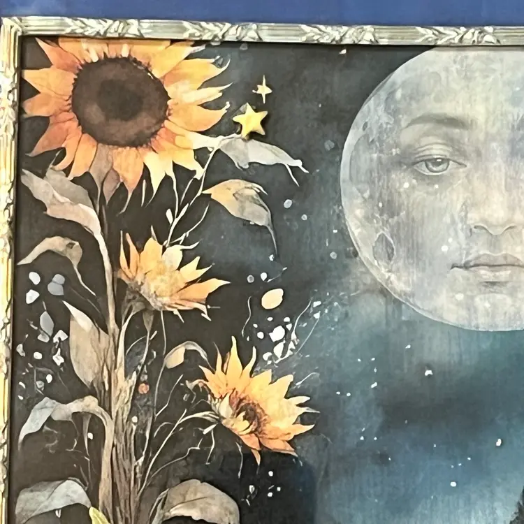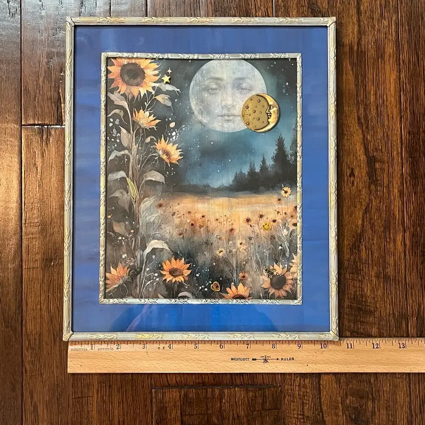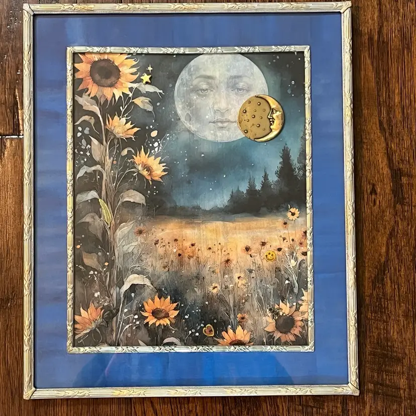 Repurposed a 1950s metal frame, re-silvered & upgraded the gold accents. Original back was broken, so included is a tabletop stand. I painted the linen fabric blue and added a Rice Paper Print of the moon and sunflowers.