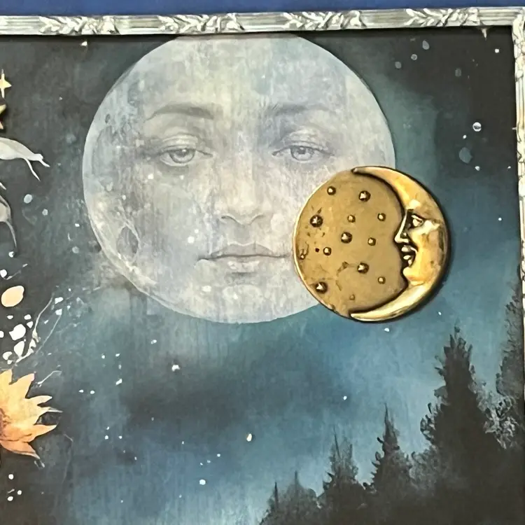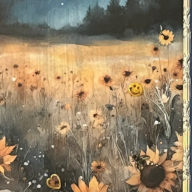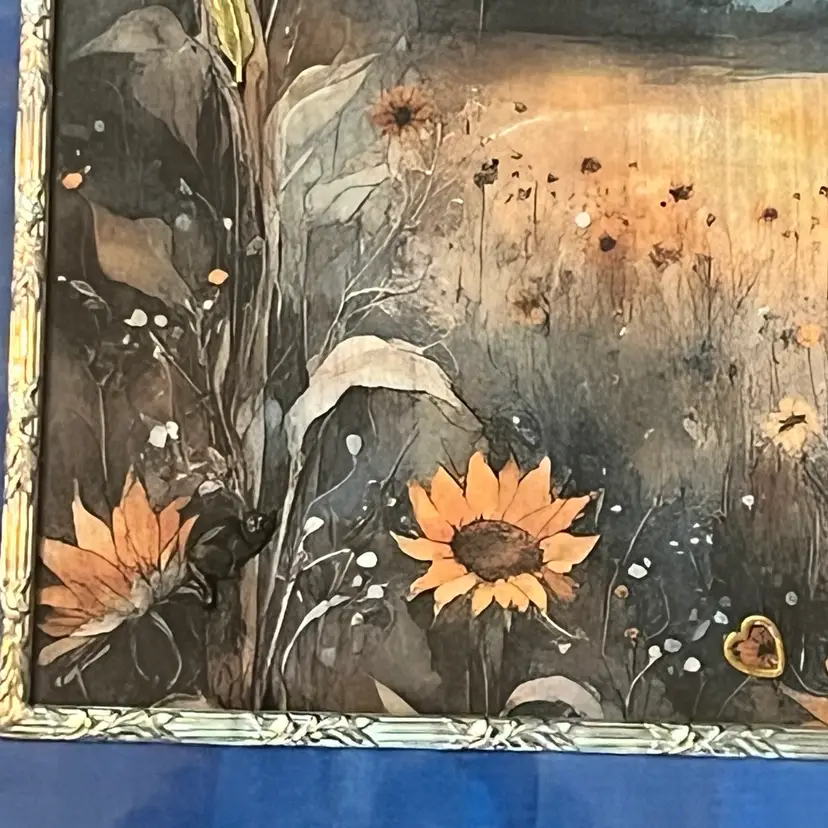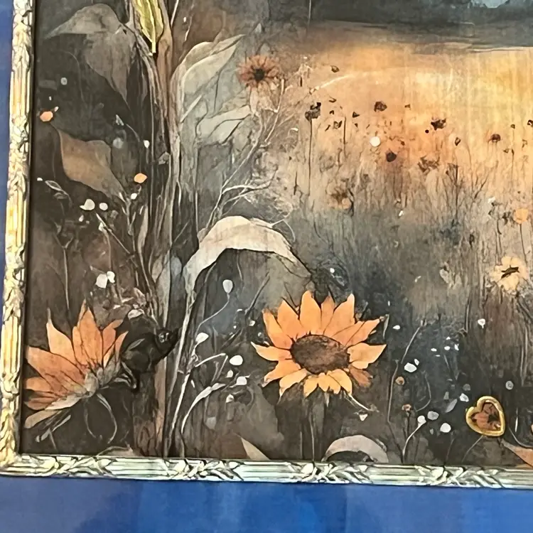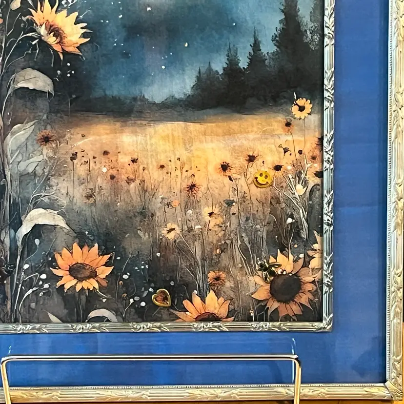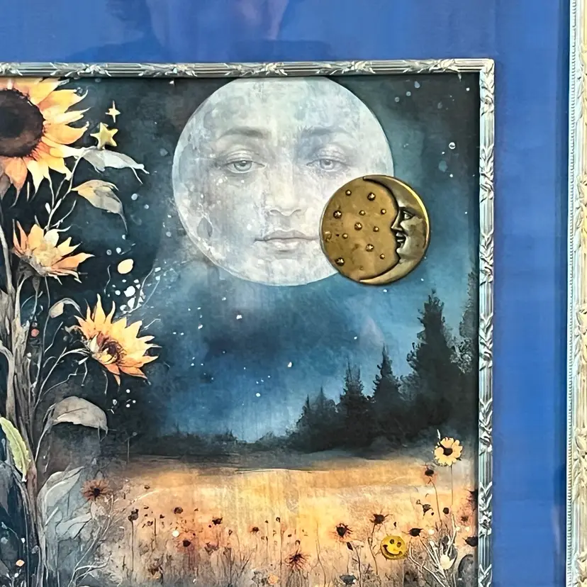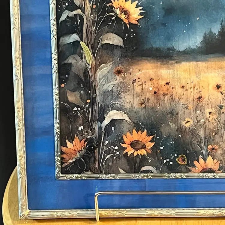 Repurposed a 1950s metal frame, re-silvered & upgraded the gold accents. Original back was broken, so included is a tabletop stand. I painted the linen fabric blue and added a Rice Paper Print of the moon and sunflowers.