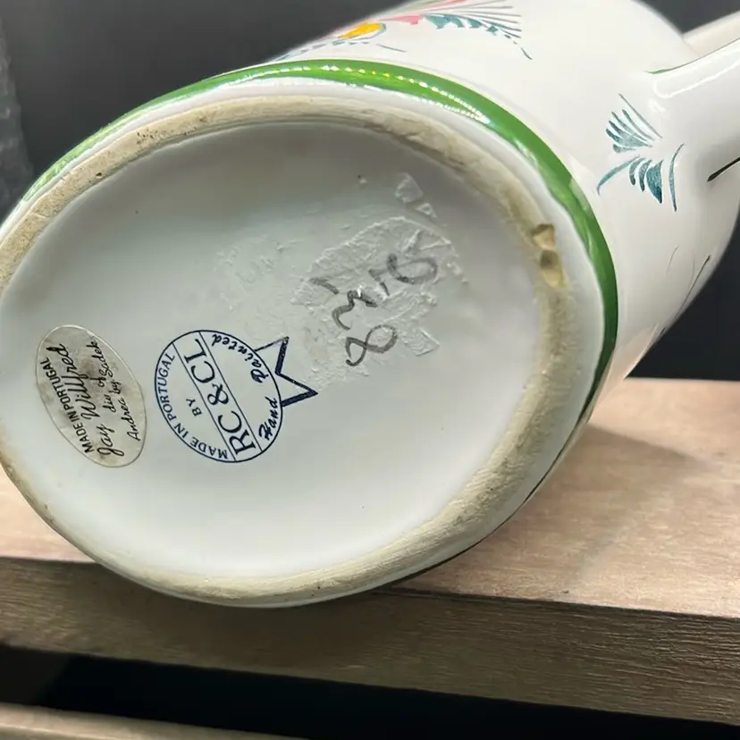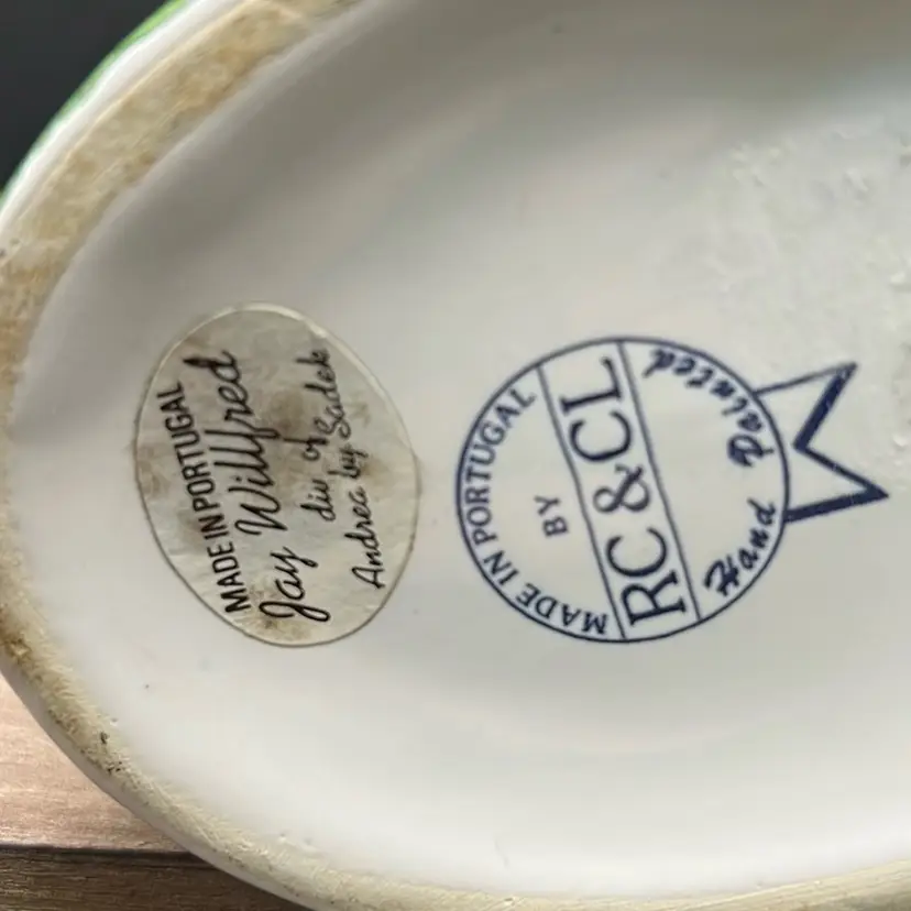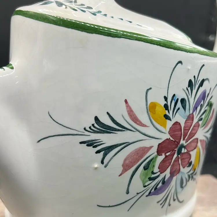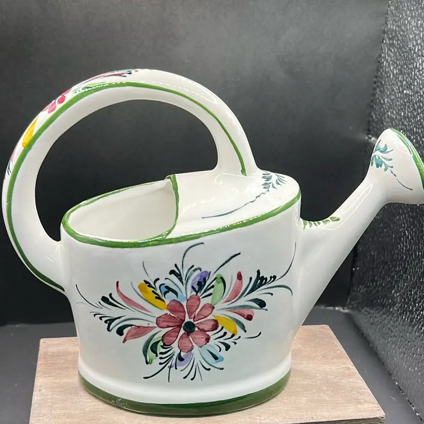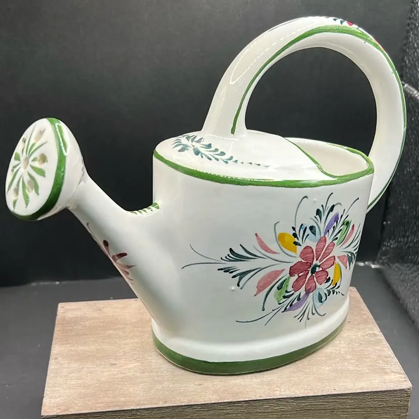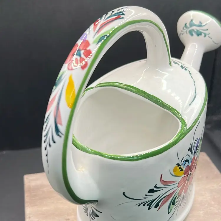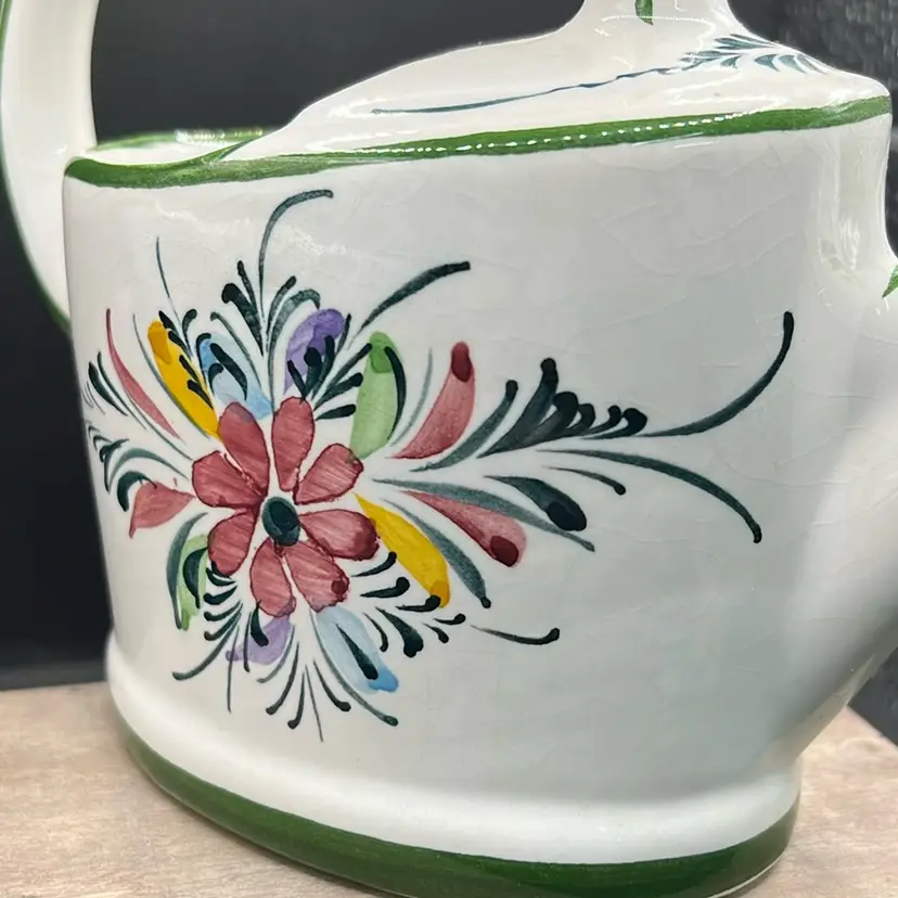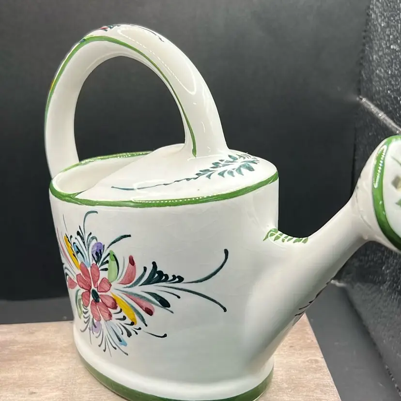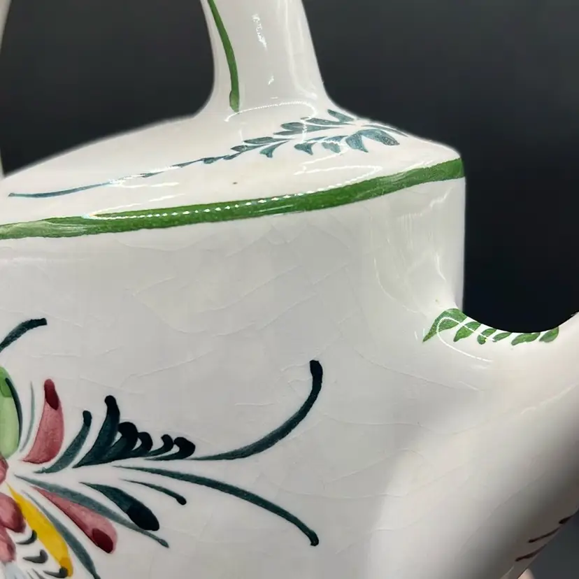 Ceramic Andrea Safely Watering Pitcher, Hand Painted In Portugal 6.5” Tall, 8”long Good condition, see photos for details, chip on very bottom… not visible, no cracks . Minor crazing.